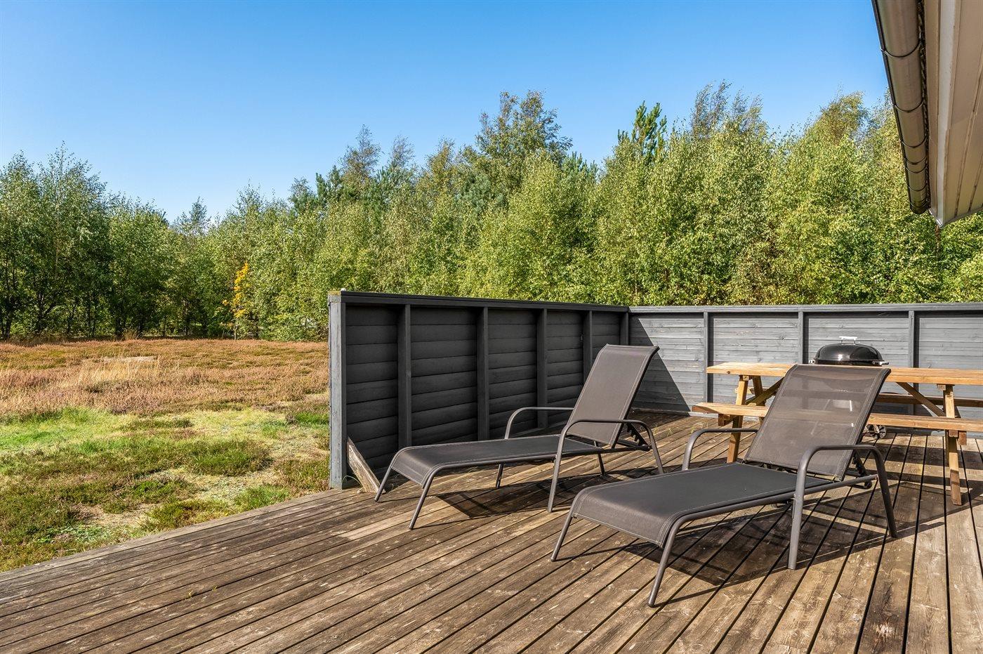 Ferieboligen er beliggende på en 1500 m² stor havegrund. naturgrund. Der er 300 m til havet. Nærmeste forretning er beliggende i en afstand af 700 m. Der er en golfbane i en afstand af 2500 m. Til ferieboligen hører 52 m² terrasseareal. Der er redskabsrum. Der er carport til rådighed. Der er installeret stik til opladning af elbil. Parkering ved ferieboligen.