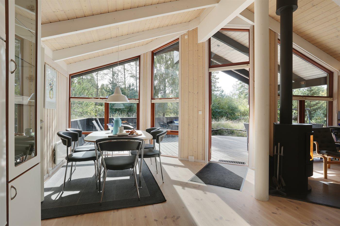 Smukt feriehus på Læsø med moderne køkken, brændeovn og stor naturgrund tæt på havet.