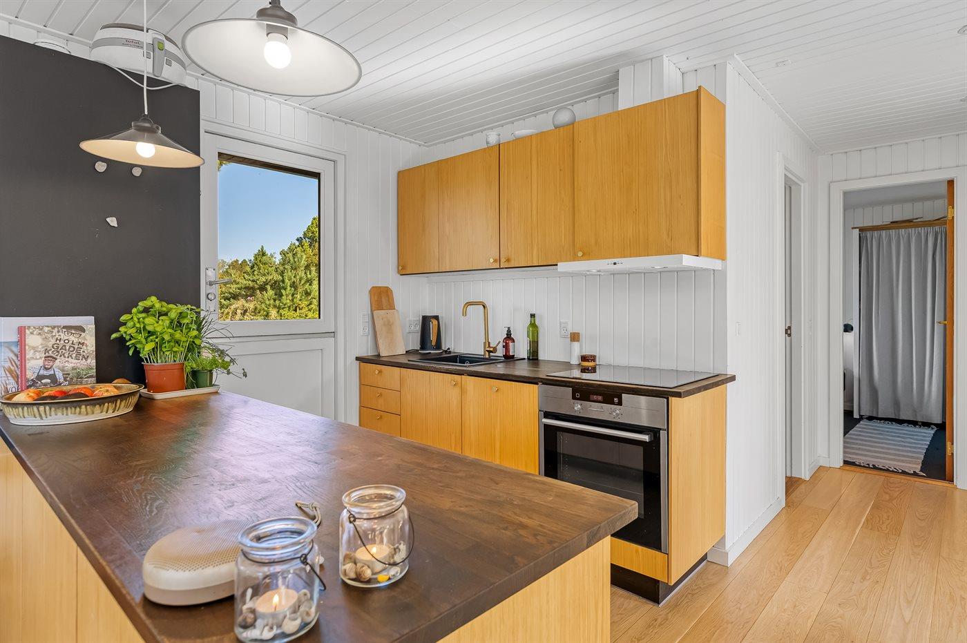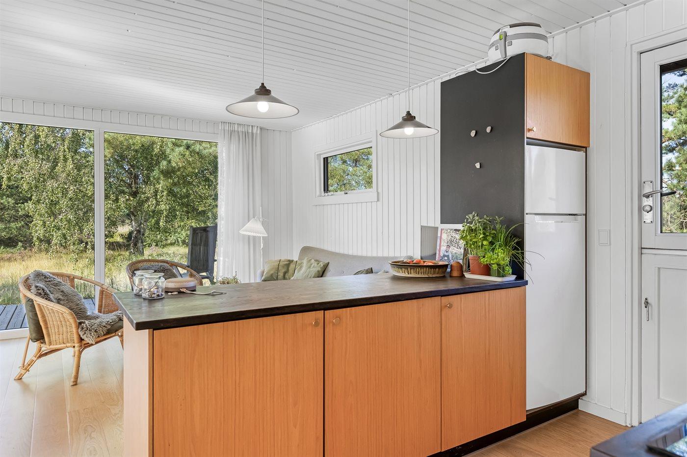 Køkkenet er udstyret med 1 køleskab. Der er 4 keramiske kogeplader, varmluftovn, mikrobølgeovn.