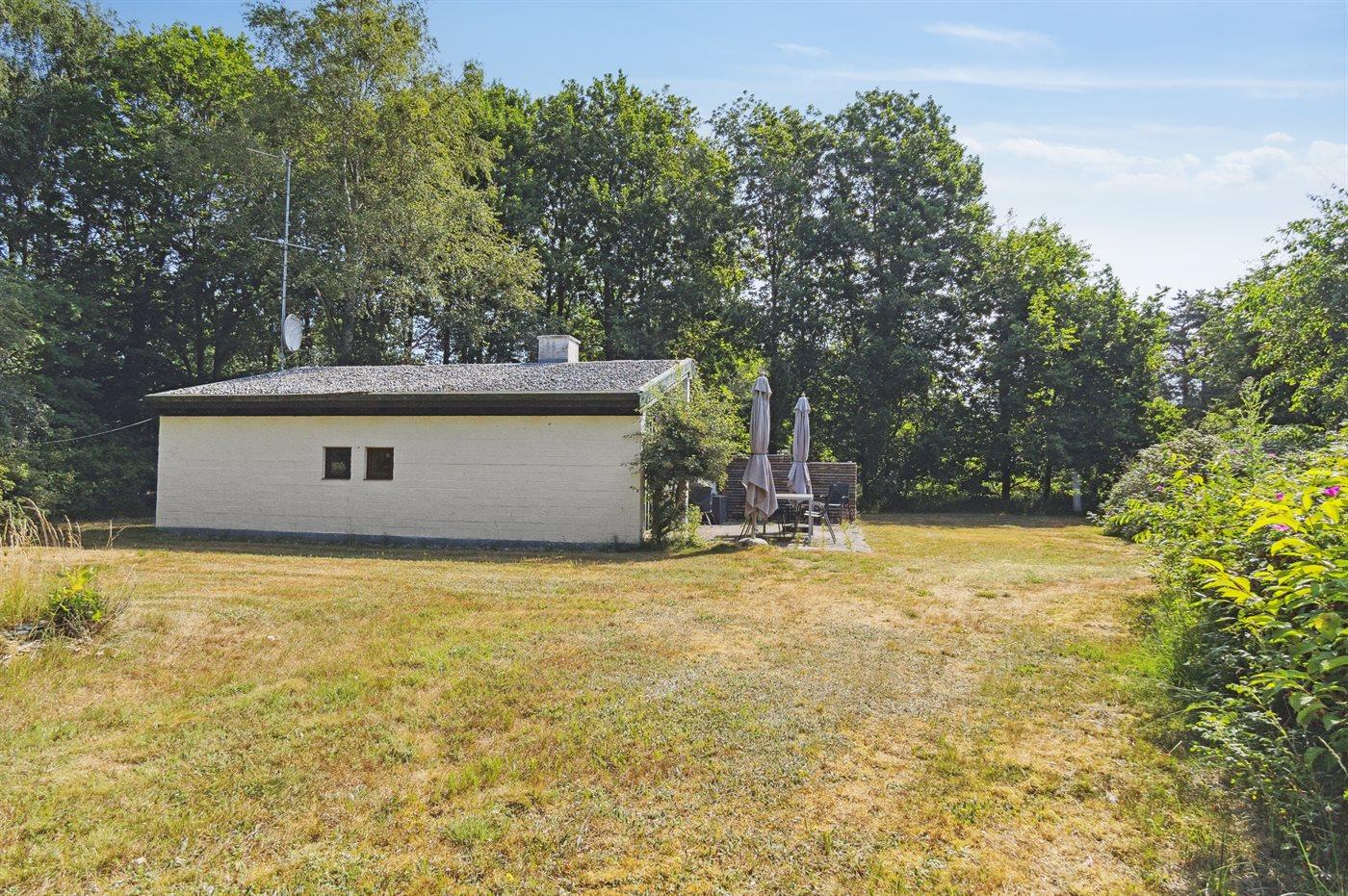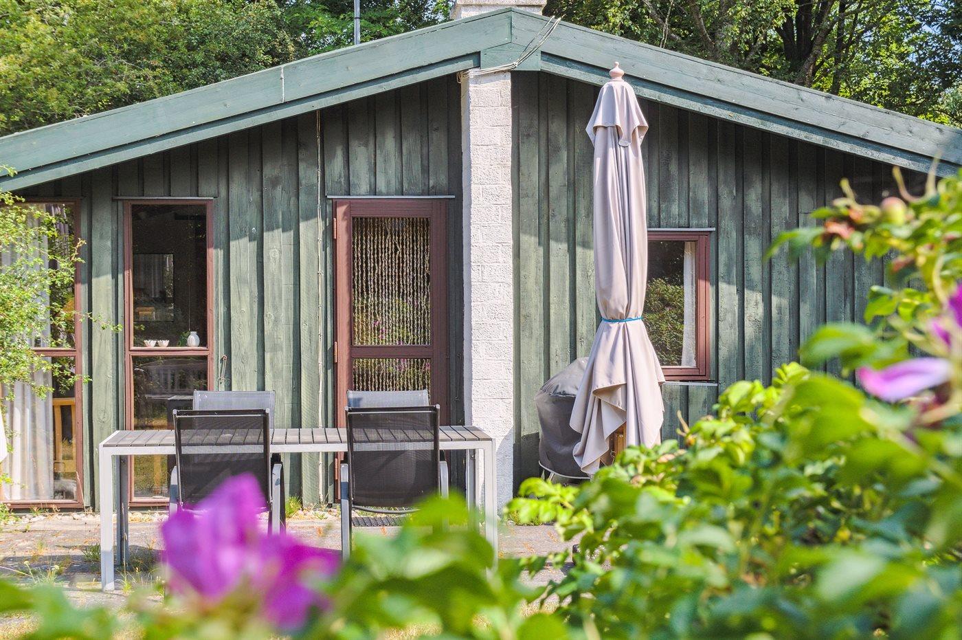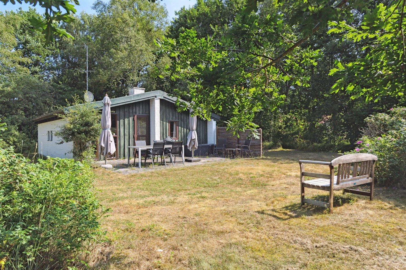 Hyggeligt feriehus med rolig ugenert beliggenhed på flot stor lukket græs-naturgrund.