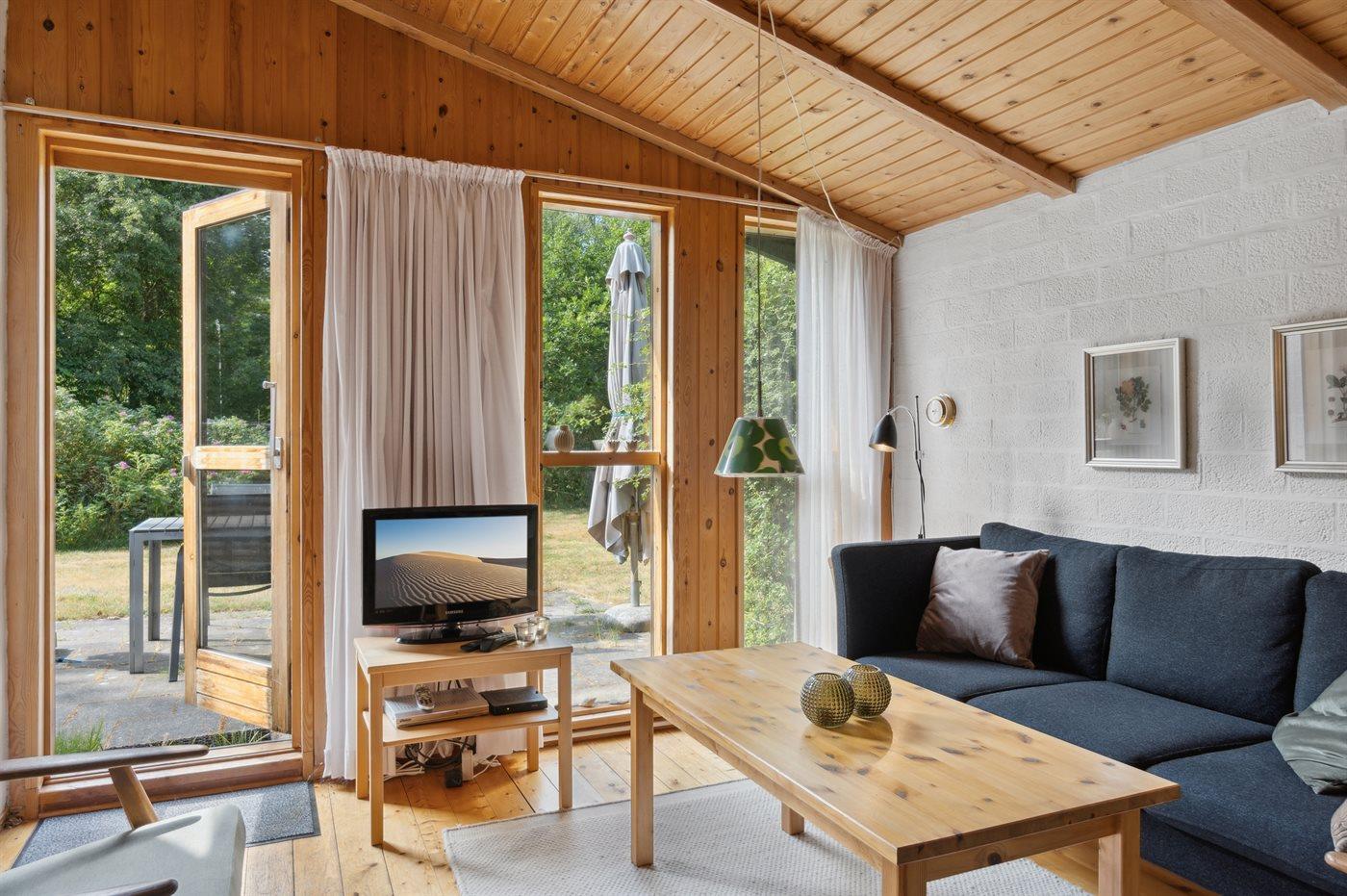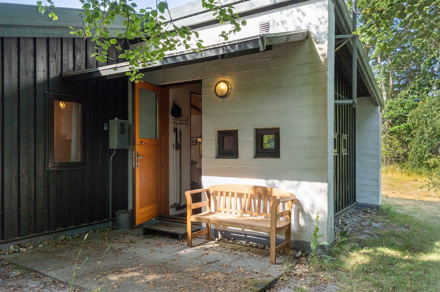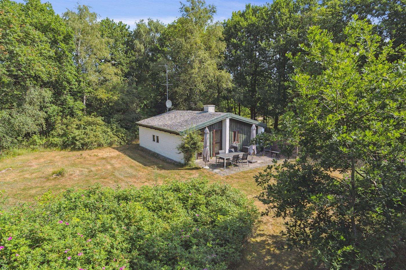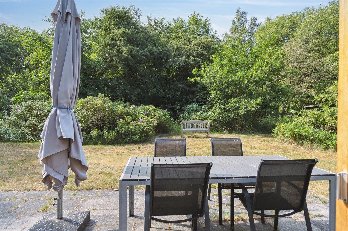 Hyggeligt feriehus med rolig ugenert beliggenhed på flot stor lukket græs-naturgrund.