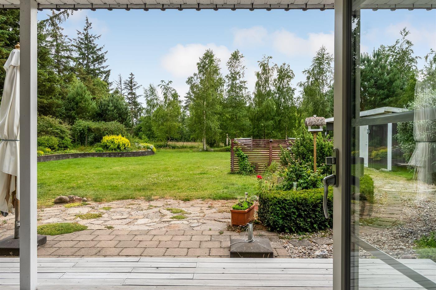 Ferieboligen er beliggende på en 2039 m² stor havegrund. Grunden er indhegnet. Der er 800 m til havet. Nærmeste forretning er beliggende i en afstand af 1400 m. Der er en golfbane i en afstand af 7200 m. Til ferieboligen hører åbent terrasseareal. Desuden er der overdækket terrasse. Ligeledes er der adgang til udestue. Der ligger en legeplads i en afstand af 1400 m. Udendørs bruser. Grill til rådighed. Der er carport til rådighed. Der er installeret stik til opladning af elbil. CEE stik. Med 11 kW ladeeffekt. Parkering ved ferieboligen.