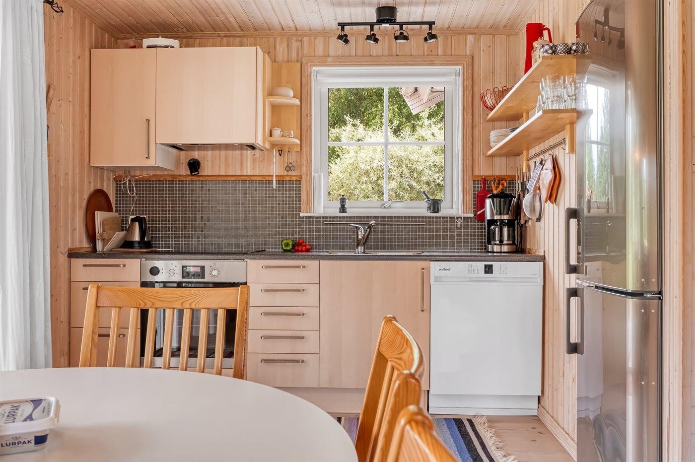 Køkkenet er udstyret med 1 køleskab. Der er 4 elkogeplader, varmluftovn samt opvaskemaskine.