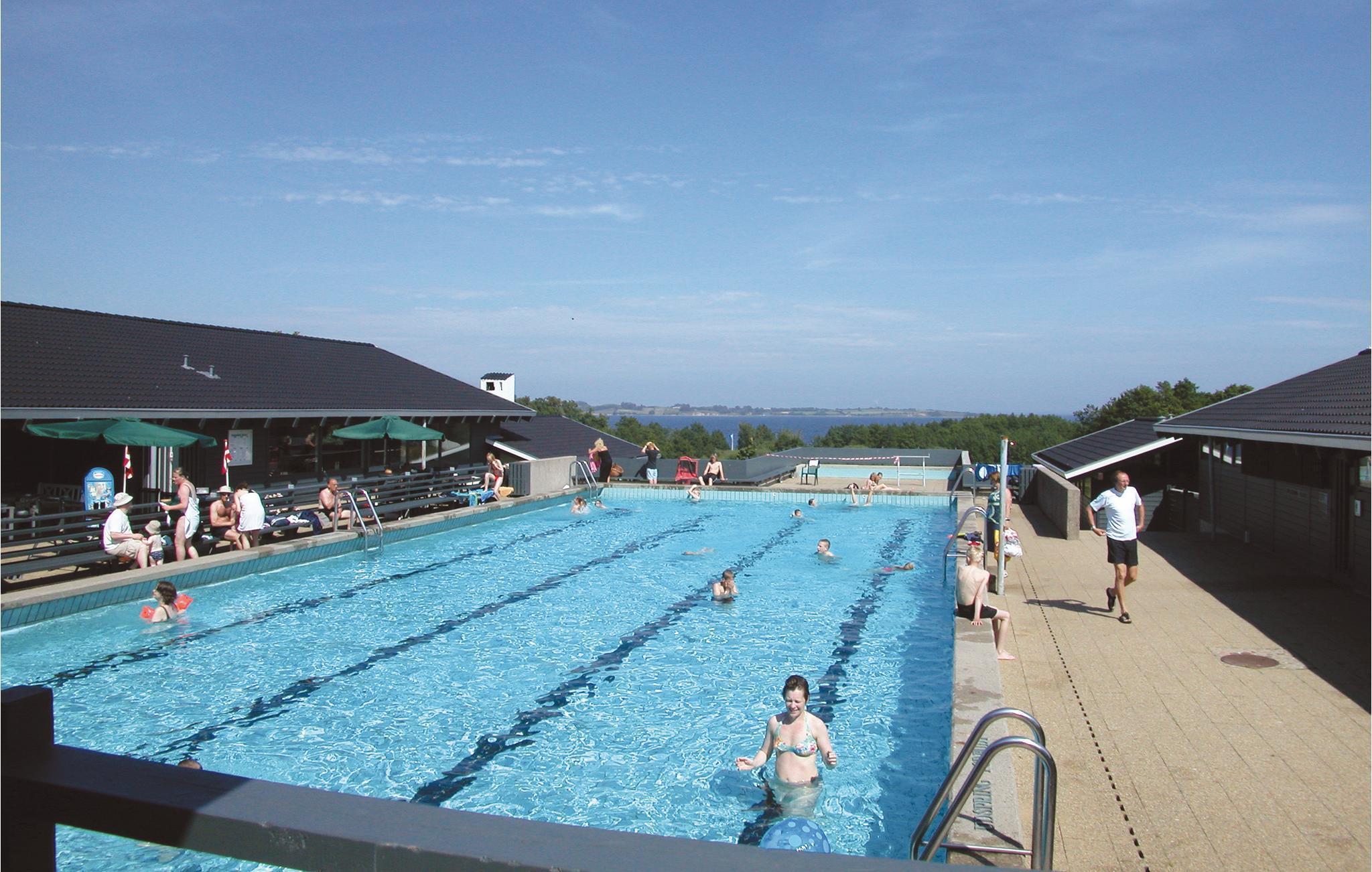 Feriehus ved Løjt Strand med panoramaudsigt, terrasse, pool og nærhed til børnevenlig sandstrand.