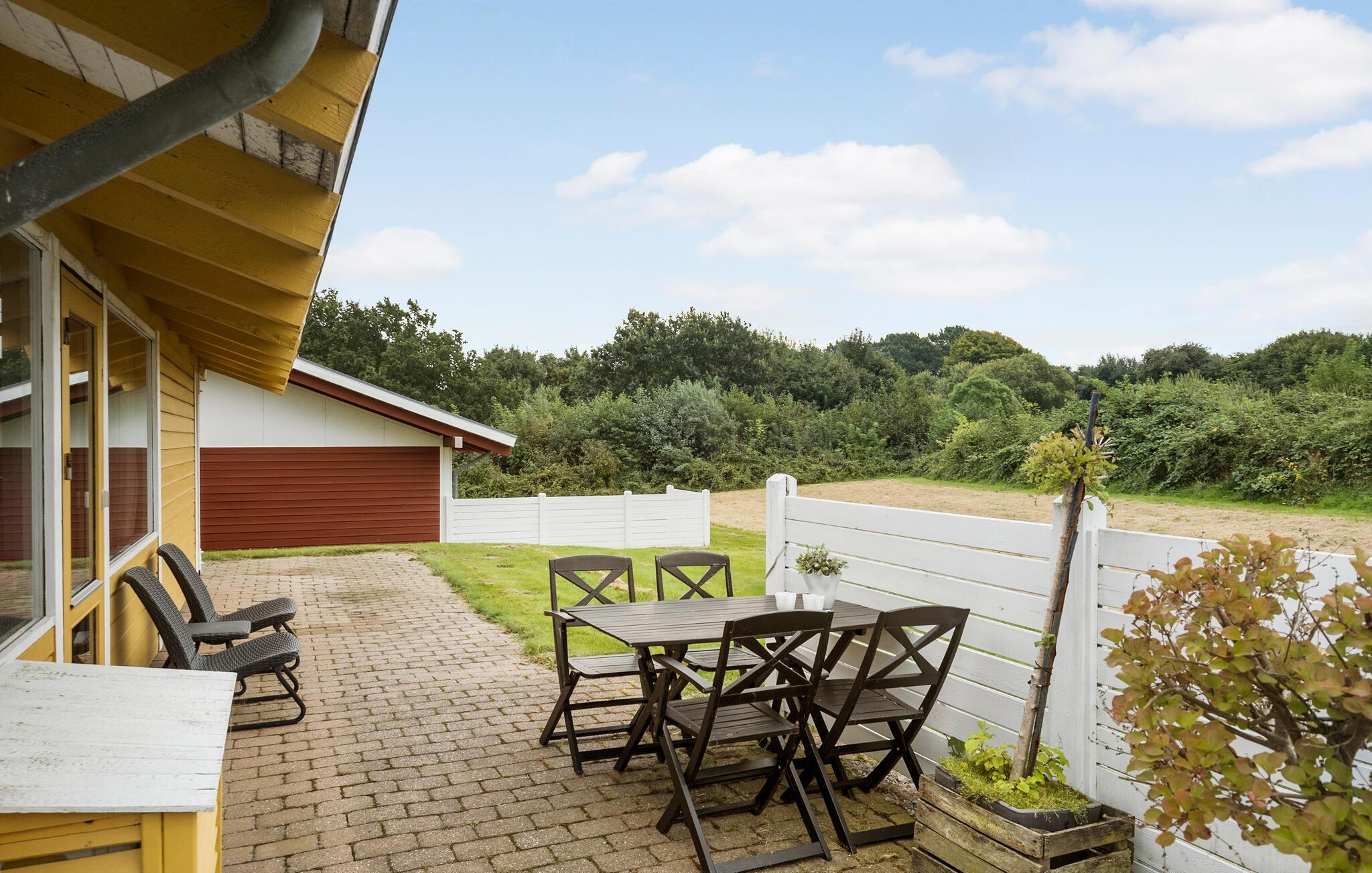 Huset ligger på en åben grund med god plads til at lege og spille fodbold. Tænd op i grillen på en sommeraften og nyd tonerne af fuglefløjt fra trætoppene.