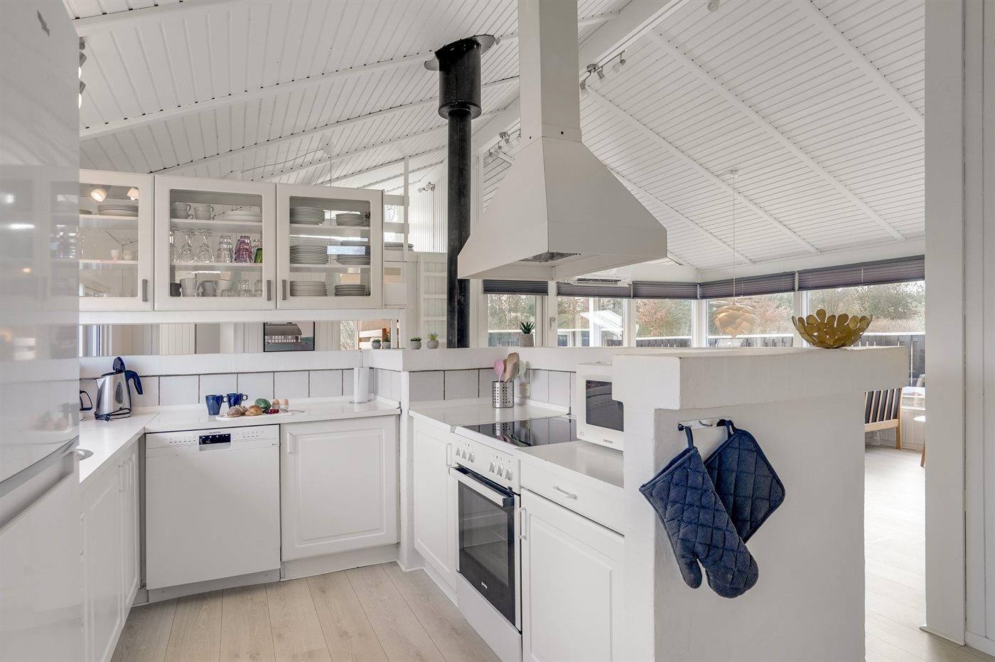Køkkenet er udstyret med 1 køleskab. Der er 4 keramiske kogeplader, varmluftovn, mikrobølgeovn samt opvaskemaskine.