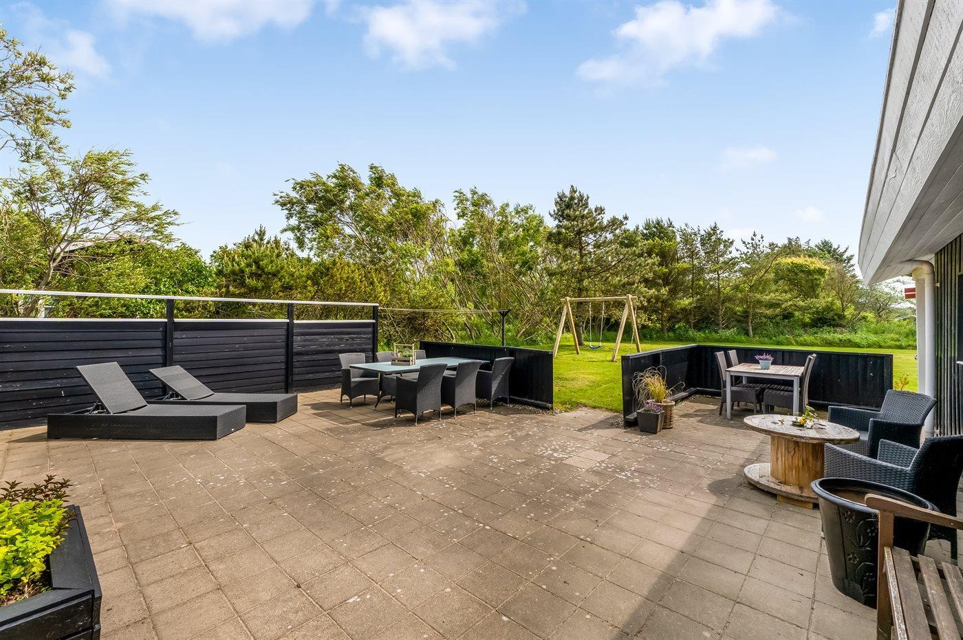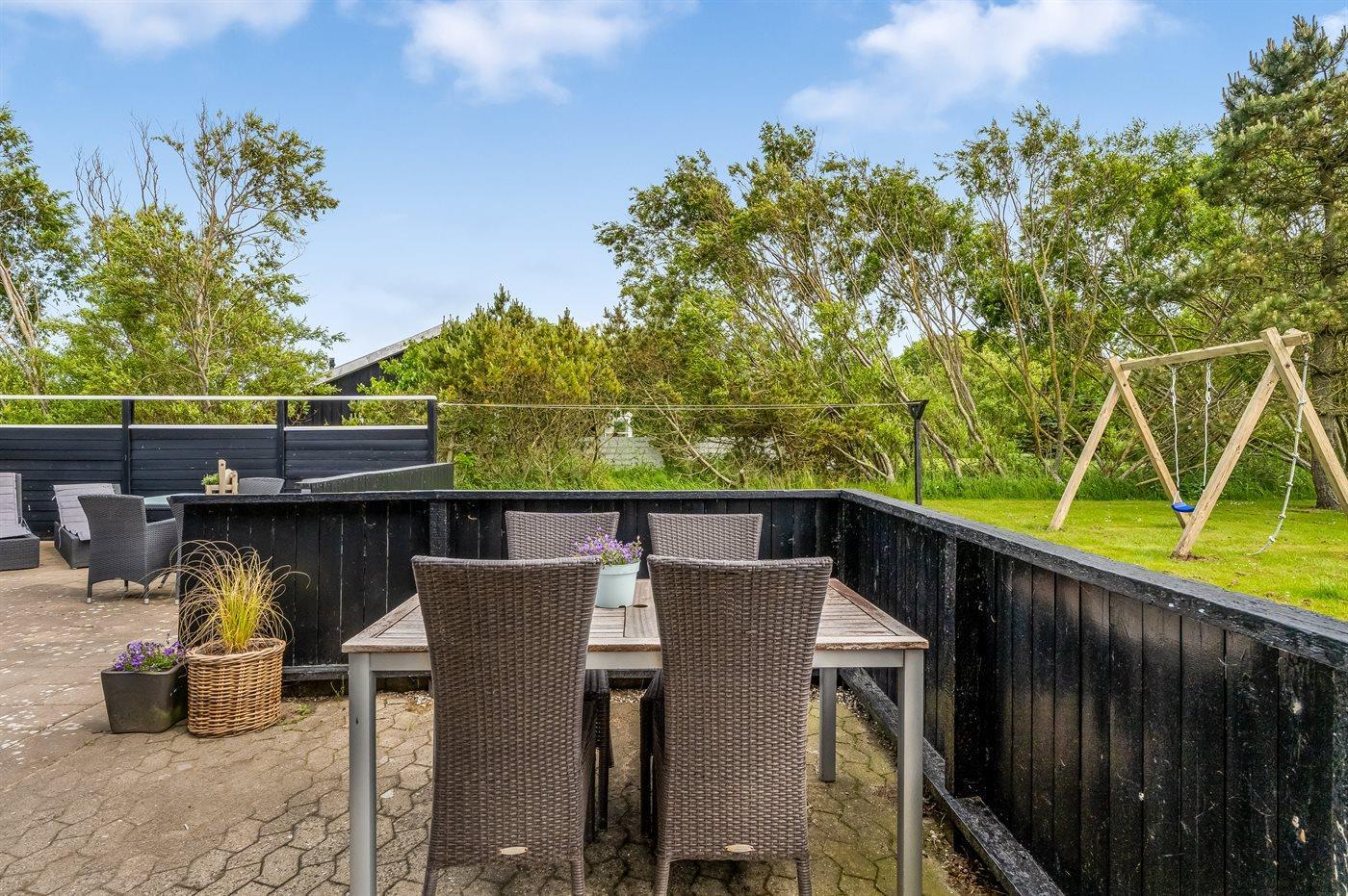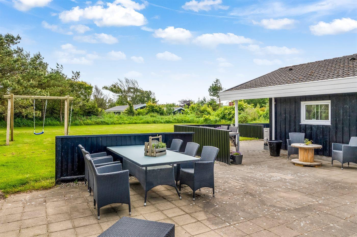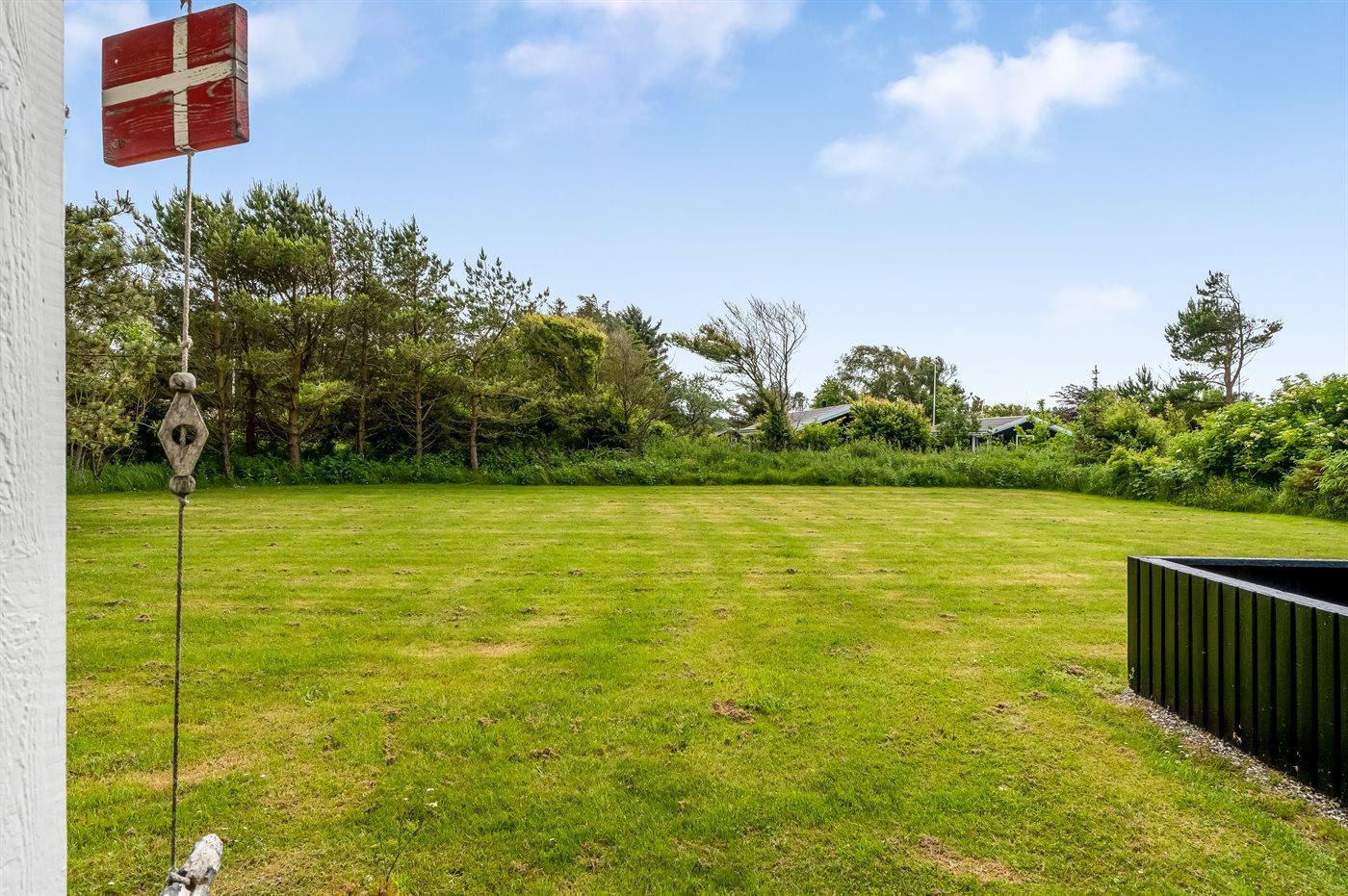 Ferieboligen er beliggende på en 1489 m² stor naturgrund. Der er 800 m til havet. Nærmeste forretning er beliggende i en afstand af 900 m. Til ferieboligen hører åbent terrasseareal. Desuden er der overdækket terrasse. Der er redskabsrum. Gynge. Grill til rådighed. Parkering ved ferieboligen.
