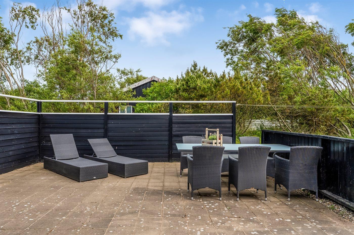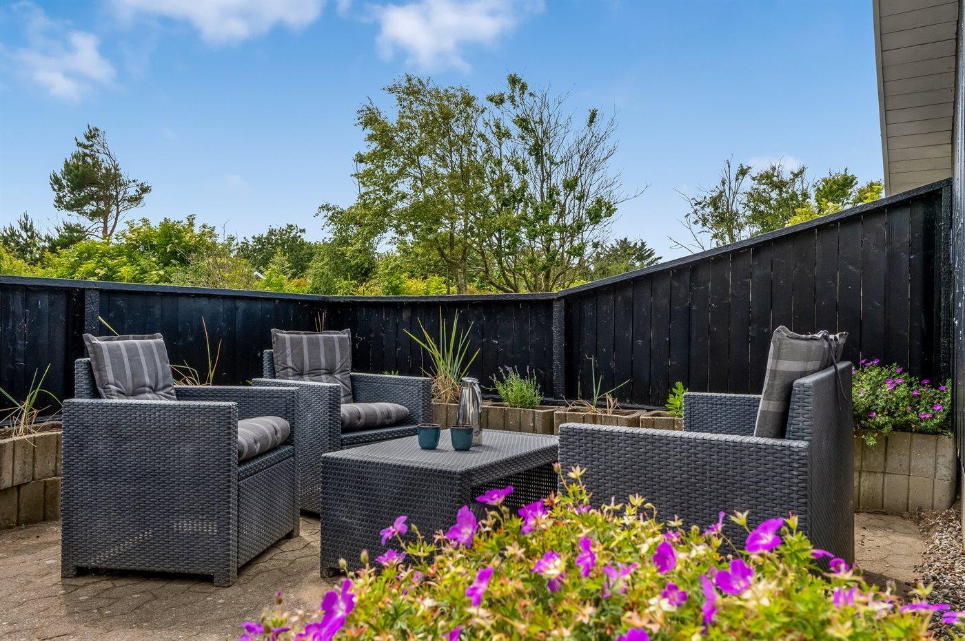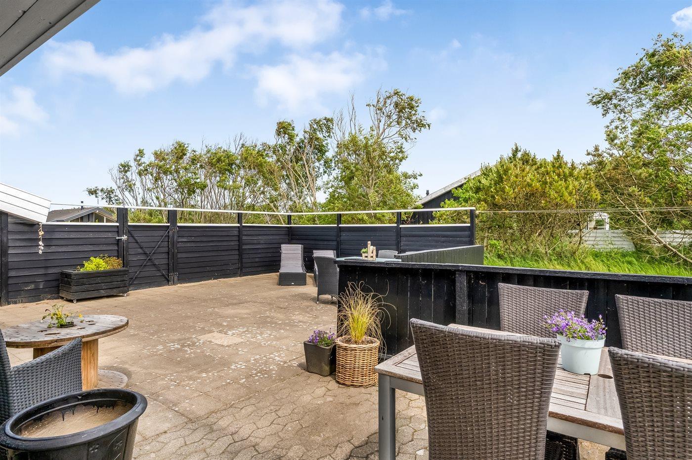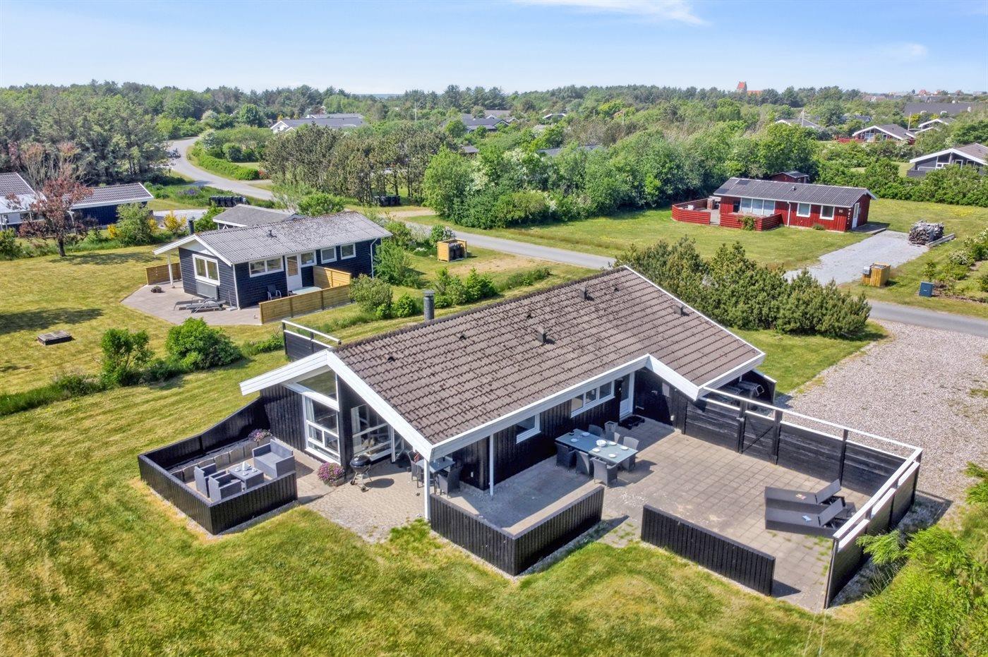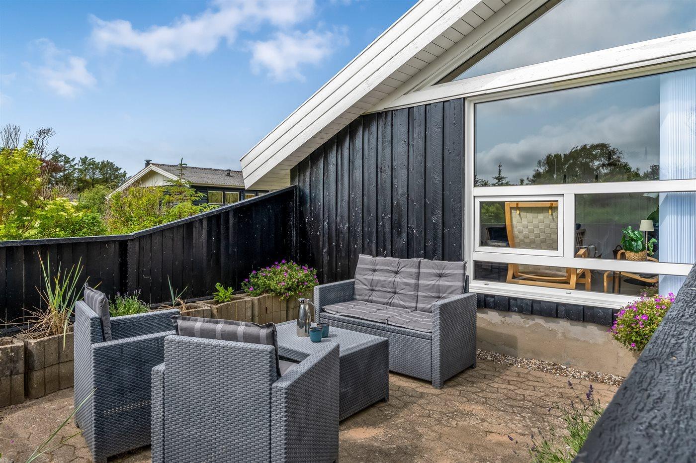 Ferieboligen er beliggende på en 1489 m² stor naturgrund. Der er 800 m til havet. Nærmeste forretning er beliggende i en afstand af 900 m. Til ferieboligen hører åbent terrasseareal. Desuden er der overdækket terrasse. Der er redskabsrum. Gynge. Grill til rådighed. Parkering ved ferieboligen.