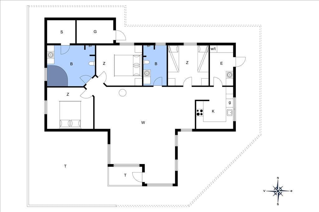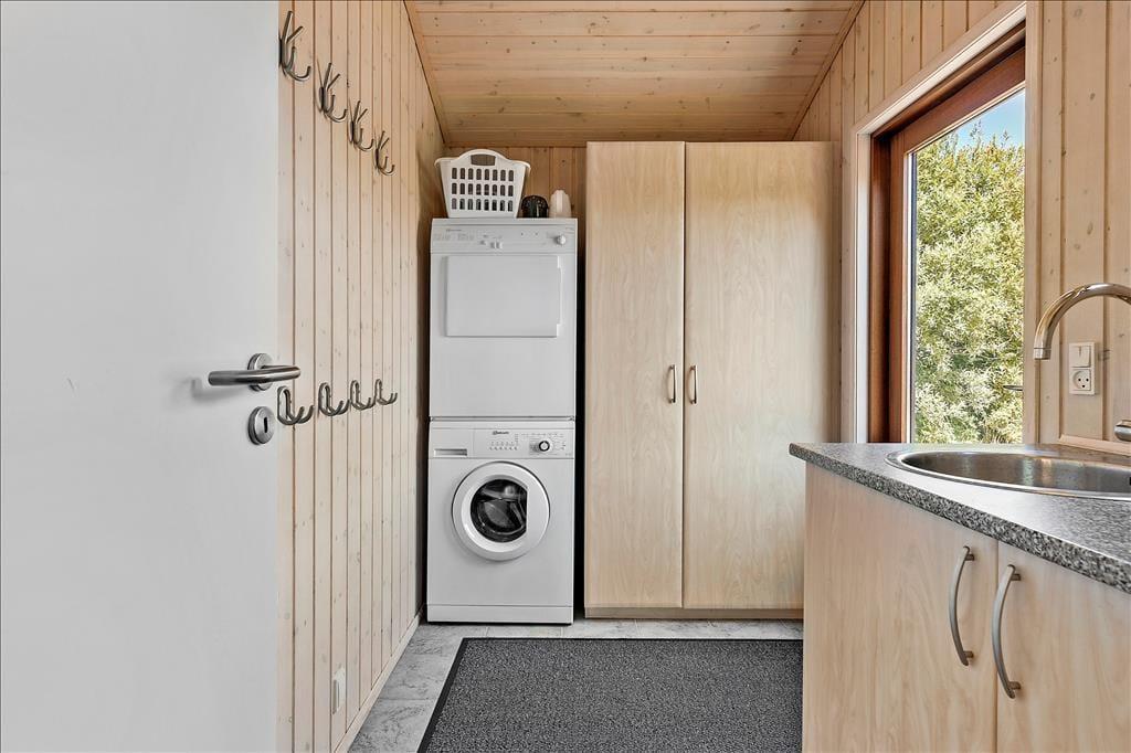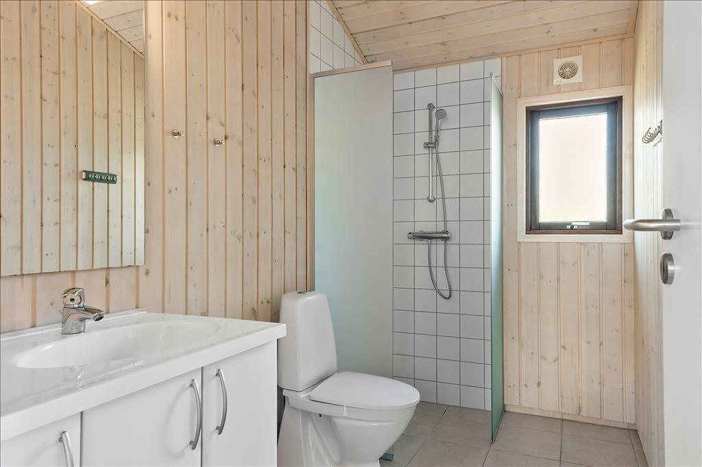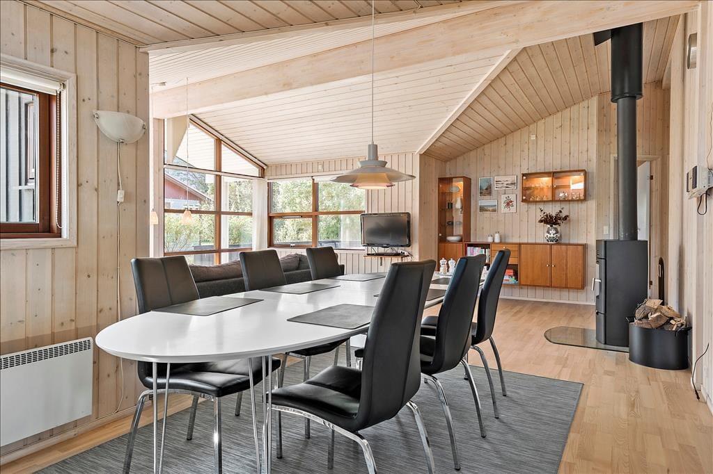 Sommerhuset er meget rummeligt og er indrettet med moderne og lyse møbler. Fra entreen går man ind i køkkenet som ligger i åben forbindelse med den store stue. Der er 3 gode soveværelser alle med skabsplads. Huset indeholder 2 badeværelser, det ene med spabad og sauna. Stuens store panoramavinduer giver et dejligt lysindfald og fra stuen er der skøn udsigt til den store grund.
