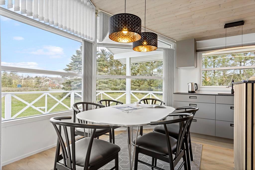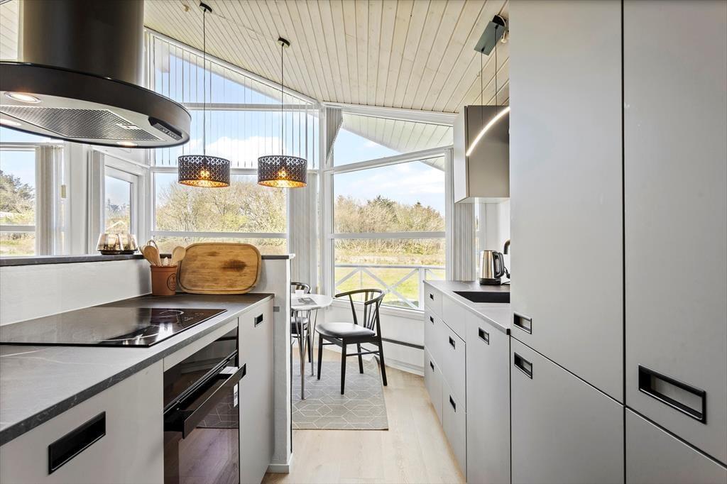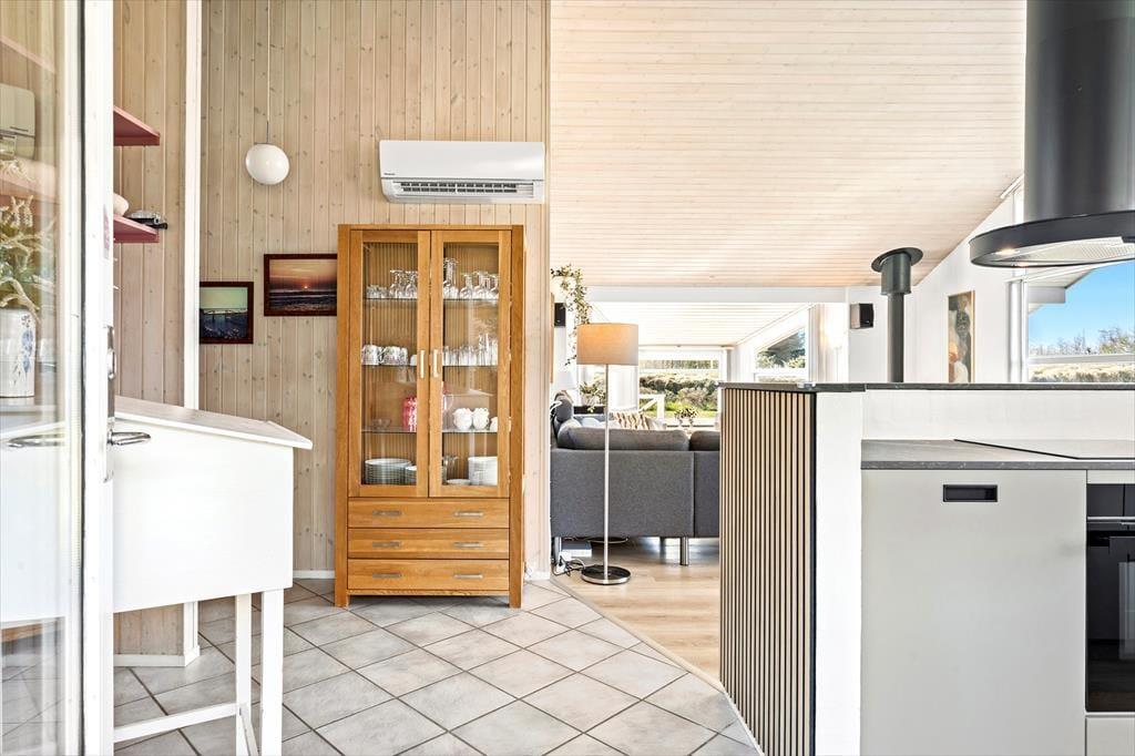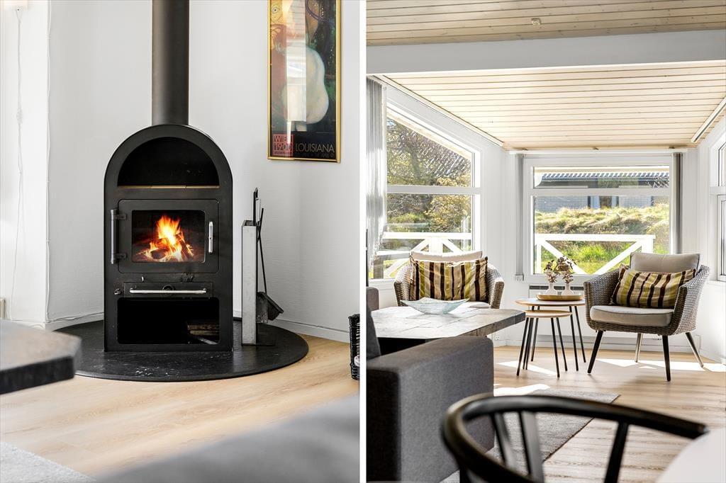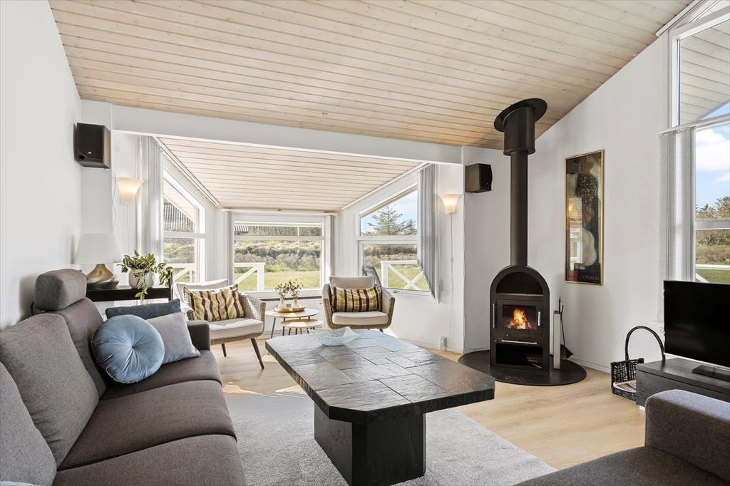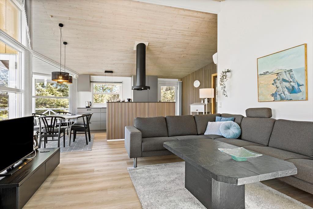 Sommerhuset er lyst og venligt indrettet med gode komfortable møbler. I det store opholdsrum, som består af køkken i åben forbindelse med stuen, er der rigtig gode muligheder for, at familien kan samles. Sommerhusets badeværelse råder over både spabad og sauna. De store vinduespartier giver et godt lysindfald dagen igennem, og fra stuen er der naturligvis udgang til den store terrasse.