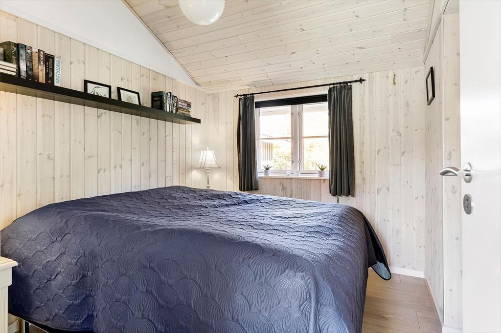 Flot indrettet sommerhus med en god fordeling af husets soverum. Via terrassen træder man ind i husets entre, som er en gang, der kombinerer husets største soverum med resten af huset. Det veludstyrede køkken og den hyggelige stue er kombineret. Der er god spiseplads, et skønt sofahjørne og fra alle husets vinduer kan den skønne udsigt over grunden nydes. Der er i alt tre soverum, tre rum med dobbeltsenge og en hems med et par madrasser. Der er to badeværelser med bruser og det ene har vaskemaskine.