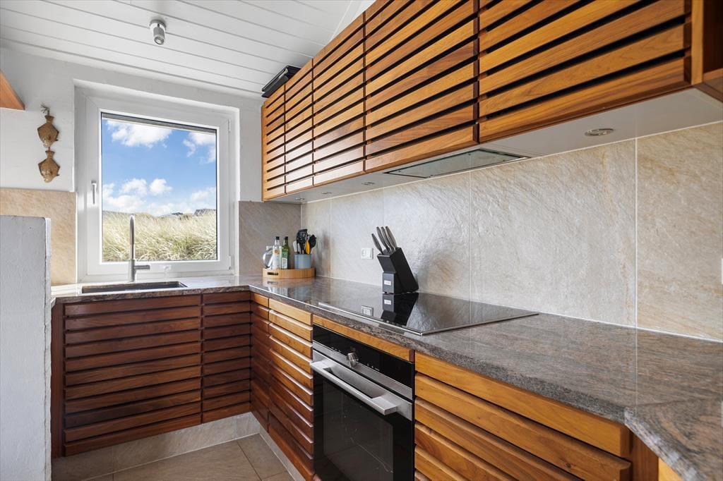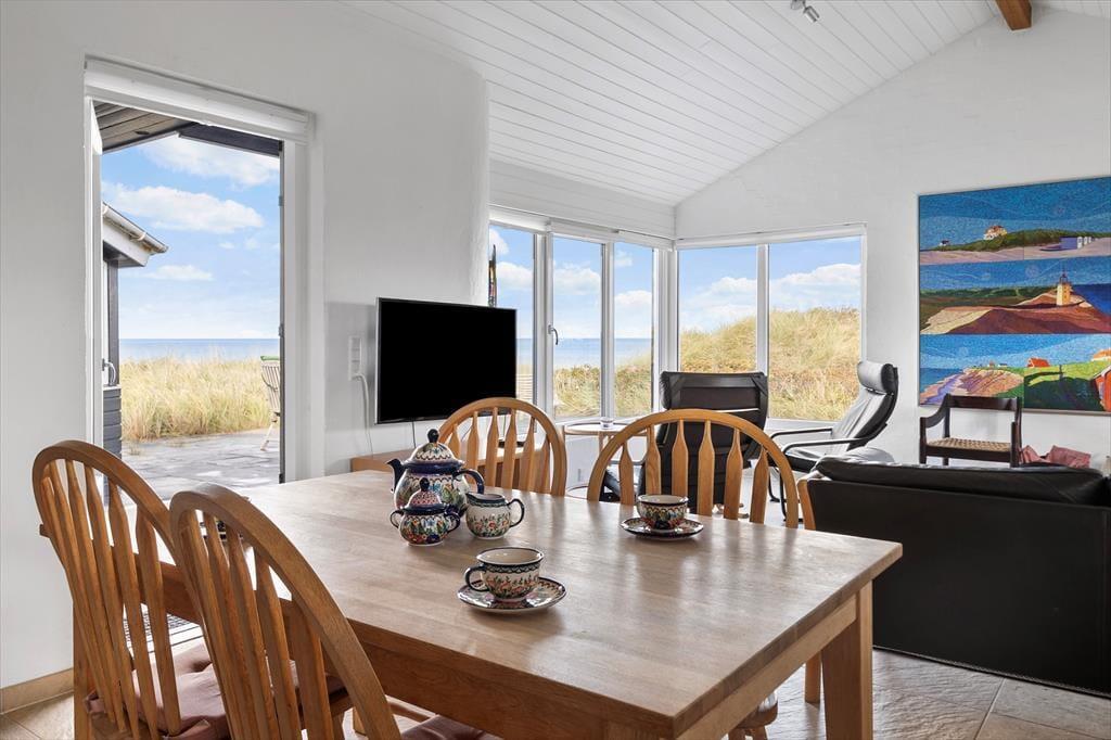 Sommerhuset, med sin klassiske sorte træfacade og hvide vinduesrammer, falder naturligt ind i det marehalmsklædte klitlandskab. Oprindeligt bygget i 1993, blev huset nænsomt renoveret i 2018 og fremstår nu endnu mere indbydende og stilfuldt, komplet med brændeovn og andre hyggelige detaljer. Gennem store vinduer strømmer lyset ind og afslører den uforstyrrede udsigt over havet, som kan nydes fra næsten alle vinkler i huset. Stuen og køkkenet smelter sammen i et åbent rum, mens to smukke soveværelser og to badeværelser fuldender indretningen. Det ene badeværelse byder på både sauna og spabad, og fra sidstnævnte kan I lade jer omslutte af både varme og havets panorama.