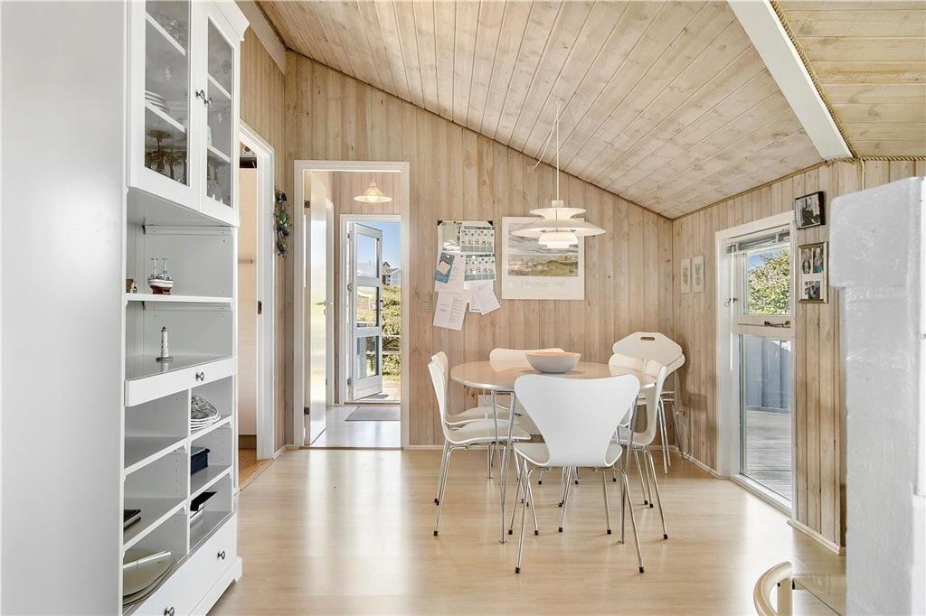 Hvis I ikke allerede er kommet i sommerhusstemning, når I kører gennem lokalområdet med duftende hybenbuske, vippende marehalm og bløde klitter, skal feriefreden nok indfinde sig, når I ankommer til huset. Atmosfæren er nemlig helt i top inden døre i sommerhuset, for her er der lyse trælister på væggene, loft til kip, brændeovn og andre klassiske sommerhustræk – og gennem vinduerne kan I selvfølgelig nyde at der er havkig og udsigt til de naturskønne omgivelser. Planløsningen byder på tre gode soveværelser med dobbeltseng og et pænt badeværelse, der er indrettet med vaskemaskine og bruseniche. Stue og køkken ligger i åben forbindelse, så selvom aftensmaden skal forberedes, kan I sagtens tage del i familiesamværet.