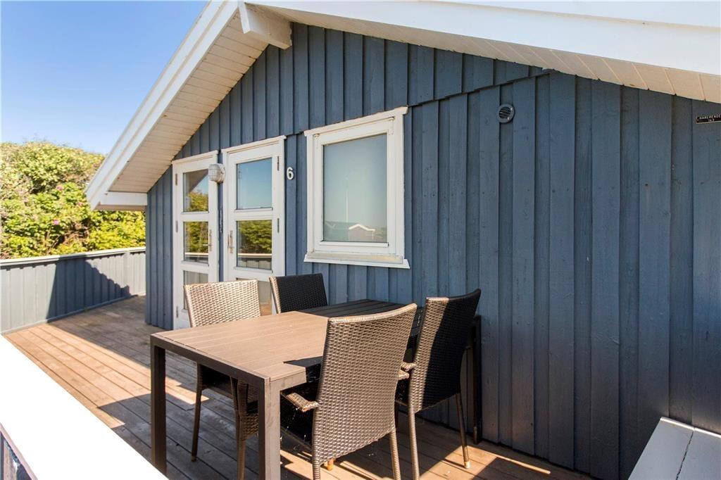 På den kuperede grund er det nemt at finde en dejlig opholdsplads i solen. Rundt om sommerhuset er der flere terrasseområder at vælge imellem, inklusiv et overdækket areal, hvis I trænger til skygge. I kan også sætte jer ved bord-bænke-sættet på græsplænen eller tage trappen op til en lille bænk – det er en dejligt fredelig plet, hvor I kan nyde duften af hybenroser og den smukke havudsigt, mens I slapper fuldstændigt af.