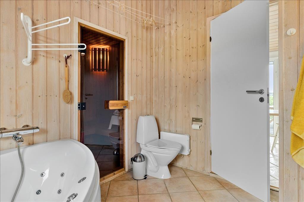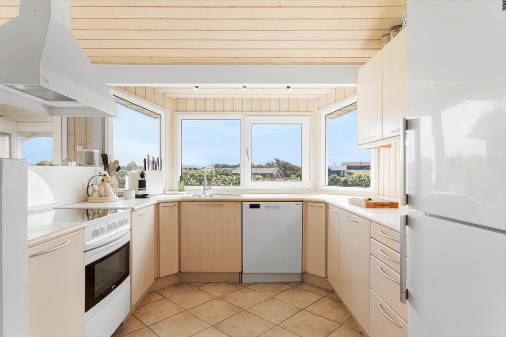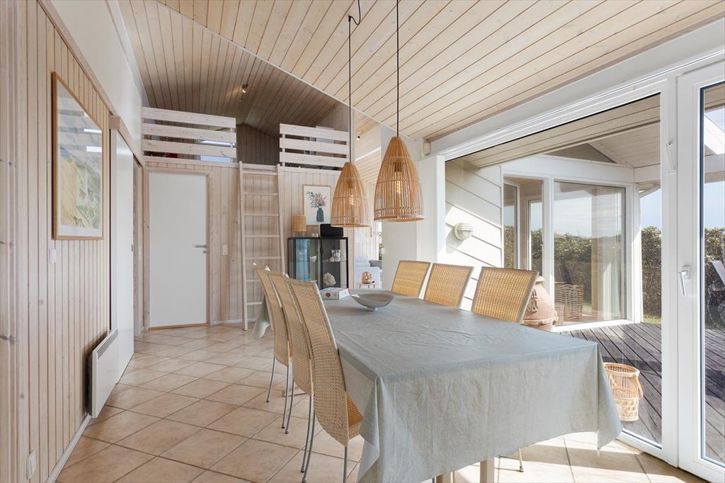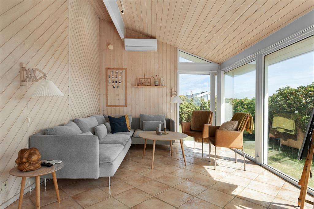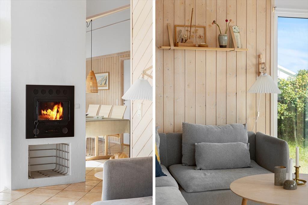 Med lyse trælister på væggene, loft til kip og store vinduespartier er atmosfæren let og luftig inden døre i det 97 m2 store og rummelige sommerhus. Den skønne atmosfære understøttes af den stilfulde indretning, for naturmaterialerne og de lyse farvetoner passer perfekt til både huset og det flotte kystlandskab, der åbenbarer sig udenfor vinduerne. I opholdsafdelingen ligger køkken-alrum og stue i åben forbindelse, og herfra er der direkte adgang til en hyggelig hems. Tre soveværelser er fordelt i begge ender af sommerhuset, og midt imellem ligger to badeværelser, hvoraf det største er lækkert indrettet med sauna og spabad.