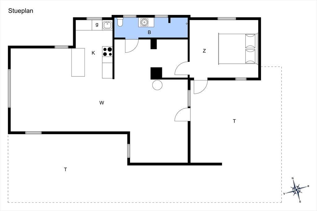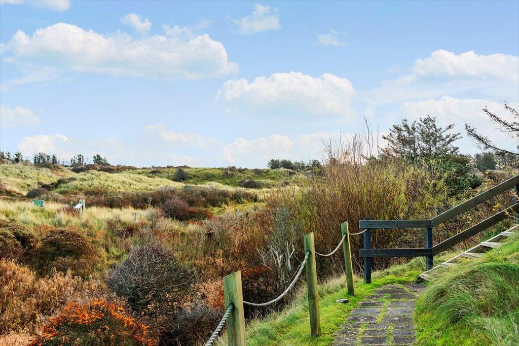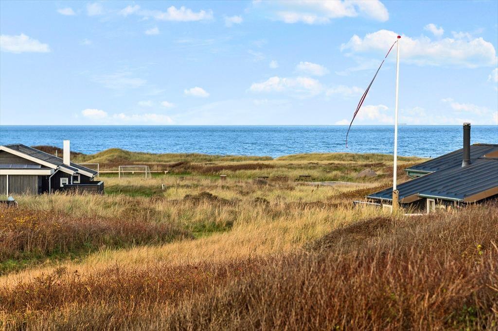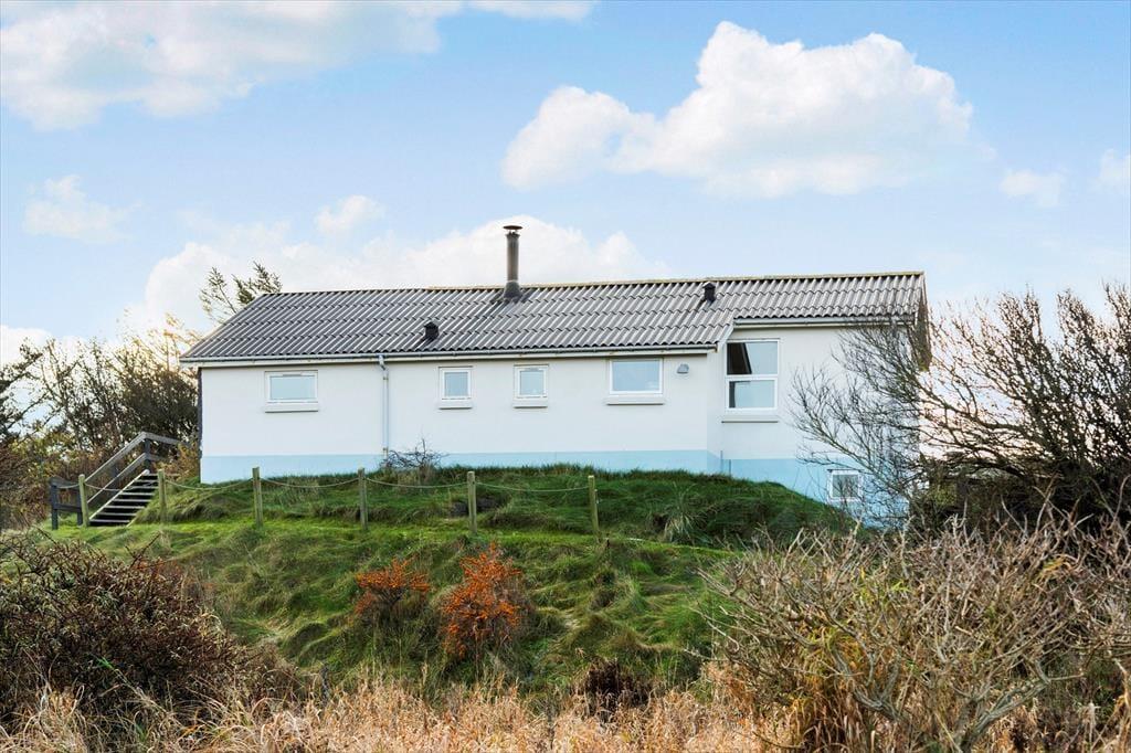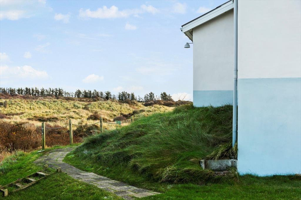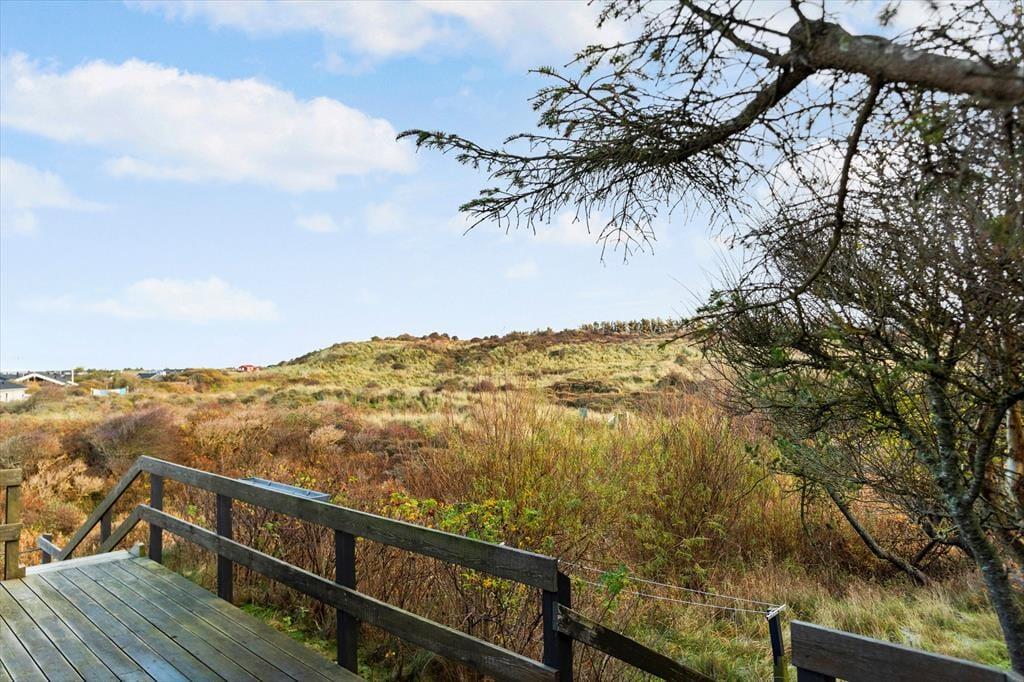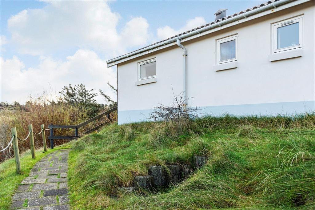 Det store terrassemiljø breder sig mod øst, syd og vest, så I får nemt ved at finde en god opholdsplads i solen det meste af dagen. På østsiden af huset kan I sidde dejligt ugeneret, mens I suger den flotte udsigt over indlandsklitterne til jer, og mod vest kan I se havet blinke til jer hen over sommerhustagene. Bemærk for øvrigt, at grunden er kuperet, så I skal tage en trappe op til huset og terrassen.