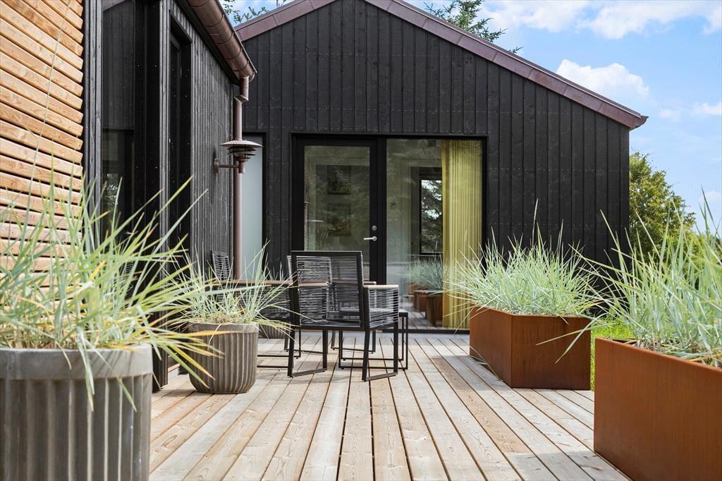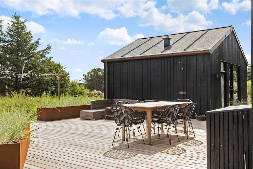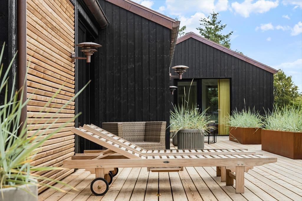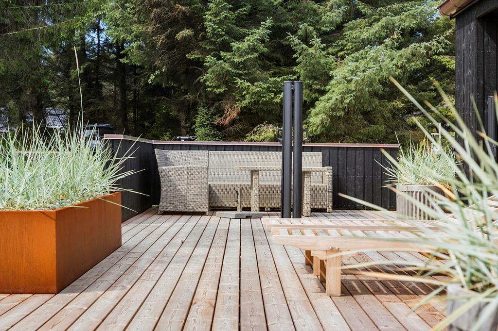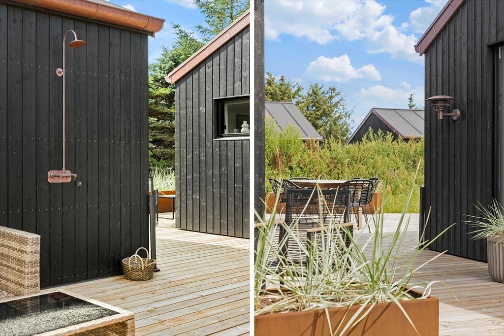 Også ude i det fri er der lagt op til afslapning og hygge på det kæmpe terrassemiljø, der breder sig rundt om sommerhuset. Der er flere opholdspladser at vælge imellem, så I kan lige tage bestik af vejret og vindretningen, inden I slår jer ned under overdækningen eller finder en læfyldt solkrog. Der er loungemøbler, grill og alt andet, I skal bruge for at have det godt og komfortabelt – inklusiv en flot udendørs bruser og et ugeneret hjørne med et stort spabad.