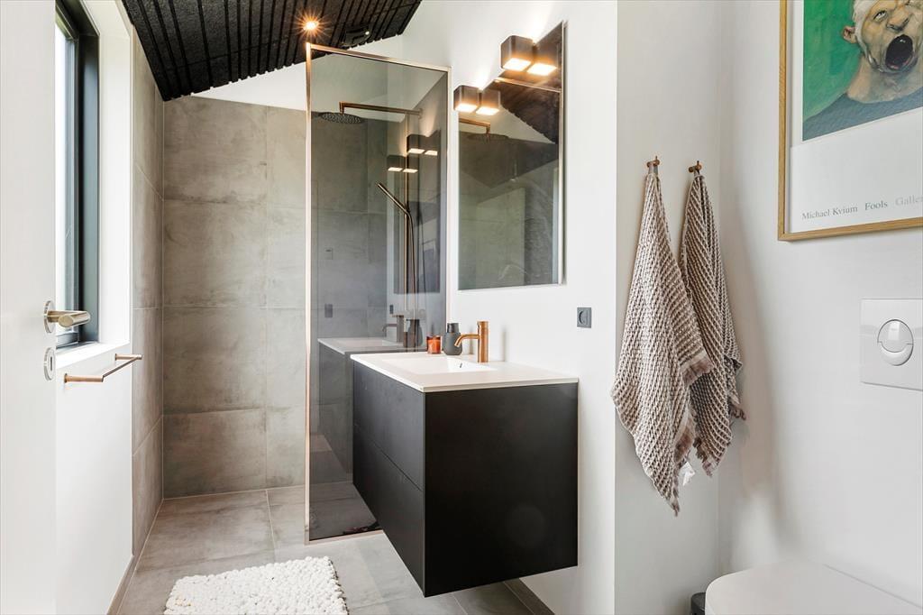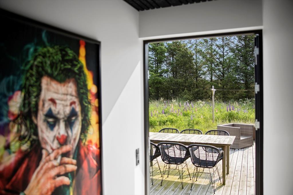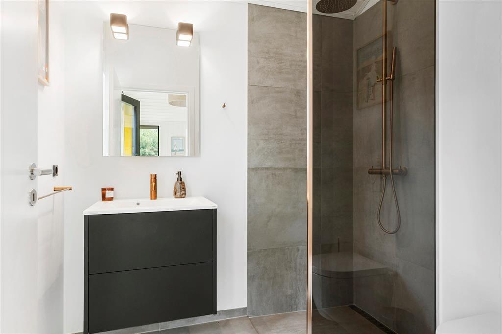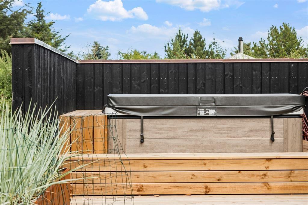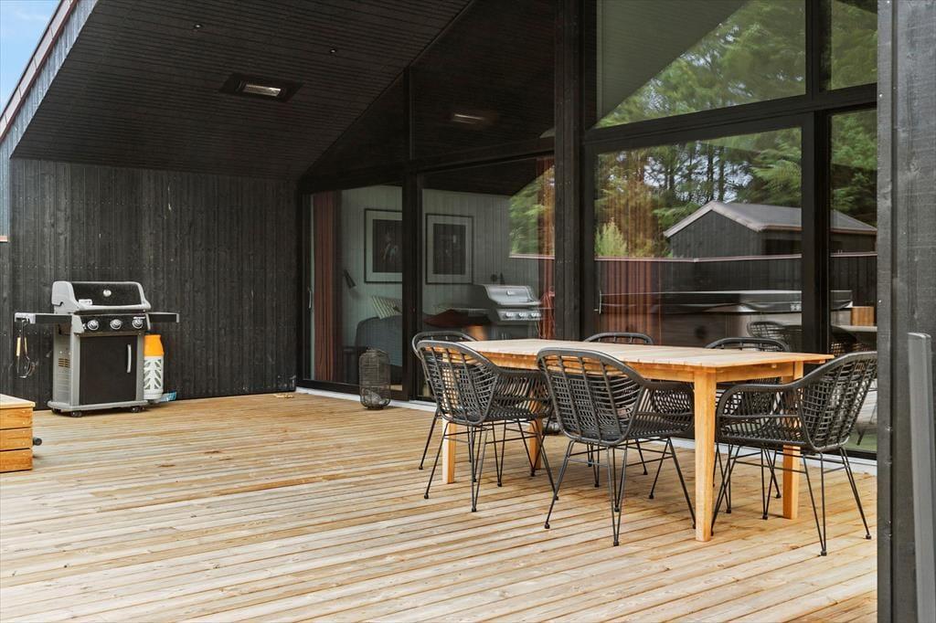 Også ude i det fri er der lagt op til afslapning og hygge på det kæmpe terrassemiljø, der breder sig rundt om sommerhuset. Der er flere opholdspladser at vælge imellem, så I kan lige tage bestik af vejret og vindretningen, inden I slår jer ned under overdækningen eller finder en læfyldt solkrog. Der er loungemøbler, grill og alt andet, I skal bruge for at have det godt og komfortabelt – inklusiv en flot udendørs bruser og et ugeneret hjørne med et stort spabad.