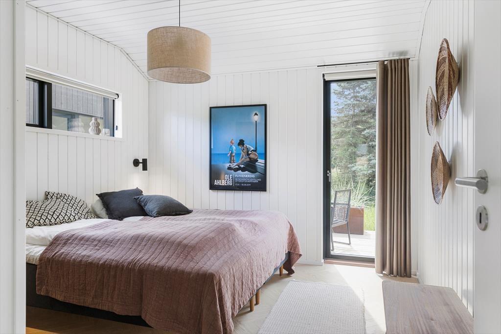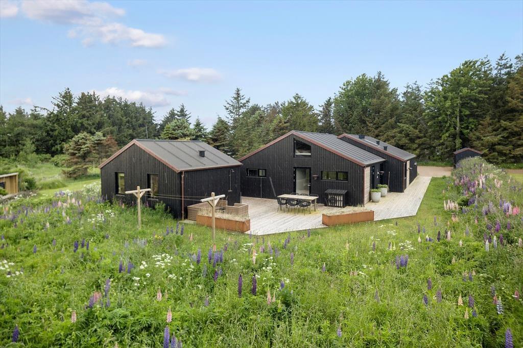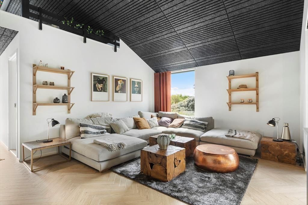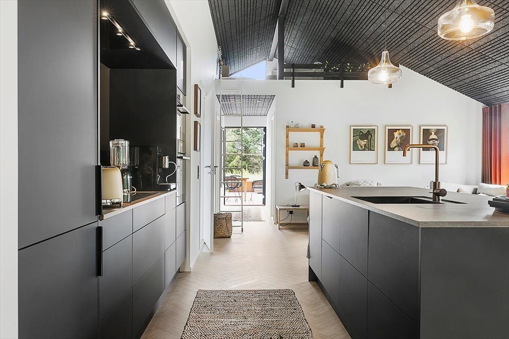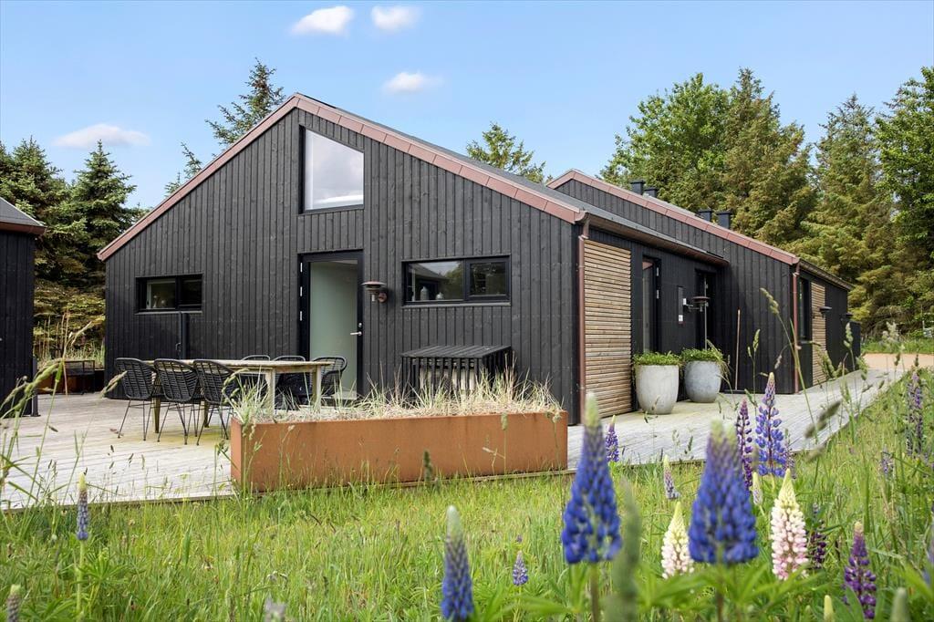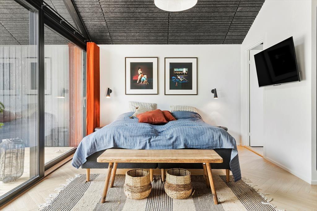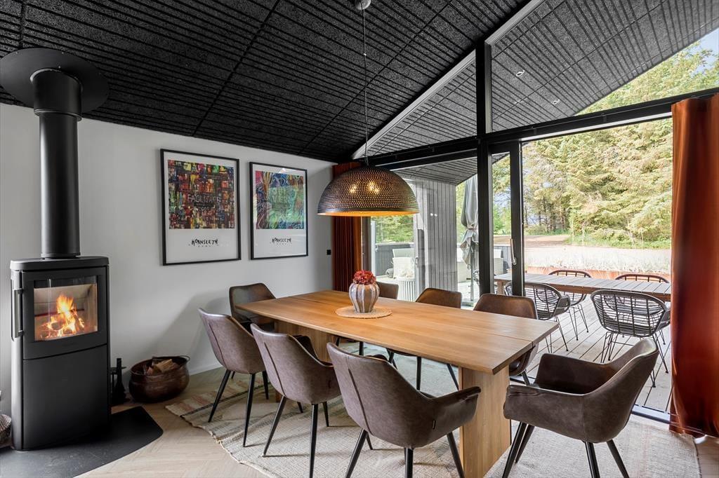 Sommerhuset og det tilhørende anneks har et stilfuldt ydre med en sort træfacade, der brydes af store vinduespartier og naturfarvede lamelvægge. Inden døre giver de hvidmalede vægge en flot kontrast til de sorte akustiklofter, der går helt til kip, mens sildebensparket danner et elegant underlag i opholdsafdelingen og på soveværelserne. Tre soveværelser med dobbeltseng og to brusebadeværelser hører med til planløsningen i selve hovedhuset, mens annekset har to soveværelser, eget badeværelse og et lille opholdsrum med ekstra sovesofa. Alle rum fremstår yderst velindrettede og har en skøn atmosfære – men mon ikke, I mest af alt har lyst til at opholde jer i hovedhusets opholdsafdeling, når I vil slappe af og hygge jer sammen? Her bliver I forkælet med et veludstyret og lækkert køkken, et flot spisebord nær brændeovnen, en god hems og et skønt flyderhjørne med en stor hjørnesofa.