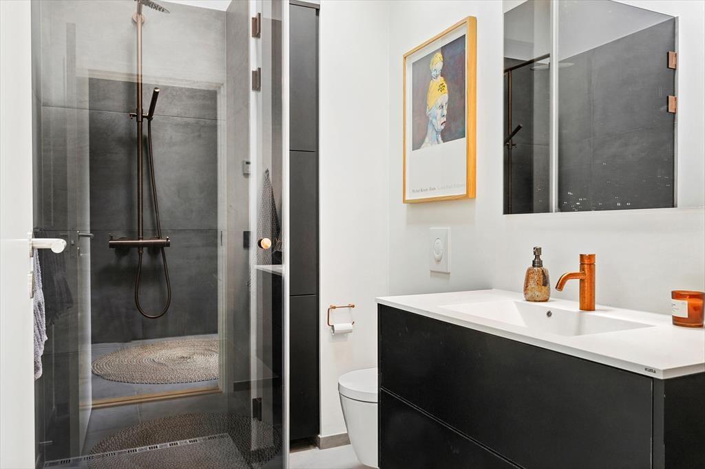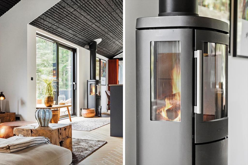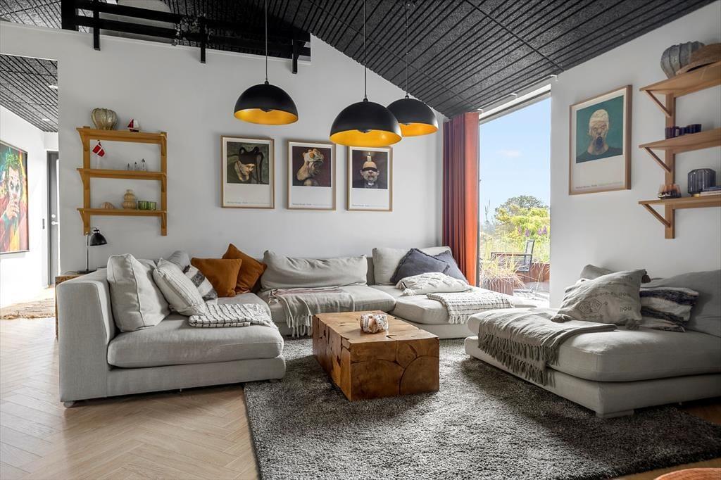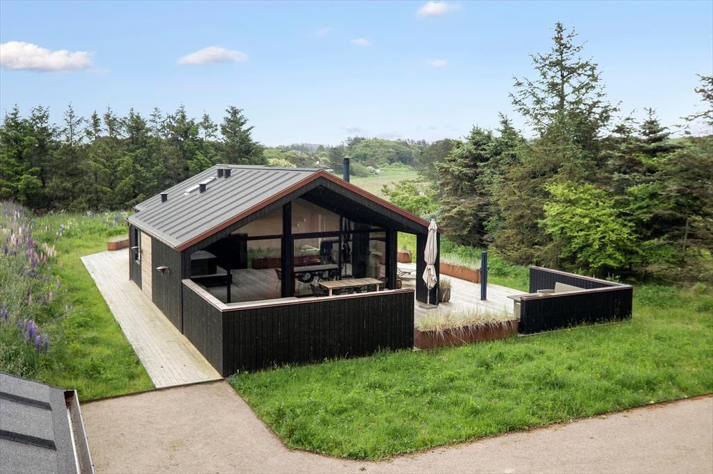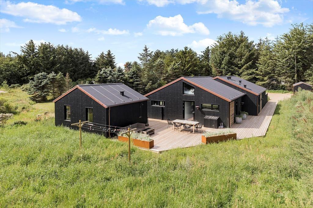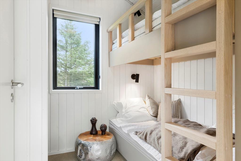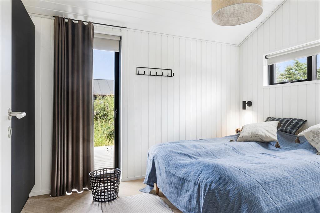 Sommerhuset og det tilhørende anneks har et stilfuldt ydre med en sort træfacade, der brydes af store vinduespartier og naturfarvede lamelvægge. Inden døre giver de hvidmalede vægge en flot kontrast til de sorte akustiklofter, der går helt til kip, mens sildebensparket danner et elegant underlag i opholdsafdelingen og på soveværelserne. Tre soveværelser med dobbeltseng og to brusebadeværelser hører med til planløsningen i selve hovedhuset, mens annekset har to soveværelser, eget badeværelse og et lille opholdsrum med ekstra sovesofa. Alle rum fremstår yderst velindrettede og har en skøn atmosfære – men mon ikke, I mest af alt har lyst til at opholde jer i hovedhusets opholdsafdeling, når I vil slappe af og hygge jer sammen? Her bliver I forkælet med et veludstyret og lækkert køkken, et flot spisebord nær brændeovnen, en god hems og et skønt flyderhjørne med en stor hjørnesofa.