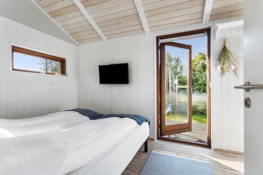 Fra både opholdsafdelingen og de tre soveværelser er der direkte adgang til det lækre terrassemiljø, der breder sig rundt om det meste af sommerhuset. Vil du ud i den friske luft for at strække kroppen, kan du med andre ord gøre det, så snart du står ud af sengen, og det er selvfølgelig også oplagt at flytte morgenmaden og dagens øvrige måltider ud i det fri, når vejrguderne er i det milde hjørne. En del af terrassen er afskærmet til tre sider, så her er der næsten altid læ, og hele det udendørs opholdsmiljø er for øvrigt meget ugeneret.