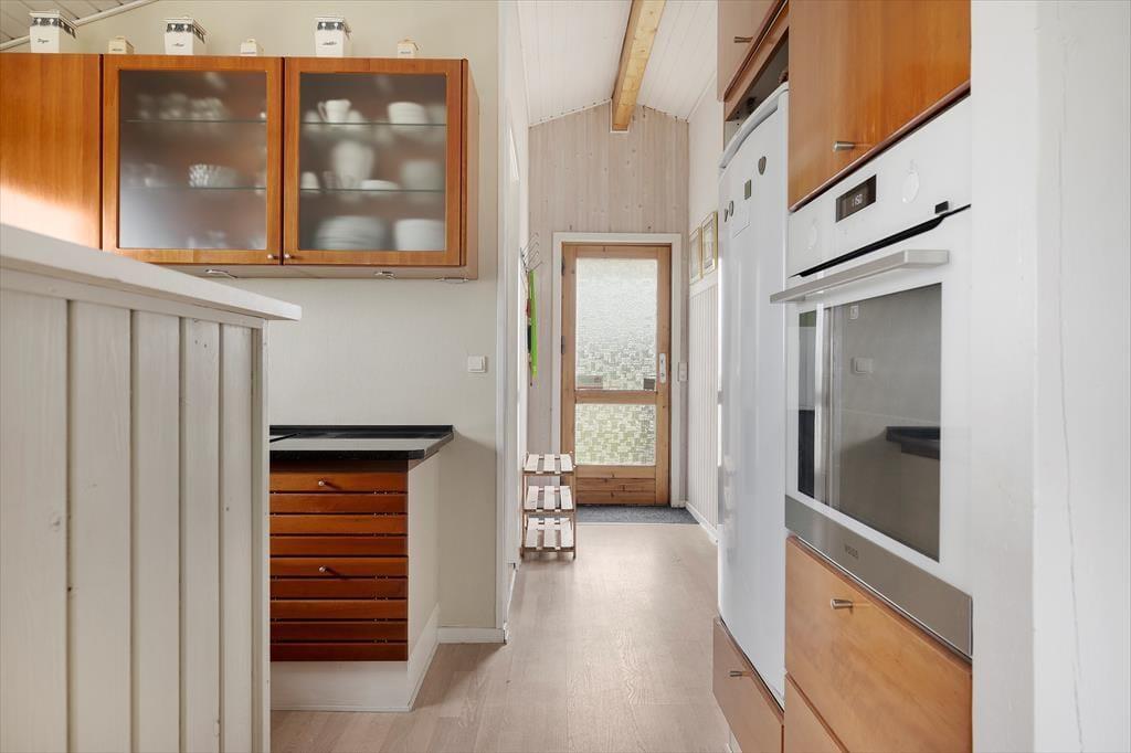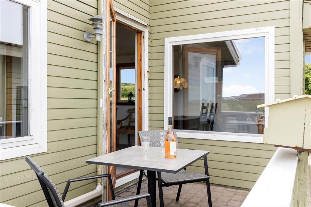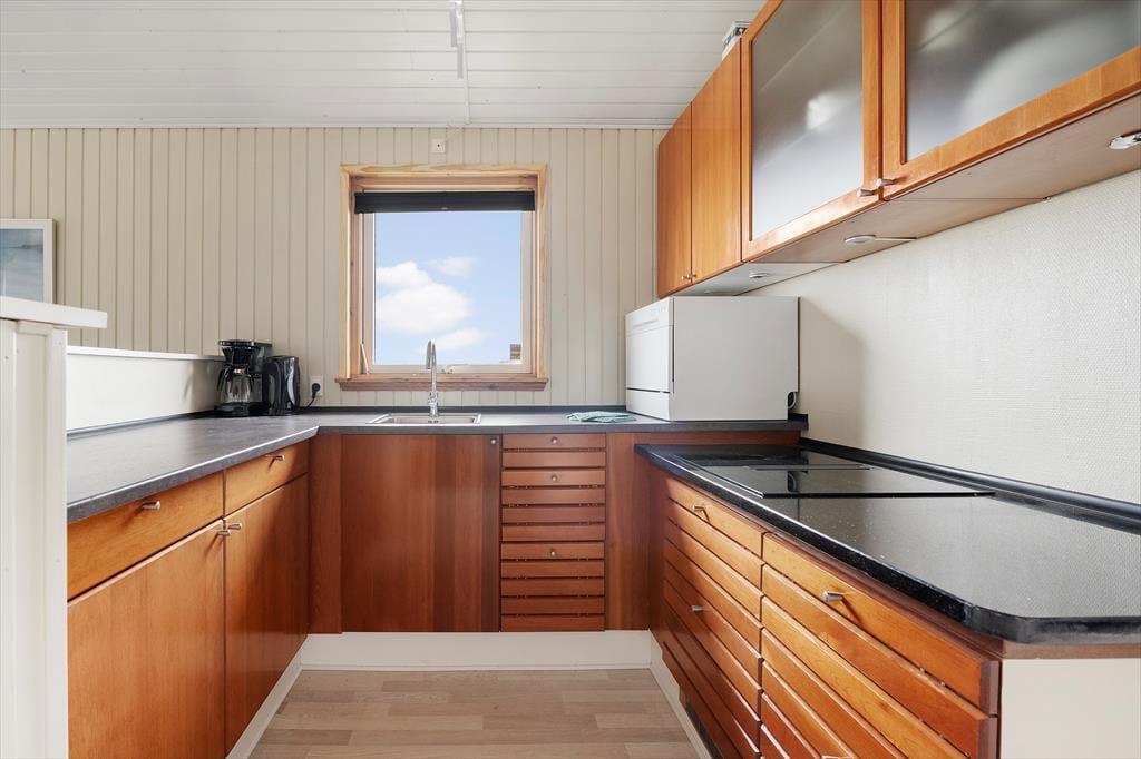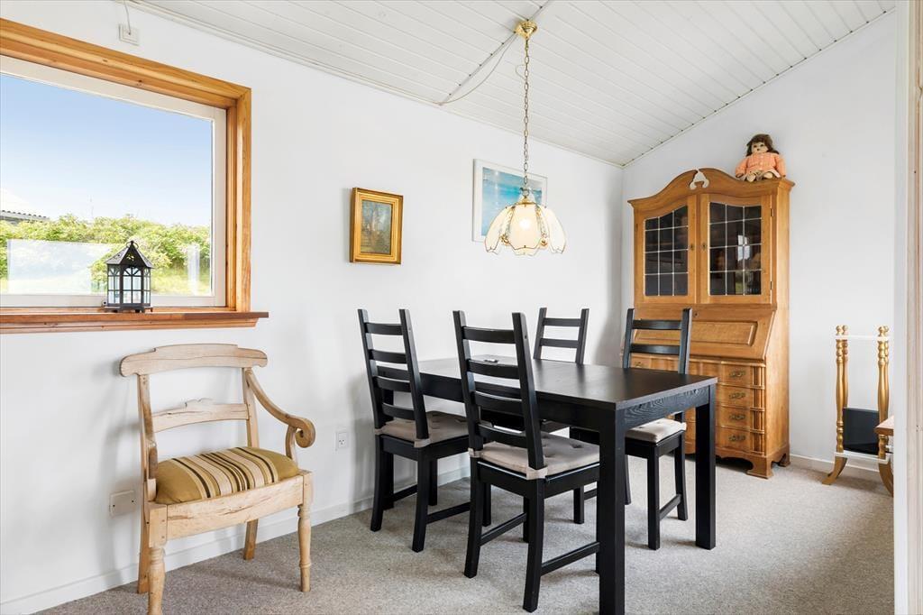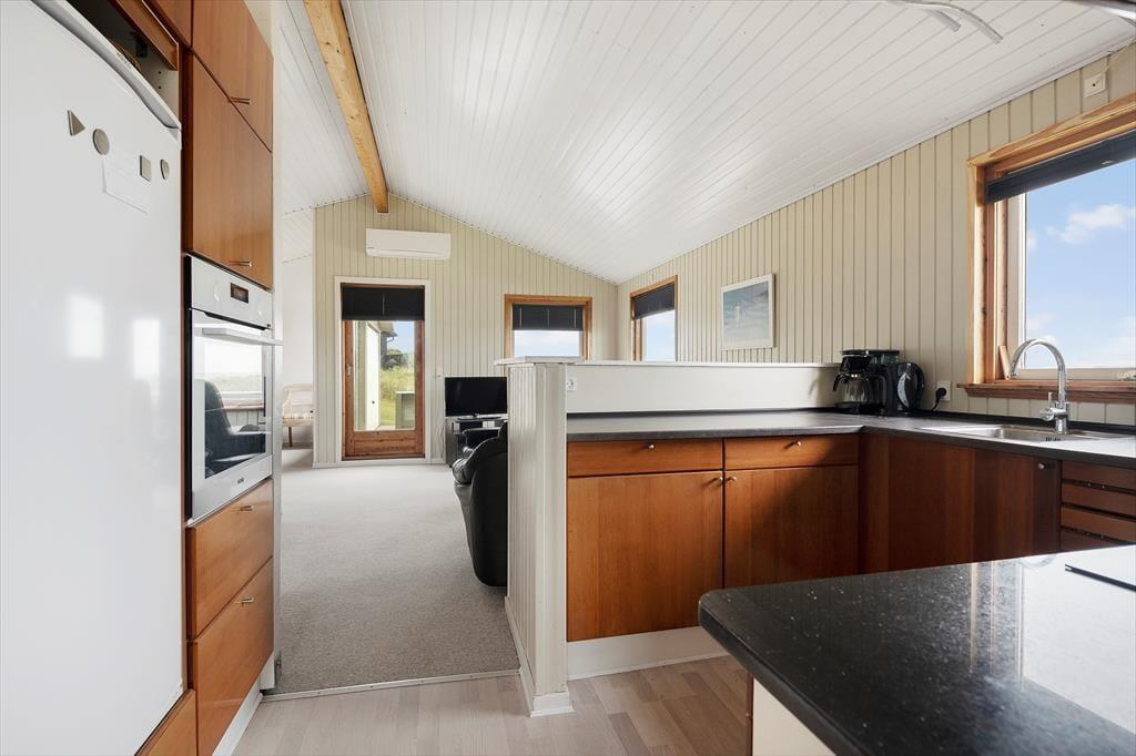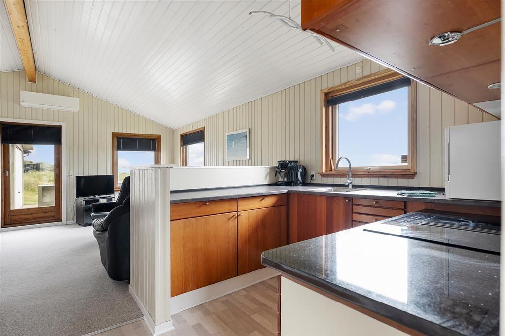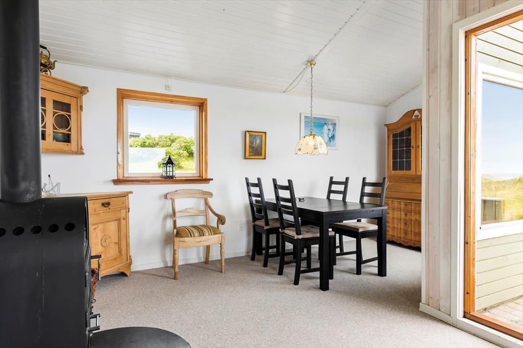 Du vil sikkert føle dig heldig, når du sidder inden døre i sommerhusets trygge omgivelser og nyder udsigten: Tænk, at kunne følge løbende med i, hvordan Vesterhavet skifter udseende og temperament i takt med vejrudsigten og tidspunktet på dagen! Det ældre sommerhus har på klassisk vis loft til kip og lyse trævægge, og brændeovnen står klar til at sprede varme og en rar atmosfære på en kølig eftermiddag eller aften. Køkkenet er integreret med stuen, og planløsningen byder derudover på et brusebadeværelse og to soveværelser, så alt i alt passer huset fint til fire personer – og to husdyr er for øvrigt også velkomne, hvis du vil have både hunden og katten med på ferien.