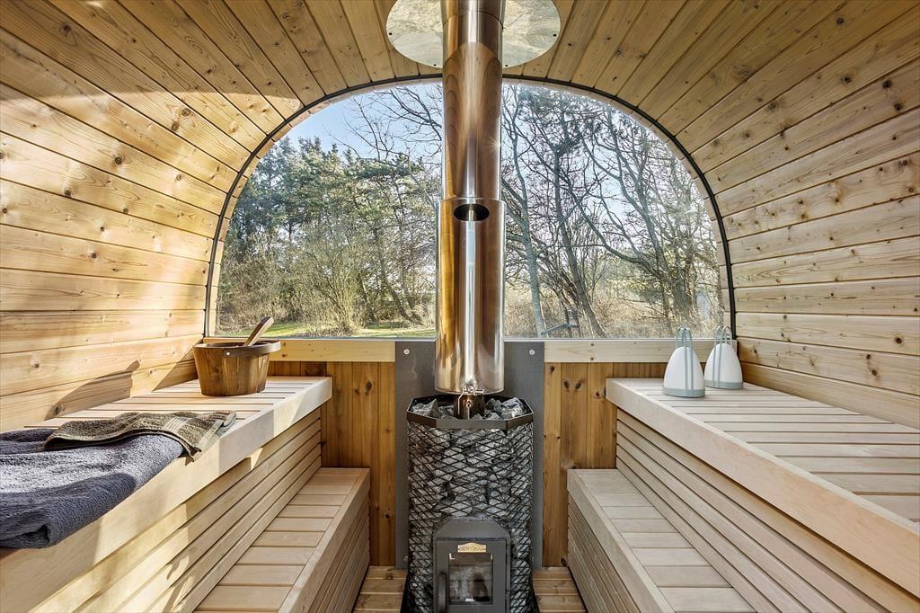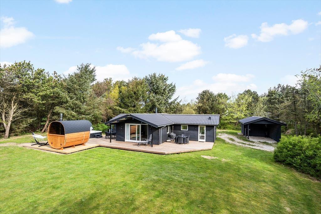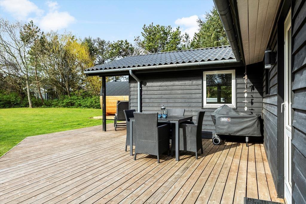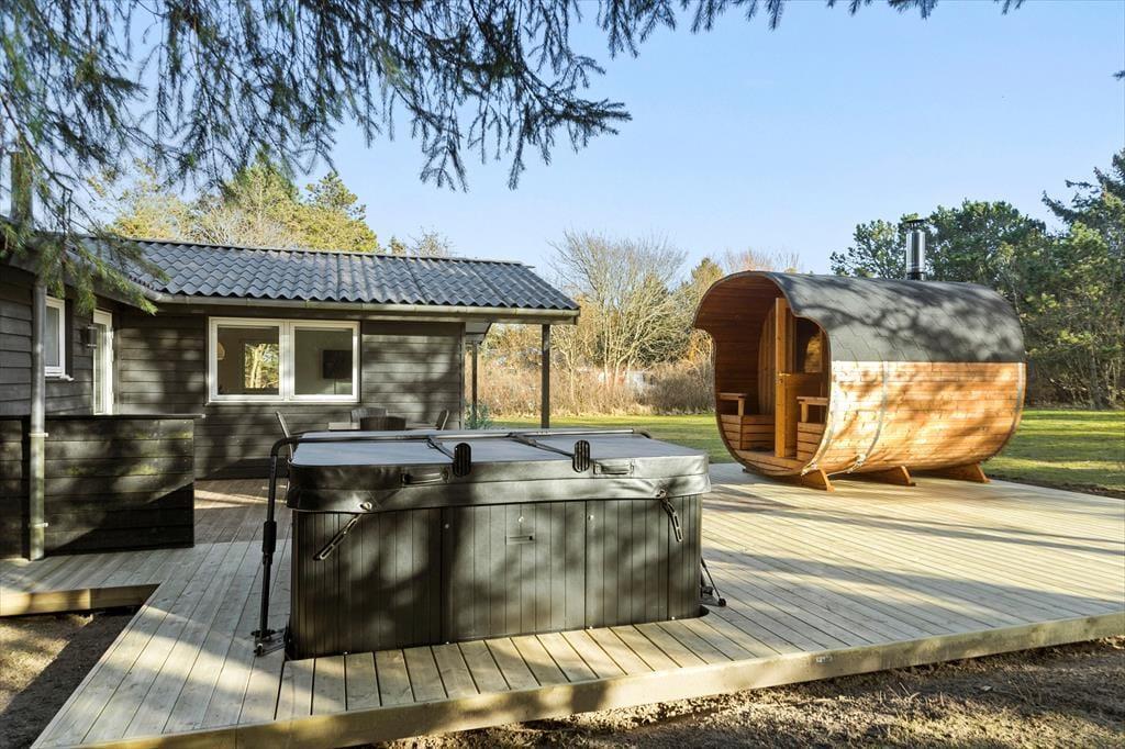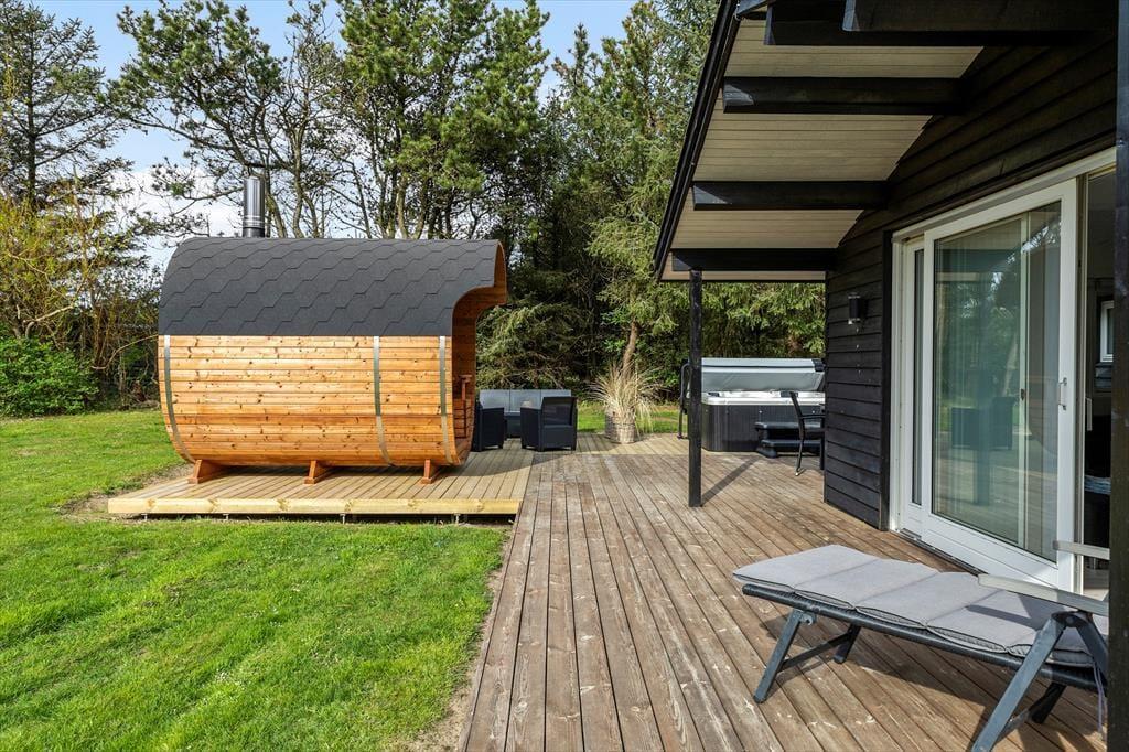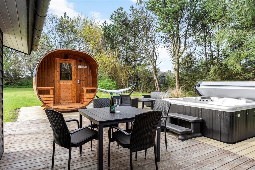 Udenfor venter en stor og solrig terrasse, hvor du kan nyde den friske havluft og lyden af Vesterhavet i baggrunden. Her kan du slappe af i de komfortable havemøbler, grille en lækker middag eller bare nyde en stille stund med en bog. Den udendørs spa giver dig mulighed for at synke ned i det varme vand og lade kroppen slappe helt af, mens du nyder den frie udsigt til naturen. Vil du have endnu mere velvære, kan du trække dig tilbage i den udendørs sauna og lade varmen omfavne dig, inden du tager et forfriskende bad under åben himmel.