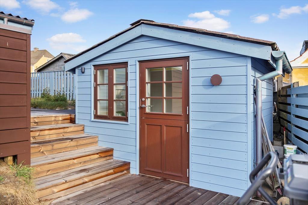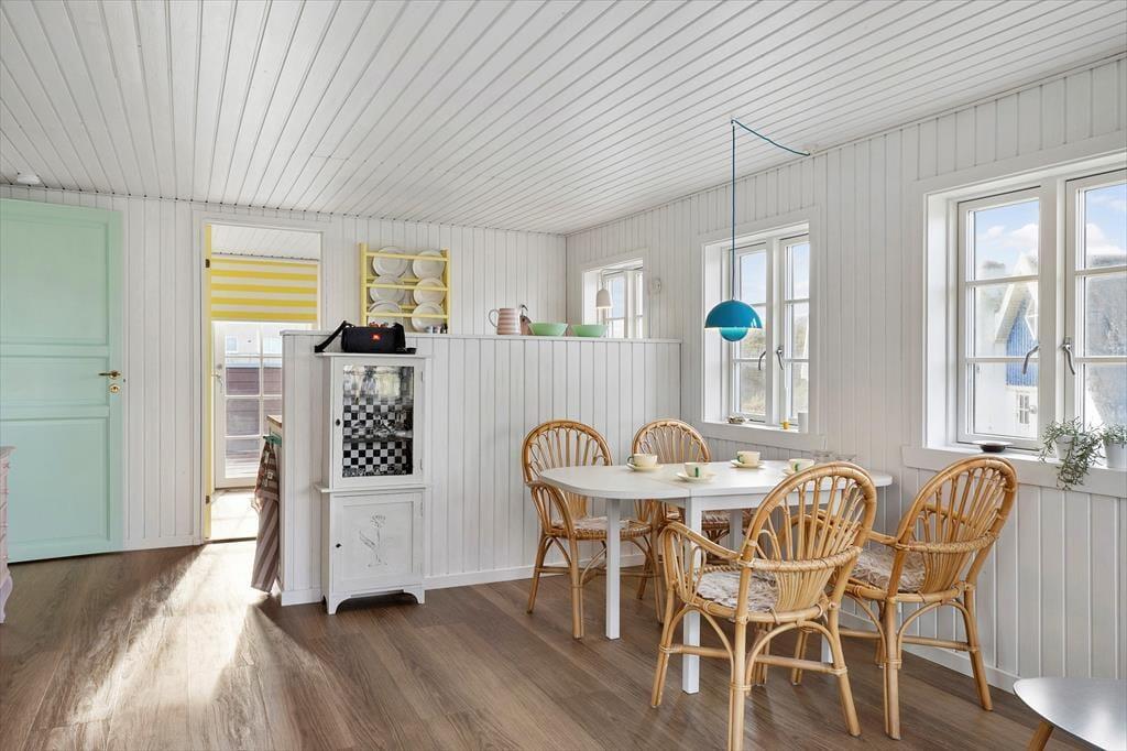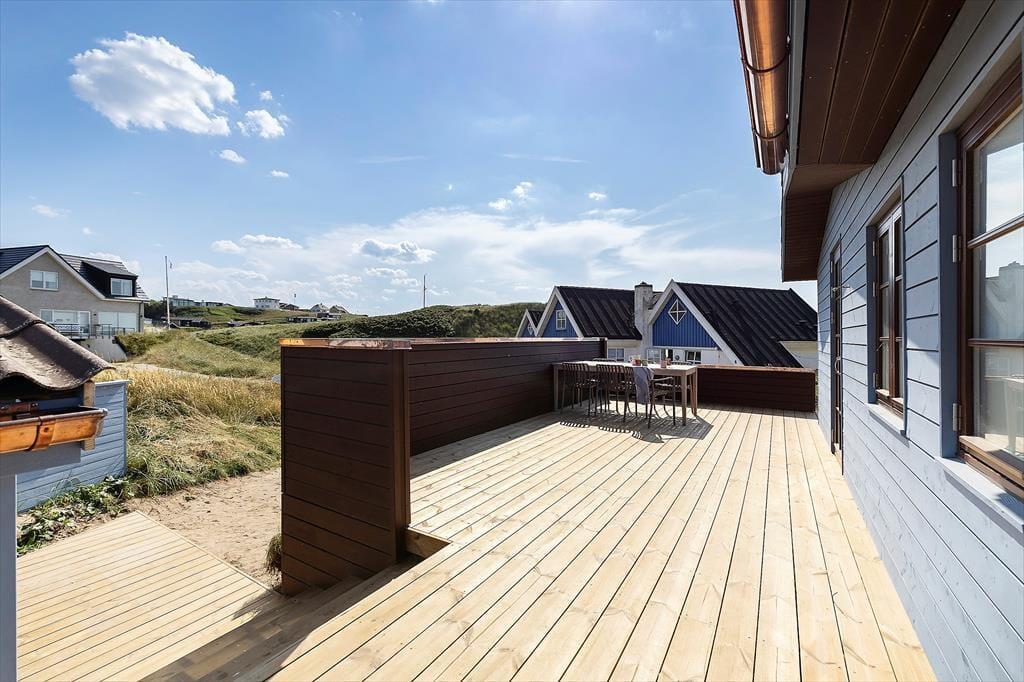 Med en stor træterrasse, som er anlagt hele vejen rundt om huset - udsigt ud over havet og masser af privatliv, er der gode muligheder for at starte dagen med en stille kop kaffe i morgensolen og runde den af med et glas vin i den lune sommeraften. Terrassen er udstyret med komfortable havemøbler, der er mulighed for at finde både sol og skygge, og du skal ikke bevæge dig mange meter, før du står med fødderne i det varme sand ved stranden. Byliv i baghaven. Få minutter til indkøb, restaurant og byens kunsthåndværkere. Adgang til sauna.