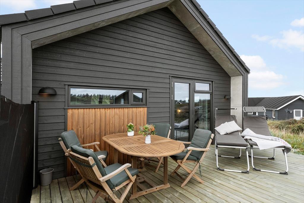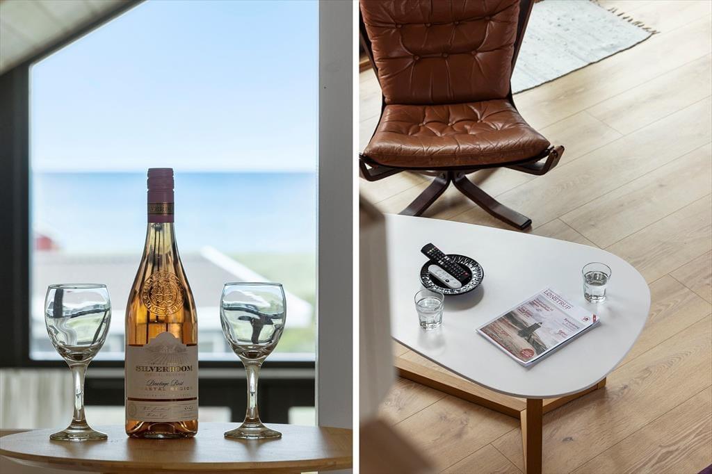 Når solen skinner – og det gør den heldigvis ofte i Lønstrup – vil du hurtigt opdage, at det store terrassemiljø næsten fungerer som husets ekstra opholdsrum. Træterrassen går næsten hele vejen rundt om sommerhuset, så du kan flytte med solen i takt med, at den bevæger sig over himlen. Start morgenen med en stille kop kaffe i læ på østsiden, snup en lur i liggestolen under eftermiddagssolen mod syd, og saml familien til grillmiddag på den vestvendte del af terrassen, mens solen går ned i horisonten. Herfra har du nemlig en storslået udsigt over det brusende Vesterhav – en kulisse, der næsten er for god til at være sand. Det er også et ideelt sted at lade børnene lege på den naturlige grund, mens de voksne nyder ferielivet i ro og mag.