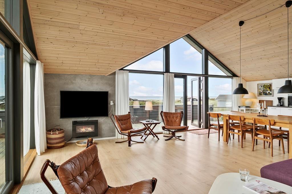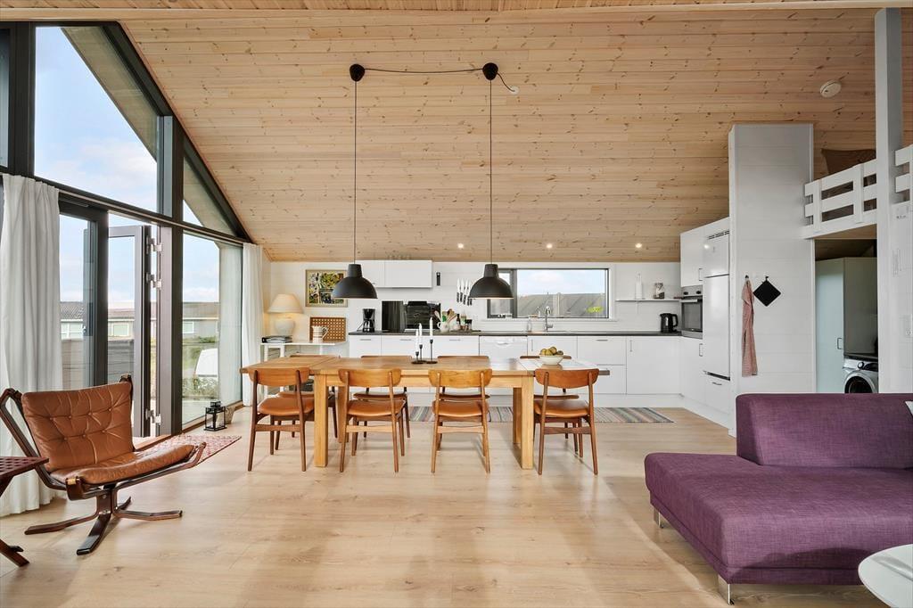 Inden døre bliver du mødt af en behagelig og afslappet stemning, som straks får skuldrene til at sænke sig. De store vinduer inviterer både dagslyset og havudsigten helt ind i stuen, og det åbne opholdsrum er indrettet med sans for detaljerne. Her er bløde tekstiler, kvalitetsmøbler og et indretningstema, der balancerer det moderne med det hyggelige – perfekt til lange, afslappede feriedage. Køkkenet ligger i naturlig forlængelse af stuen, så samværet kan være i centrum, uanset om der laves mad, spilles spil eller blot slappes af i sofaen. De tre soveværelser er indrettet med dobbeltsenge og har en rolig atmosfære, hvor man kan trække sig tilbage og finde fred. Og for børn eller barnlige sjæle venter hemsen, hvor to ekstra madrasser gør det muligt at have en hyggelig hule med udsigt til stjernerne.