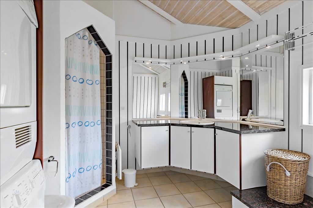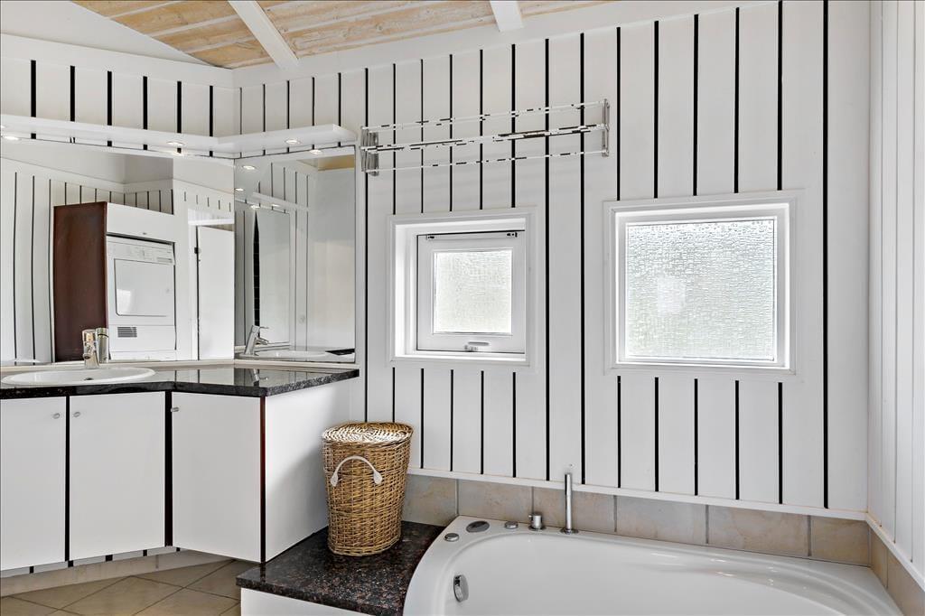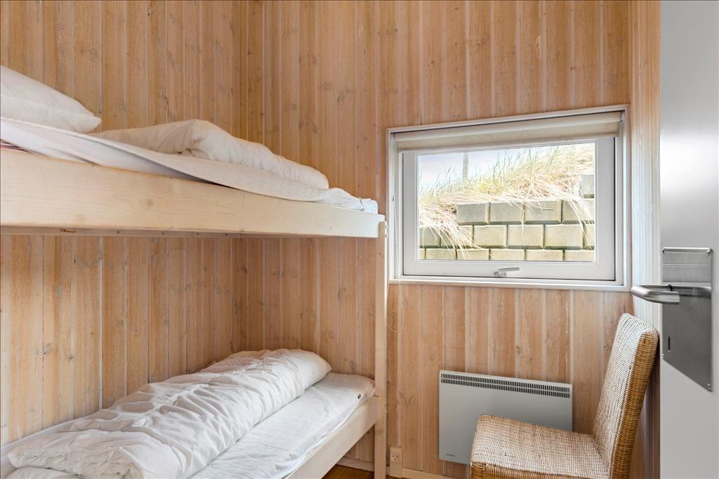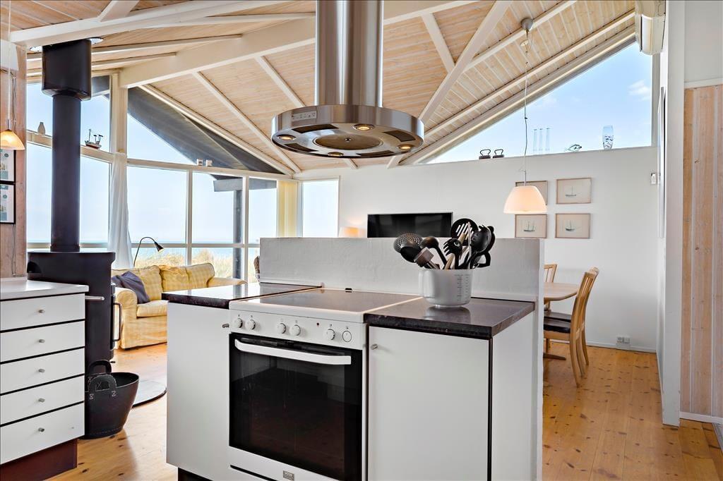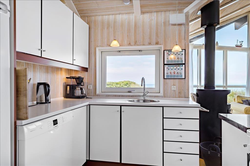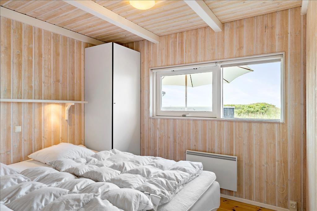 Huset er hyggeligt og venligt indrettet med loft til kip, masser af lys fra de store panoramavinduer og mange fine detaljer. Der er plads til seks overnattende personer, det ene værelse er med køjeseng og derfor oplagt til børn, men huset er også særdeles velegnet til en parferie. På badeværelset er både bruser og spabad, vaskemaskine og tørretumbler, så man hele tiden kan have rent badetøj og tørre håndklæder til alle badeturene. Opholdsrummet består af et åbent køkken, spiseafdeling og en dejlig stue, hvor man kan sidde mange timer i sofaen og nyde den helt formidable udsigt over Vesterhavet gennem vinduerne. Og med ild i brændeovnen kan roen virkelig få lov at sænke sig. Desuden er her installeret gratis og trådløst internet, så det er en god ide at medbringe tablets eller pc. Da huset ligger så tæt på vandkanten, parkerer man bilen ved købmanden og går de 30 meter til huset. Købmanden har åben om sommeren.