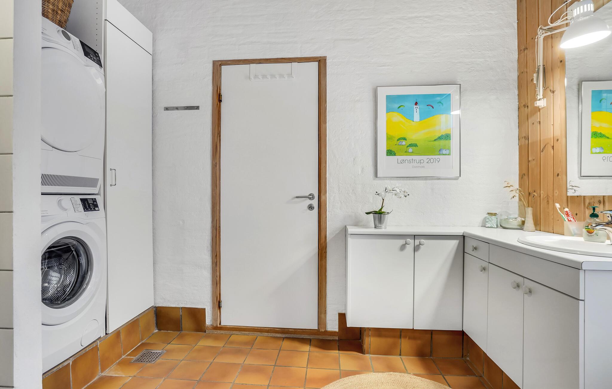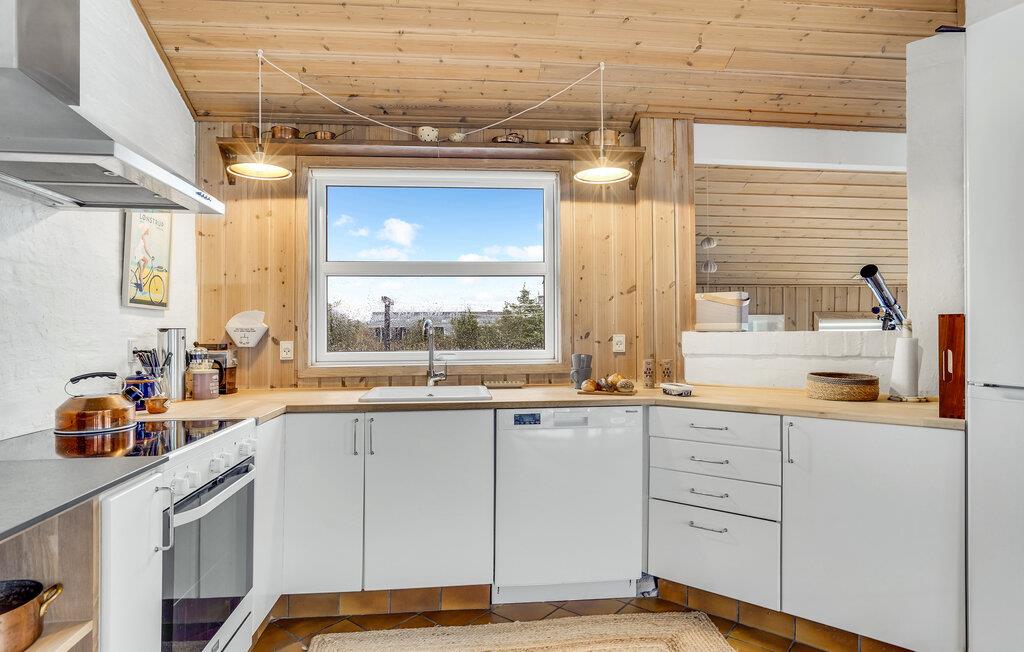 Velkommen til altid charmerende Lønstrup og dette hyggelige sommerhus, som har en lys og åben indretning. Her er der gode forhold til at samles i store luftige lokaler og gøre lige det, man slapper bedst af med. Mens de voksne gør aftensmaden klar, kan børnene spille brætspil eller tegne ved spisebordet, lige som I til enhver tid kan tænde op i brændeovnen på en kølig dag, hvor det regner og rusker udenfor. Efter en lang, frisk gåtur ved Vesterhavet er det også rart at få varmen i husets sauna.