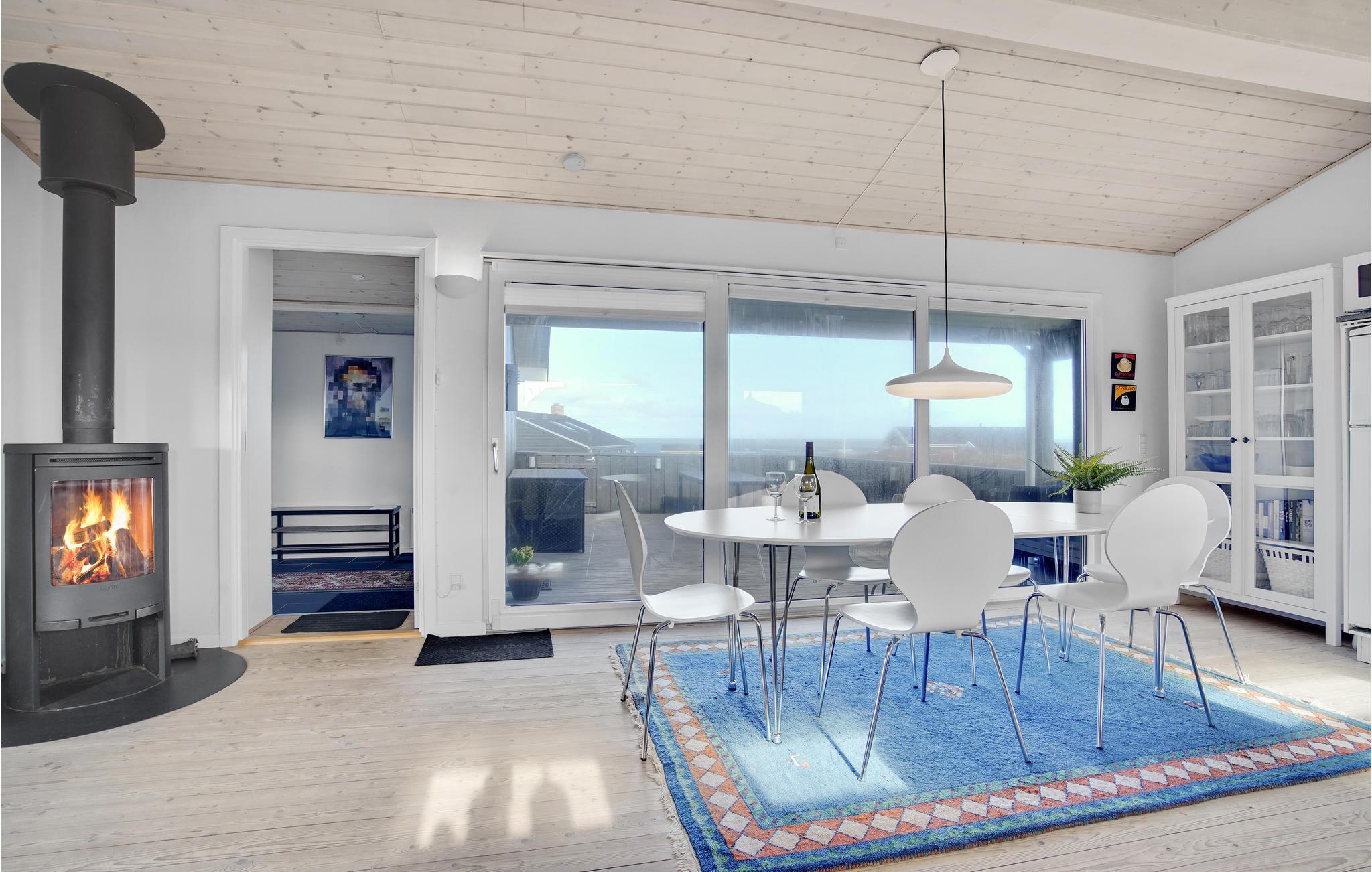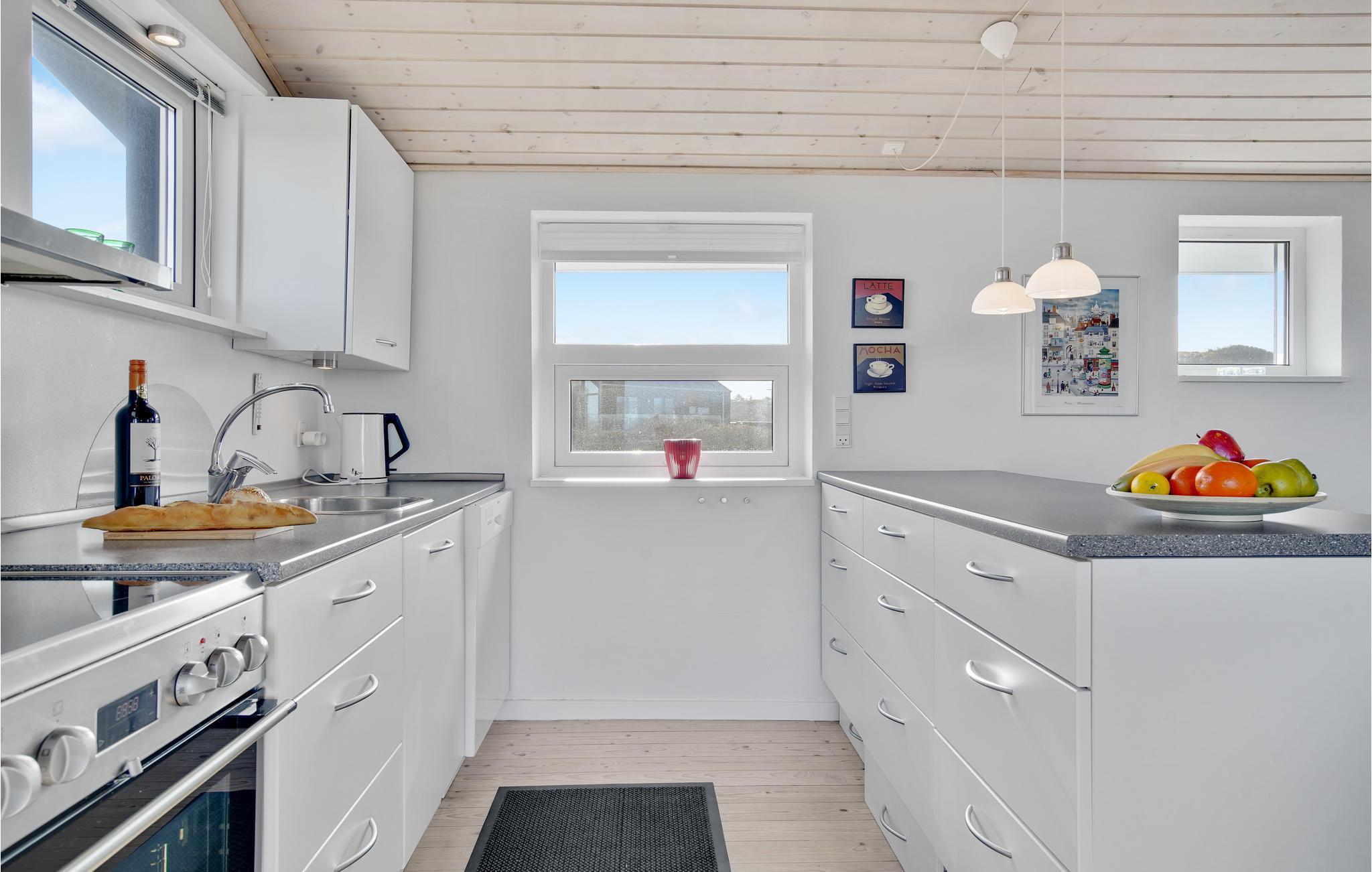 Fra dette fantastiske feriehus der ligger højt i klitterne, er der den mest fantastiske udsigt over havet og ligeså imponerende udsigt over området. Huset er gennemmoderniseret og udvidet, så her nu er en rummelig entre med garderobe, med døre ind til to soveværelser med faste skabe. Der er et lyst og moderne badeværelse. Husets hjerte er stuen og køkkenet i åben forbindelse. I stuen skaber loft til kip en skøn luftig fornemmelse. Det praktiske køkken er holdt i hvidt. Rundt om huset findes der lækre terrasser med små hyggekroge, så her altid er læ, skygge eller sol. I bor ikke langt fra Lønstrup by, der er kendt for hyggeligt bymiljø med kunsthåndværkere, cafeer og Skallerup Seaside Resort.