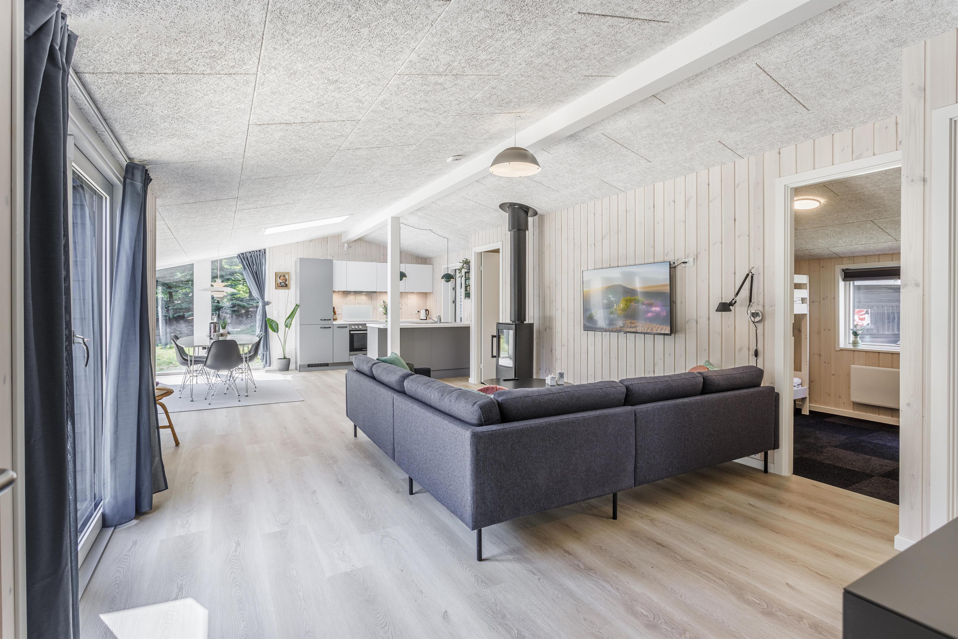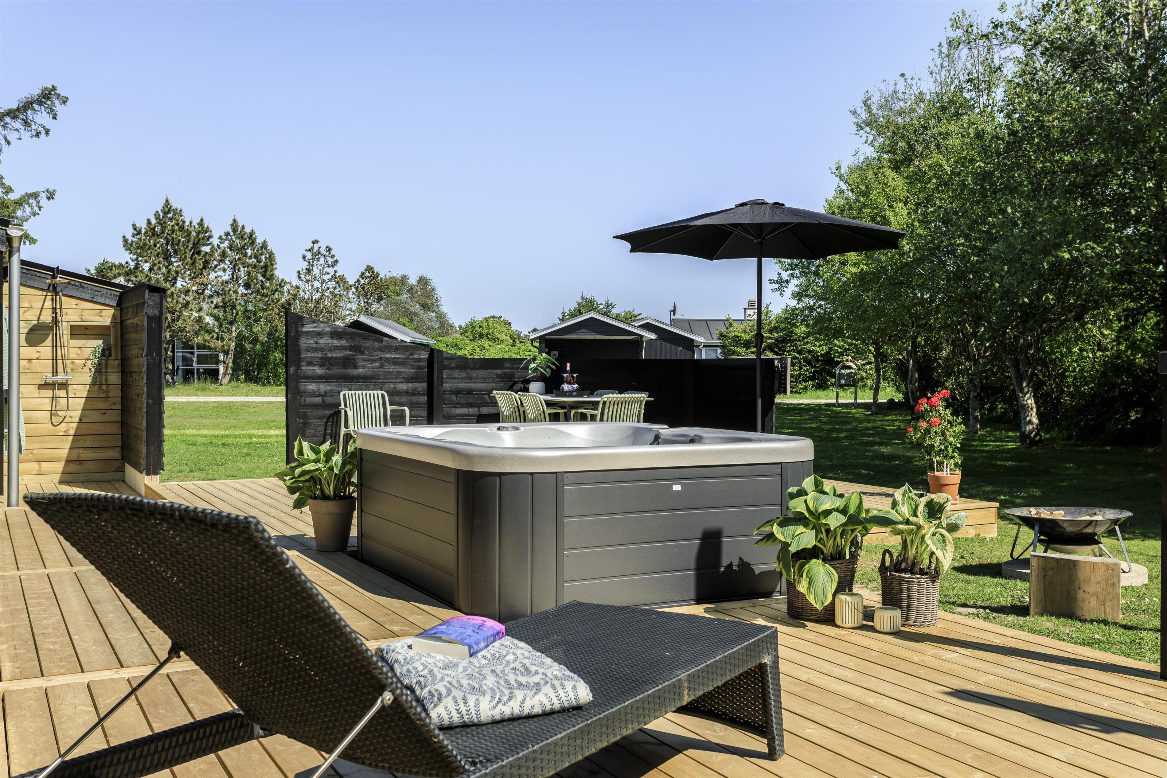 Prioriterer I frisk luft, luksus og komfort i jeres ferie, er dette helt nye feriehus det oplagte valg. Huset er yderst velindrettet både inde og ude. Her er højt til loftet og store gulv-til-loft-vinduespartier, som byder lyset ind i rummet. Feriehuset er indrettet med tre gode soveværelser samt et skønt badeværelse med gulvvarme. Dertil kommer et dejligt og rummeligt opholdsrum i åben forbindelse med køkkenet. Her er alt, hvad der skal bruges for en vellykket ferie. Der er rig mulighed for at samles omkring spisebordet til en spilaften eller sætte en god film på tv'et, hvis ikke vejret tillader, at man nyder de skønne terrasser, der omkranser huset. Fra opholdsrummet er der adgang til flere skønne terrasseområder, så der er rig mulighed for at følge solens stråler hele dagen lang eller søge læ for den til tider barske vestenvind. Tag en pause på solsengen med en god bog, eller hop i boblerne i det udendørs spabad og nyd vandmassagen og varmen herfra.