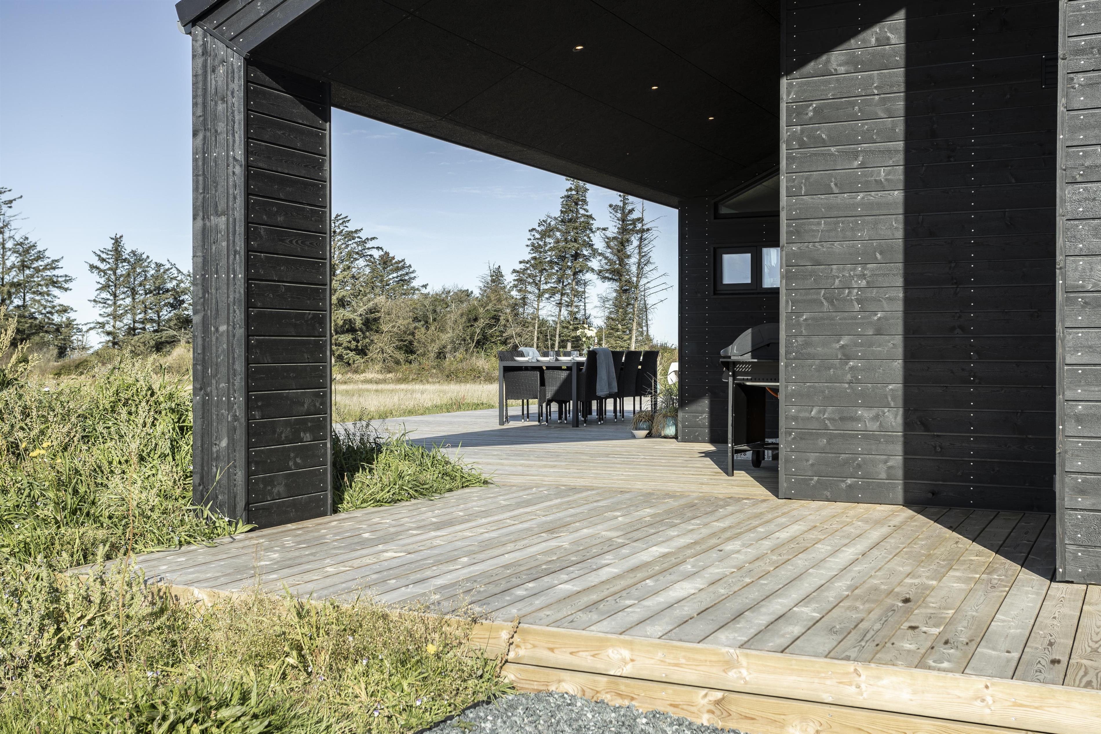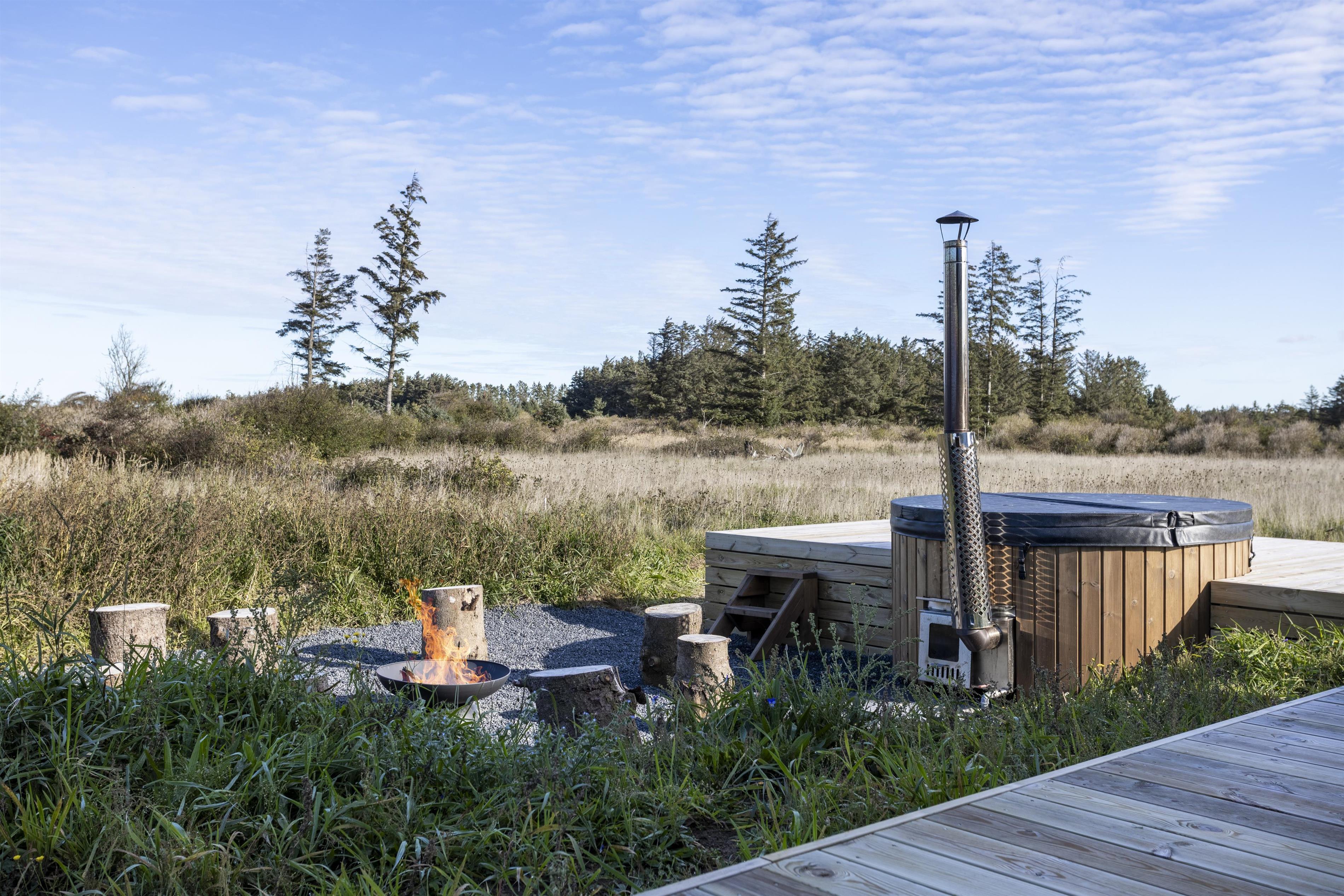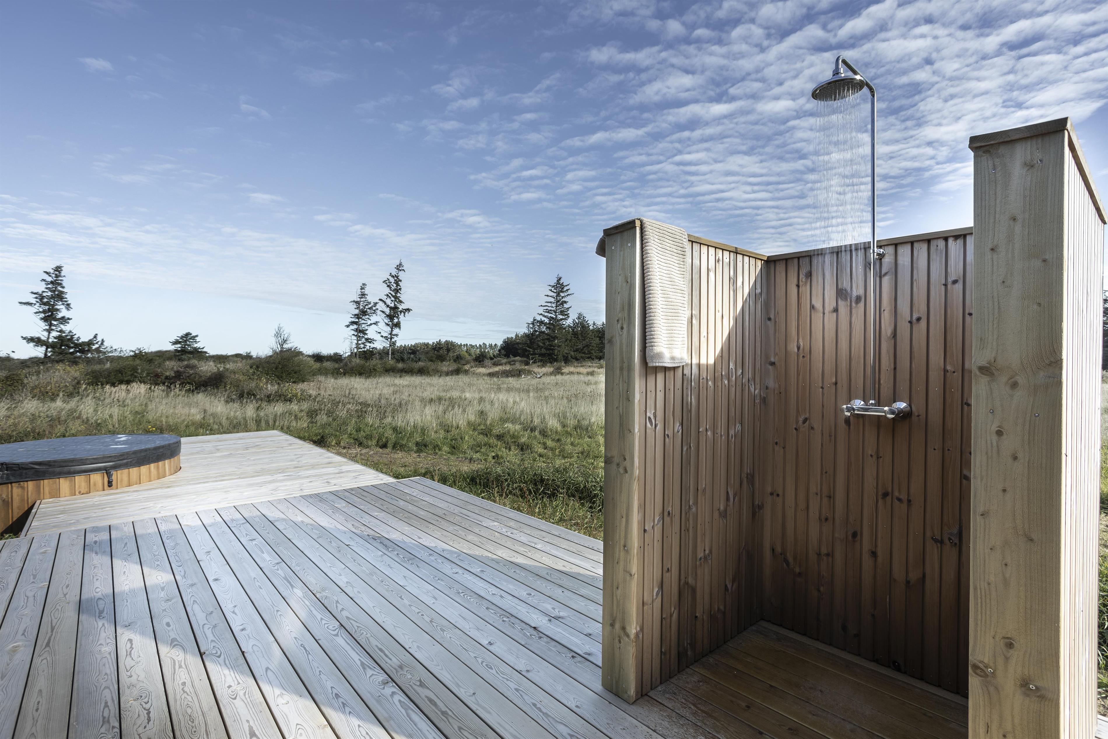 Terrassen løber hele vejen rundt om huset, og I finder flere hyggelige kroge, hvor I kan slappe af med en kop kaffe eller en god bog ganske ugeneret. Om aftenen kan I krybe ind under den overdækkede terrasse og nyde den lune sommeraften, selvom duggen begynder at falde. Fra terrassen har I direkte adgang til vildmarksbadet, samt den udendørs bruser. Fra vildmarksbadet kan I nyde den ugenerede natur og måske få besøg af et rådyr eller fasanen på sin søgen efter mad. Ved siden af vildmarksbadet er der lavet en hyggelig bålplads, så der er lagt op til lejrbål, sang og skumfiduser når mørket begynder at sænke sig.