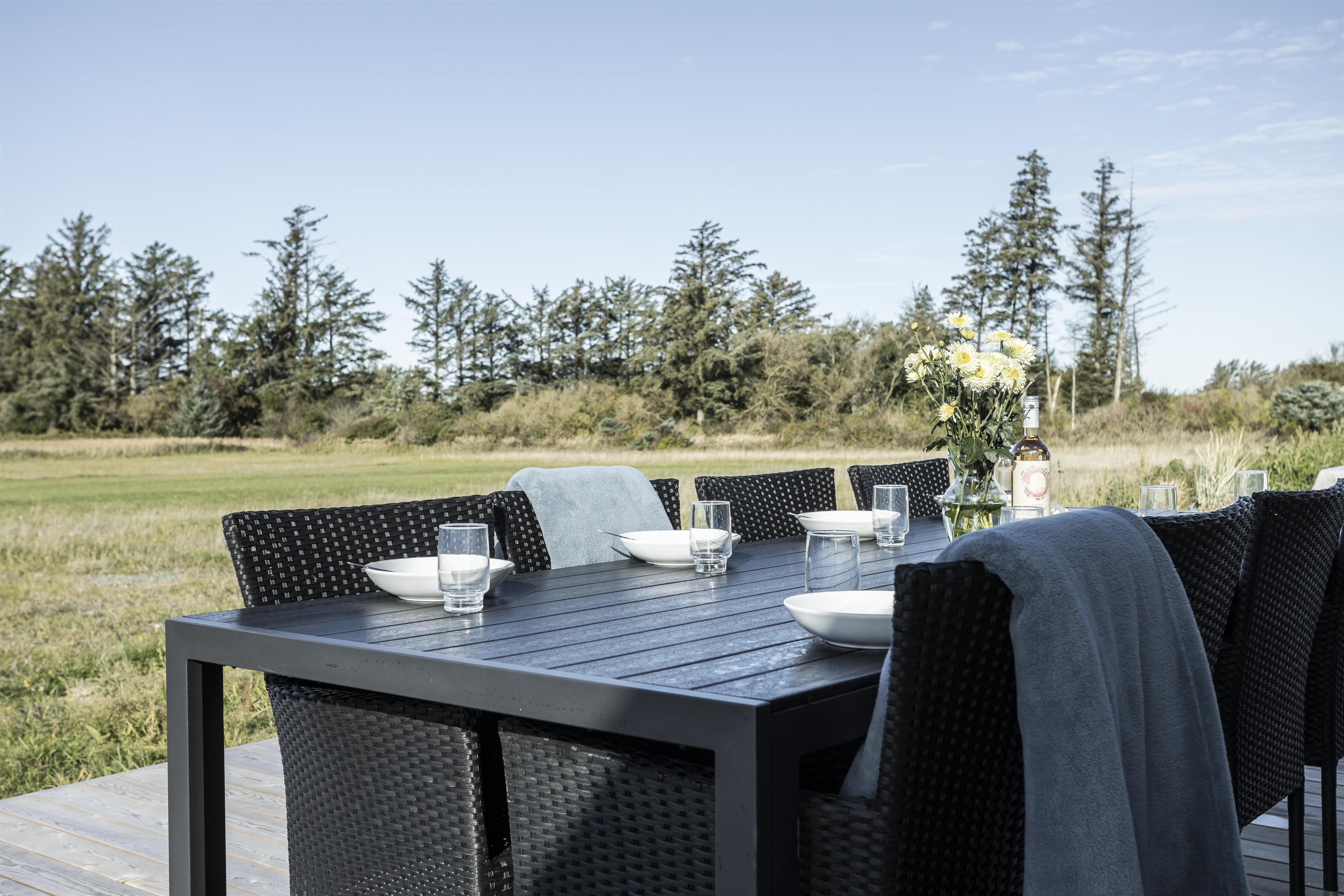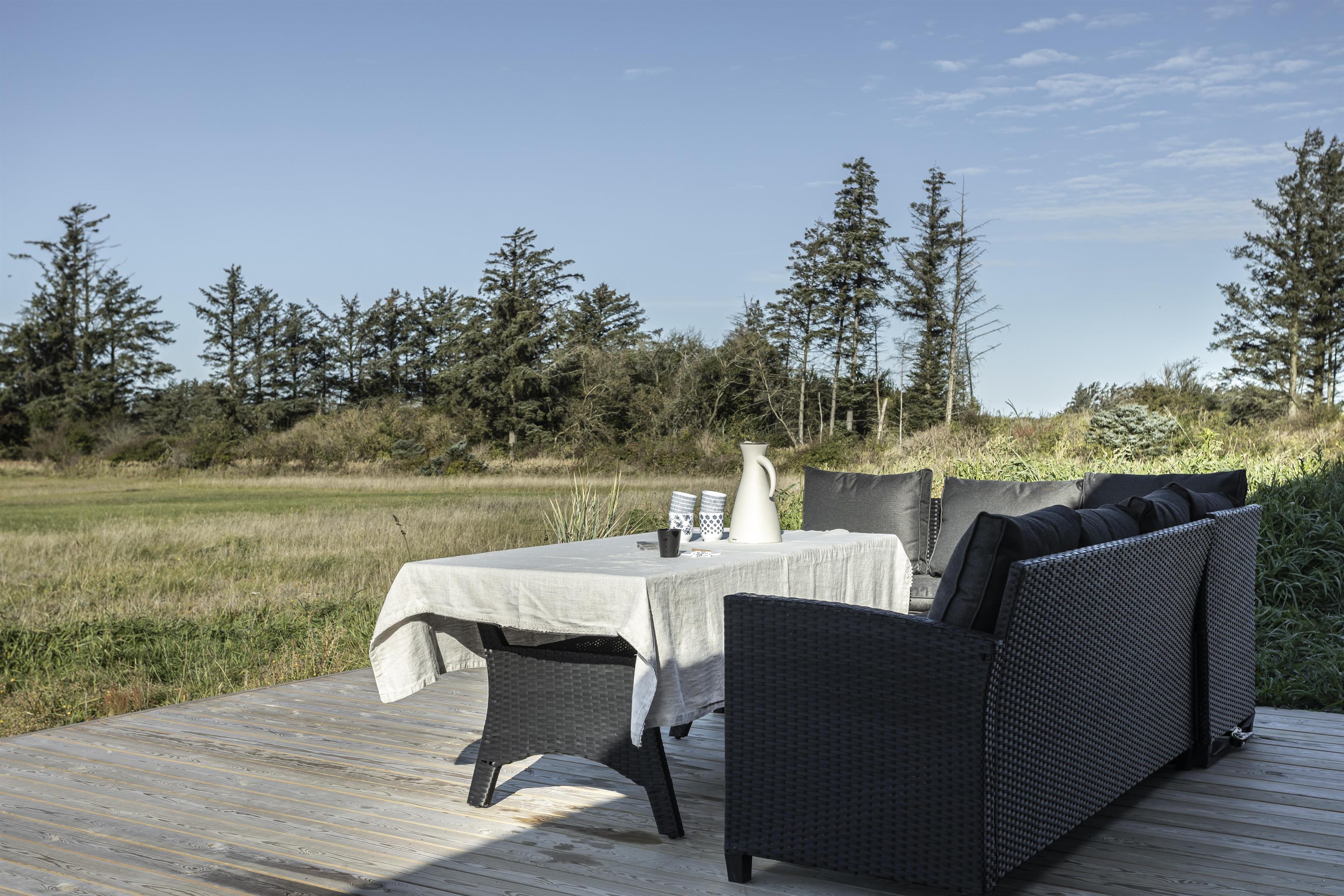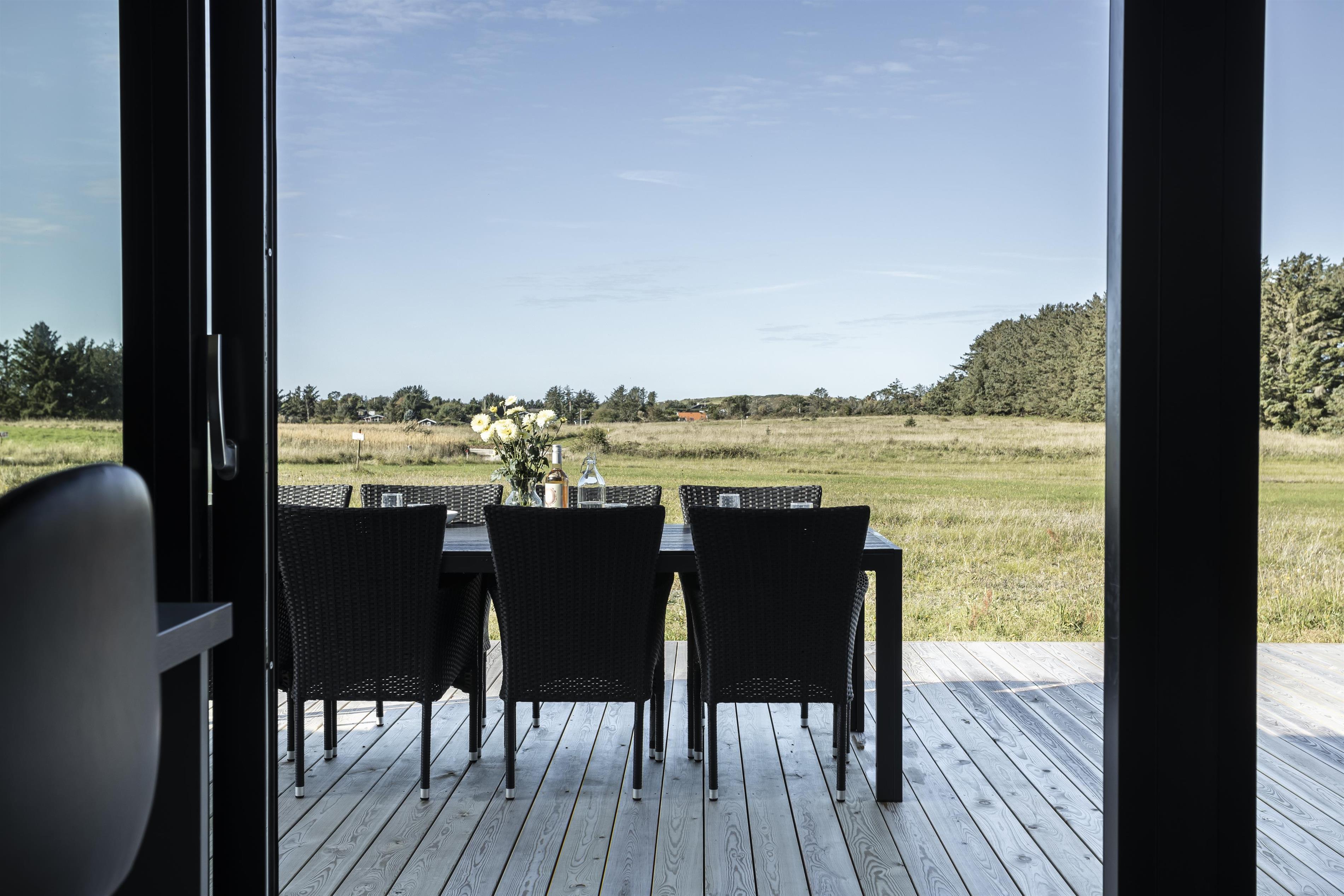 Terrassen løber hele vejen rundt om huset, og I finder flere hyggelige kroge, hvor I kan slappe af med en kop kaffe eller en god bog ganske ugeneret. Om aftenen kan I krybe ind under den overdækkede terrasse og nyde den lune sommeraften, selvom duggen begynder at falde. Fra terrassen har I direkte adgang til vildmarksbadet, samt den udendørs bruser. Fra vildmarksbadet kan I nyde den ugenerede natur og måske få besøg af et rådyr eller fasanen på sin søgen efter mad. Ved siden af vildmarksbadet er der lavet en hyggelig bålplads, så der er lagt op til lejrbål, sang og skumfiduser når mørket begynder at sænke sig.