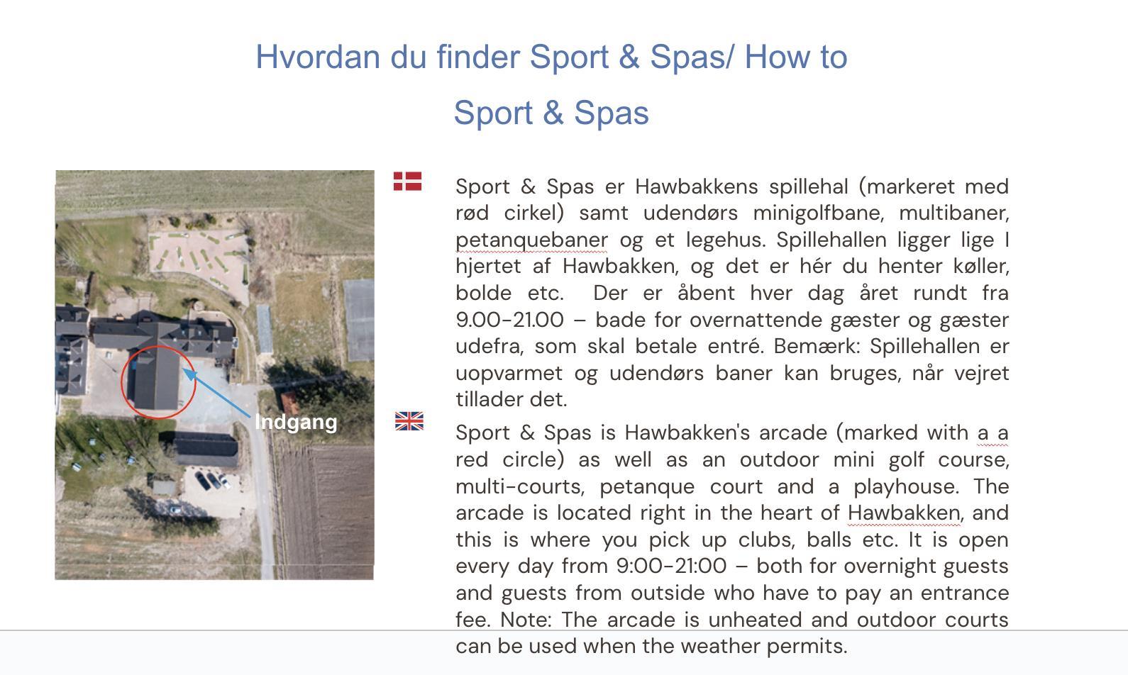 Sport og Spas er gratis for gæster, der overnatter på Hawbakken, mens gæster udefra kan købe sig adgang for 75 kr. om dagen. Man er selv ansvarlig for at holde orden og passe på tingene af hensyn til andre gæster. Her er åbent hver dag året rundt fra 9.00-21.00 – bade for overnattende gæster og gæster udefra, som skal betale entré. Bemærk: Spillehallen er uopvarmet og udendørs baner kan bruges, når vejret tillader det.