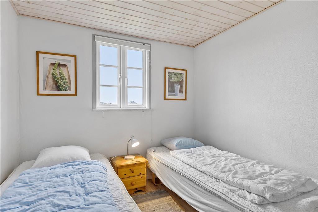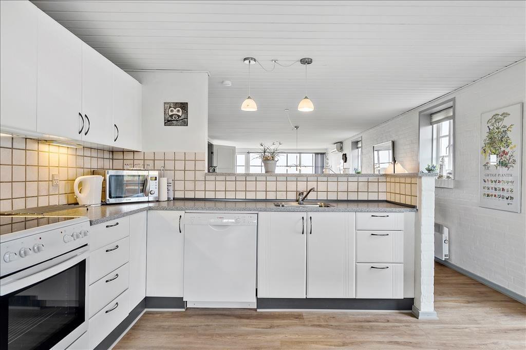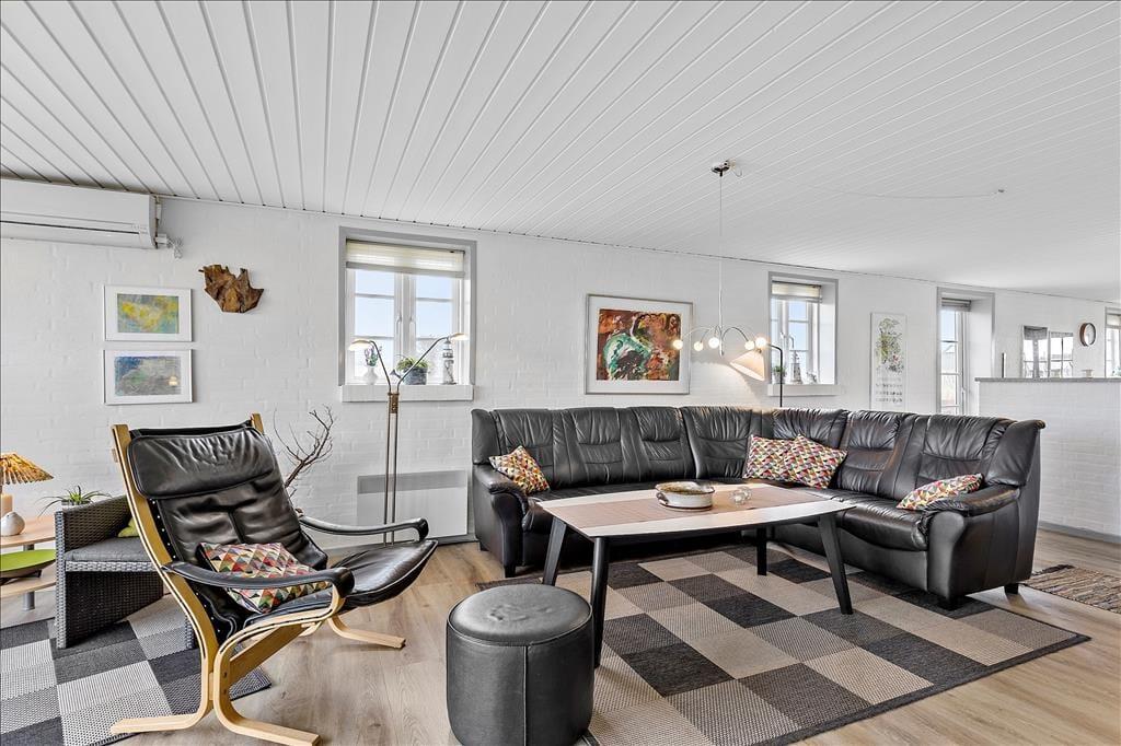 Ikke kun udsigten er flot, for selve sommerhuset er gennem moderniseret og indrettet på stilfuld vis. Atmosfæren er lys og let, ikke mindst i opholdsrummet, hvor der er hvide, vandskurede vægge og vinduer vendt mod tre verdenshjørner. I opholdsrummets ene ende ligger et veludstyret køkken med spiseplads, og herfra er der åben forbindelse til sofaafdelingen, der udover bløde siddemøbler byder på brændeovn og TV med DVD og parabol. Når I slapper af her, kan I beundre den flotte naturudsigt, som det store, østvendte gavlvindue åbenbarer. Også husets øvrige rum er velindrettede: De tre soveværelser er alle udstyret med bløde dobbeltsenge og god skabsplads, mens de to komplette badeværelser giver jer en lækker ramme om morgenbrusebadet. På det ene badeværelse er der endda installeret et spabad, så dagen kan afsluttes med en afslappende wellnessseance.