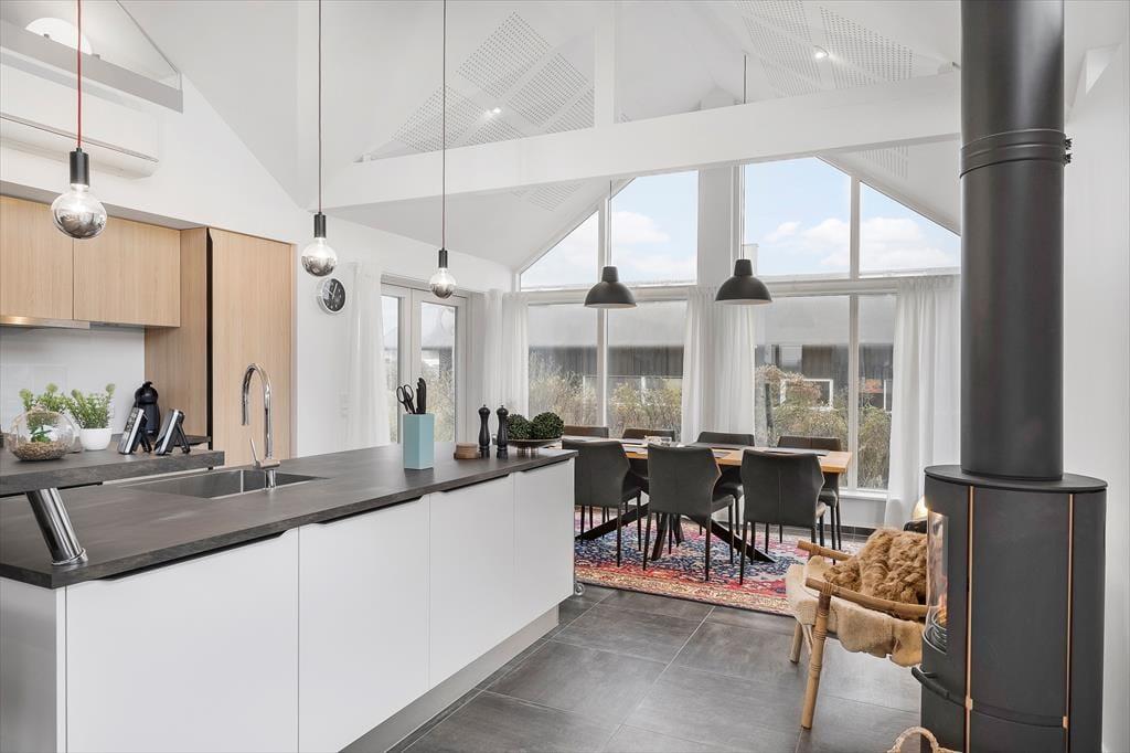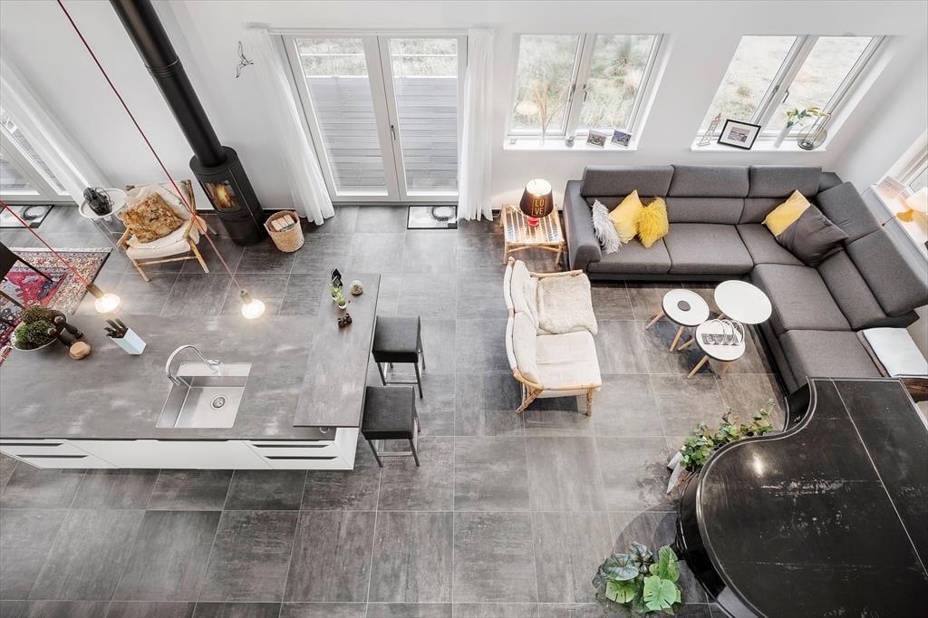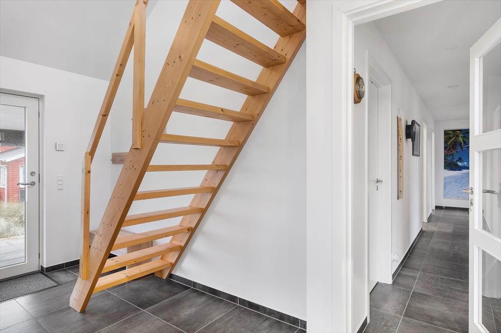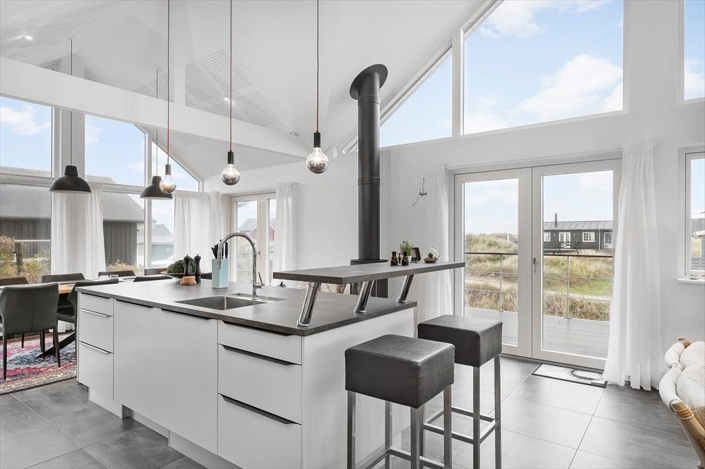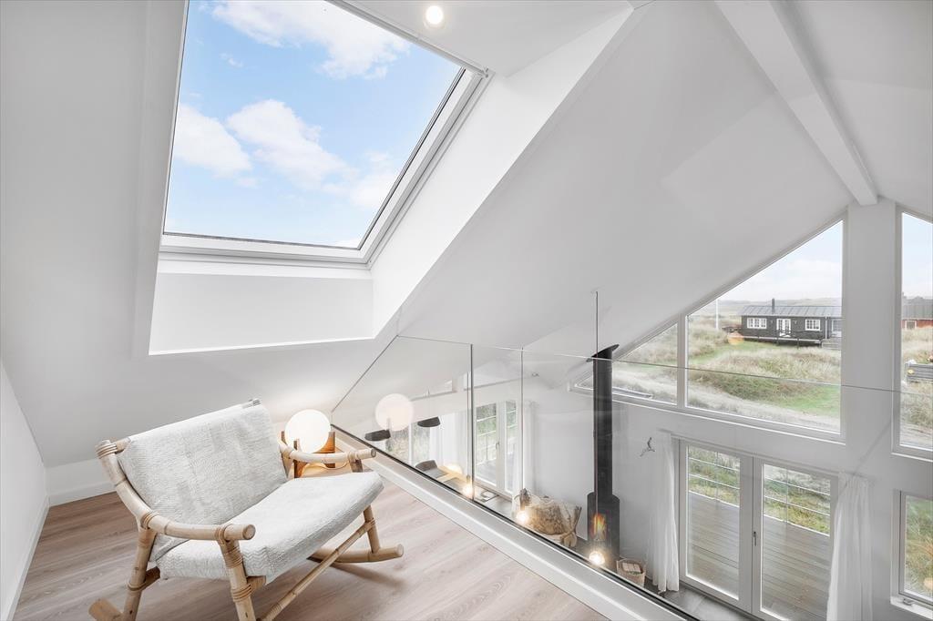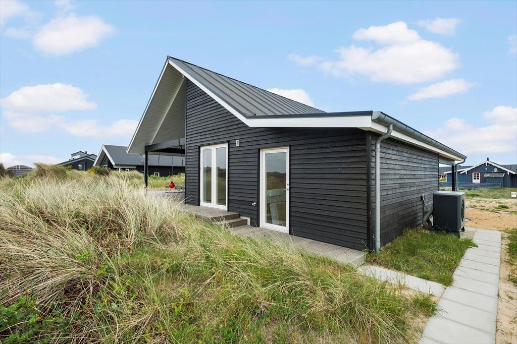 Det 120 m² store sommerhus er bygget i 2022, så du kan se frem til at holde ferie i rummelige og moderne rammer. Med tre gode soveværelser og to badeværelser passer planløsningen godt til seks personer. Alle soveværelser er indrettet med komfortable senge og garderobeskabe, og du har direkte adgang til terrassen, hvis du vil starte morgenen med at strække dig i den friske luft. Begge badeværelser er flotte, men du skal især lægge mærke til det største, der er udstyret med en skøn sauna. Bemærkelsesværdig er bestemt også opholdsafdelingen, hvor stue og køkken ligger i åben forbindelse. Her kan du lave mad og slappe af i stilfulde omgivelser – eventuelt med varme fra brændeovnen og varmepumpen, hvis vejret indbyder til det. Store vinduespartier inviterer dagslyset indenfor og giver udsigt til klitlandskabet, og hvis du virkelig vil nyde udsigten, kan du tage trappen op til stuens udsigtshems.