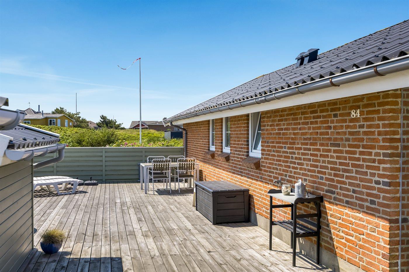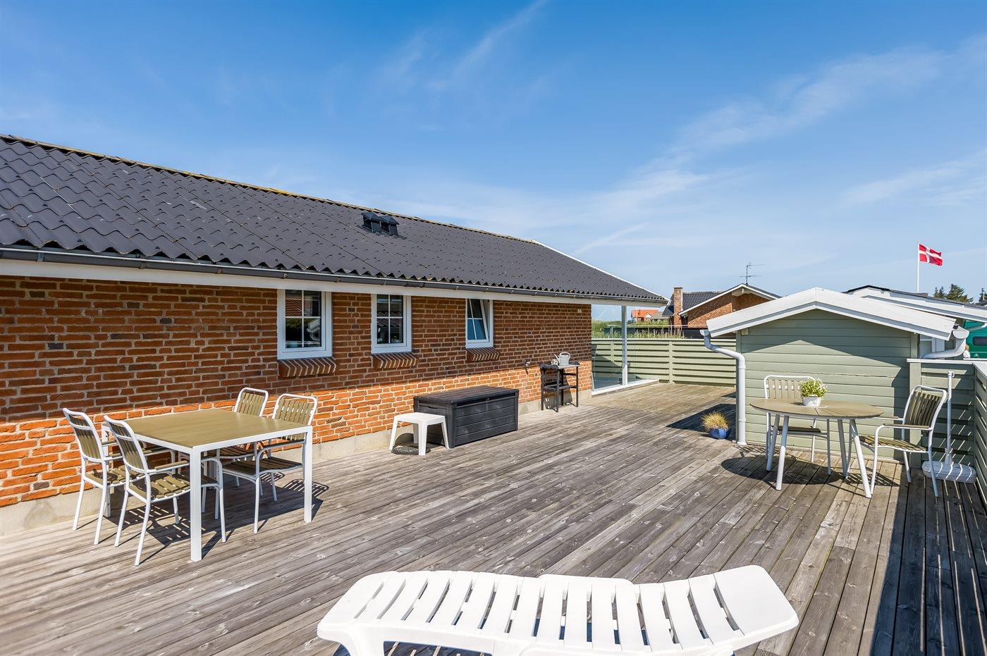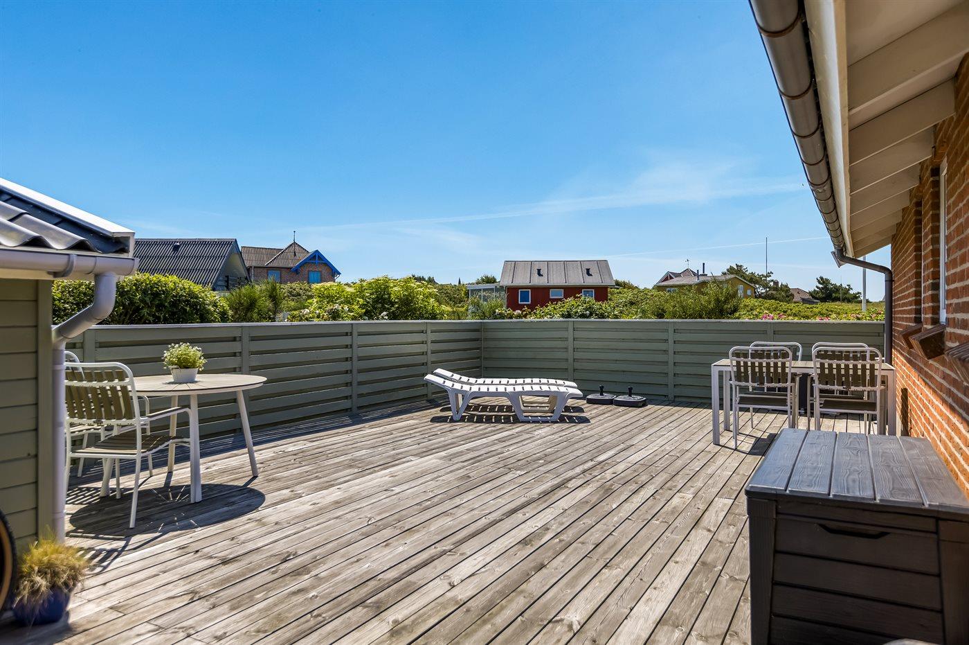 Den store terrasse omkranser hele huset, så du kan starte dagen med at nyde en kop kaffe i morgensolen på den østvendte terrasse og i løbet af dagen flytte dig i takt med solen over på den sydvendte terrasse. Her kan du tilbringe dejlige timer med en god bog, en krydsogtværs eller med at spise et måltid i det fri. Når solen går ned, kan du nyde solnedgangen over Rømøs flotte klitlandskab fra første parket.