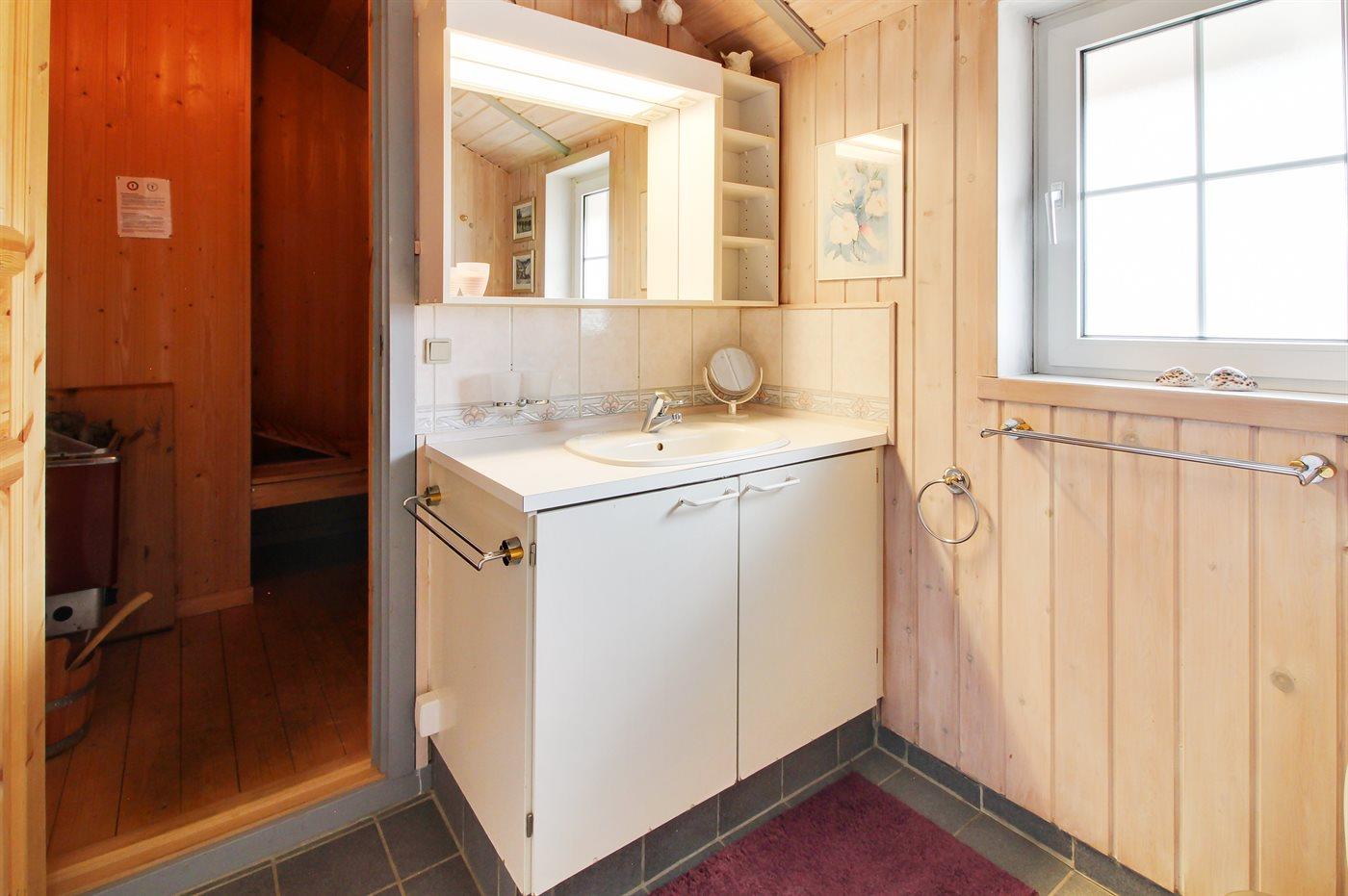 Der er 1 badeværelse med bruseniche og 1 toilet.. Der er gulvvarme på 1 badeværelse. I saunaen er der mulighed for afslapning.