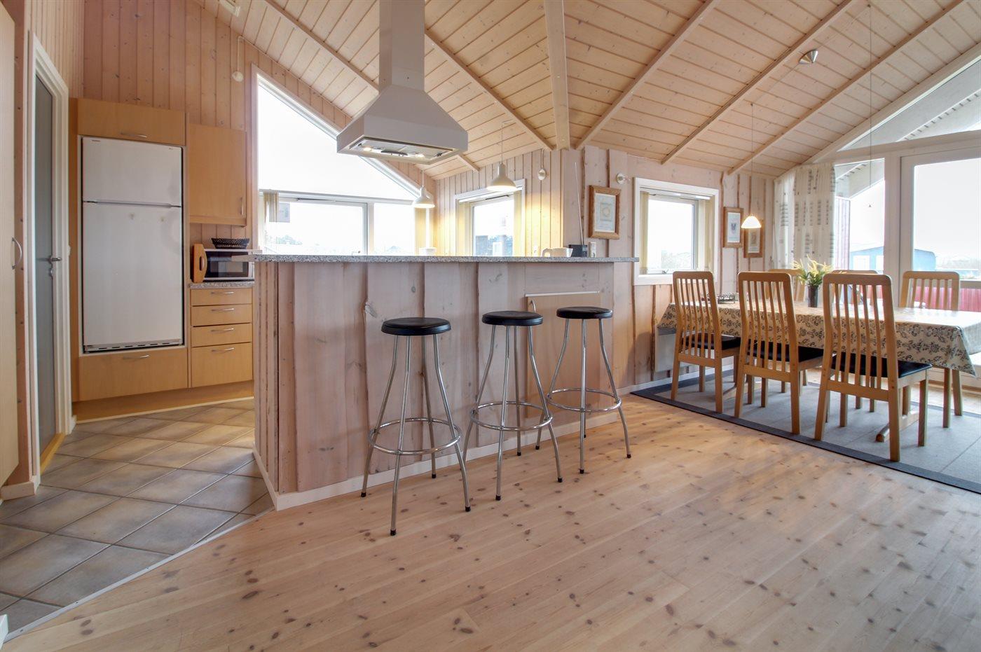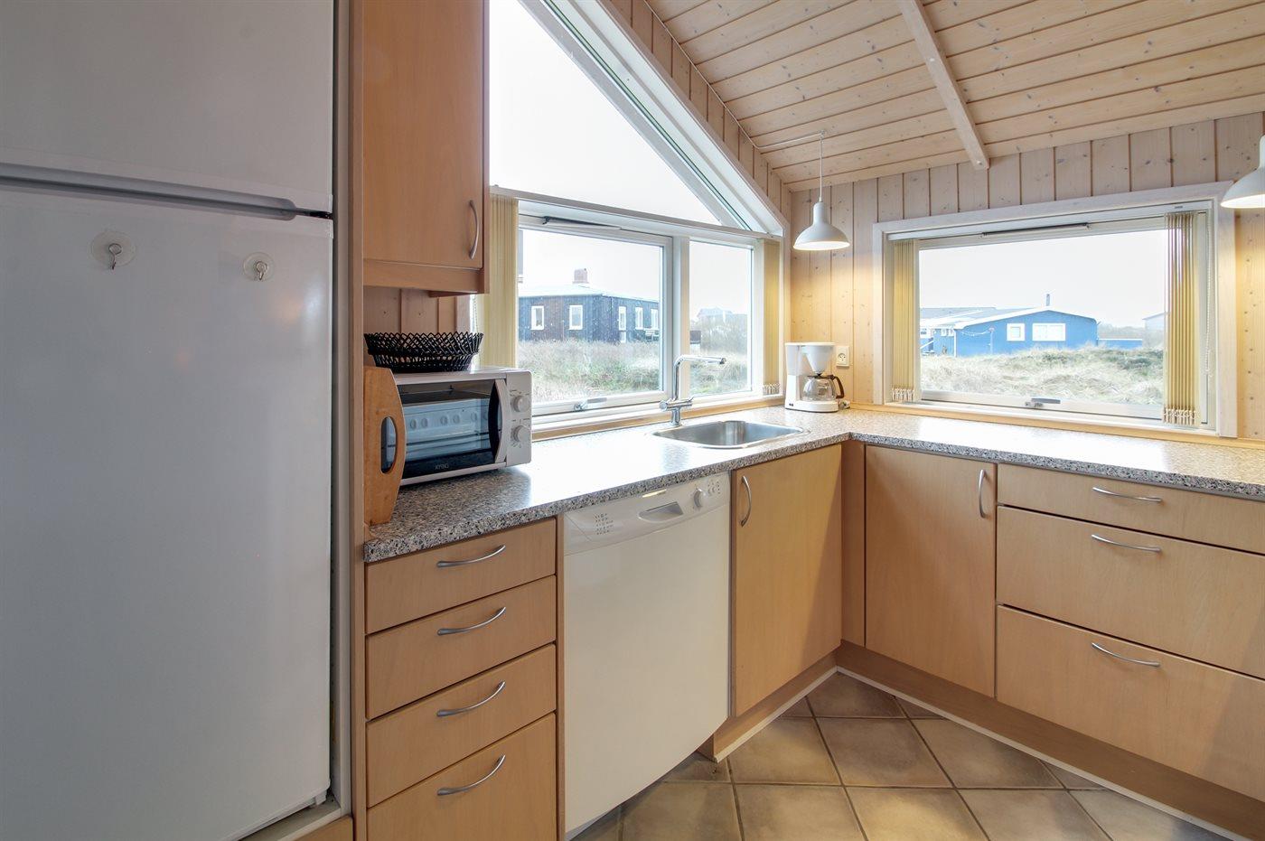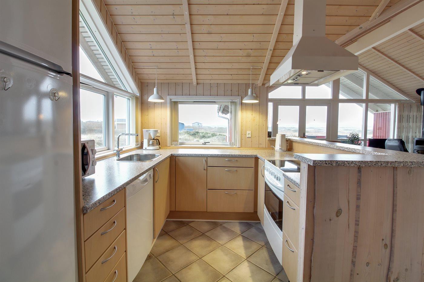 Køkkenet er udstyret med 1 køleskab. Der er 4 keramiske kogeplader, varmluftovn, mikrobølgeovn samt opvaskemaskine Der er gulvvarme i køkkenet.