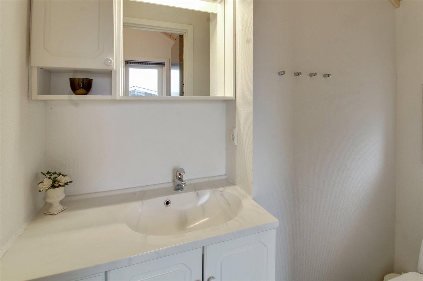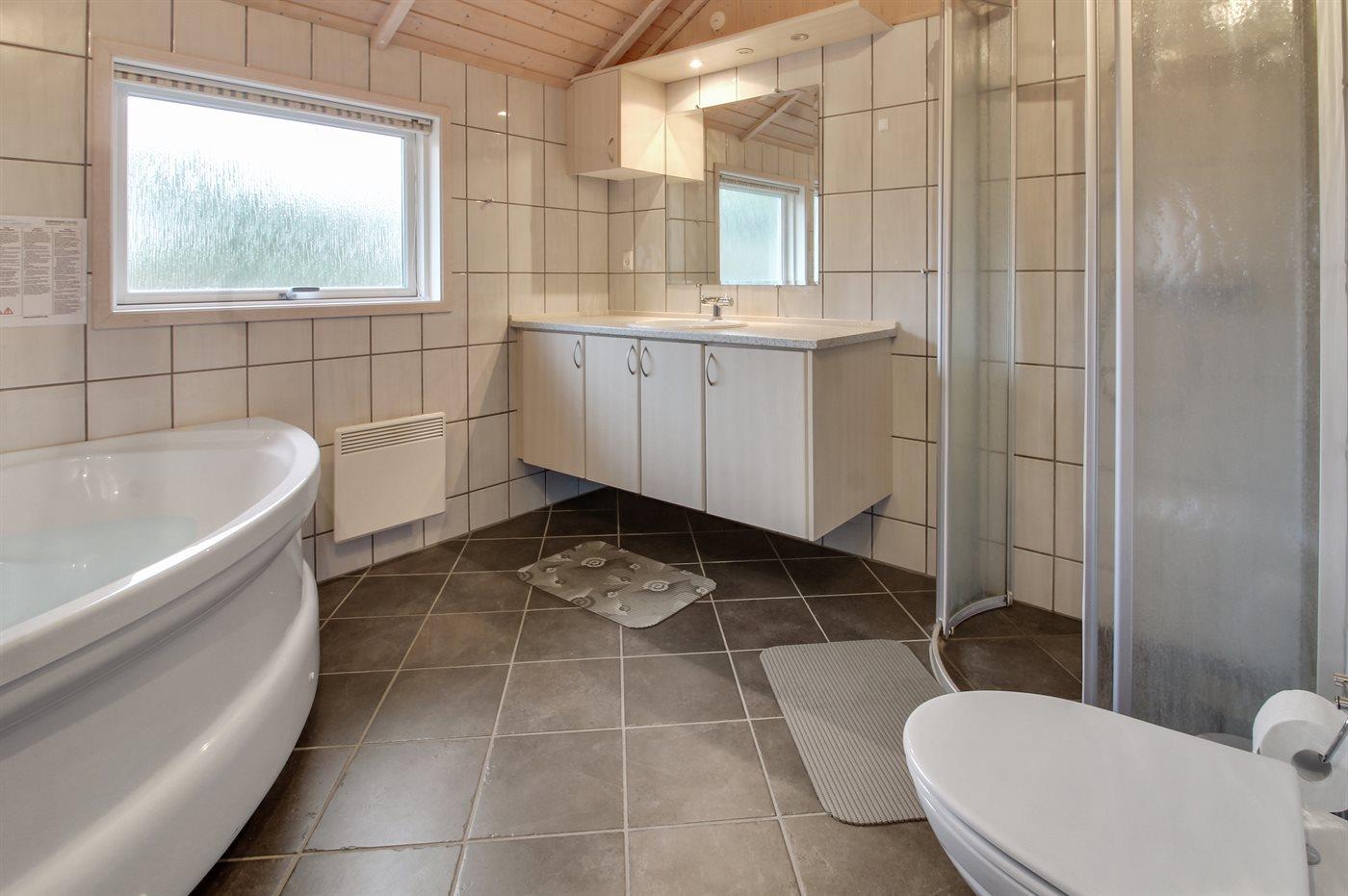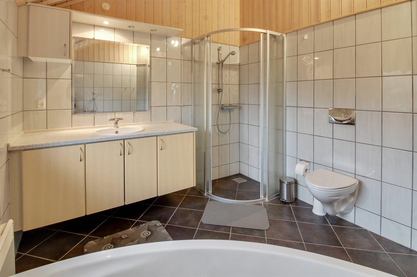 Der er 1 badeværelse med bruseniche og 2 toiletter, heraf 1 gæstetoilet. Der er gulvvarme på 2 badeværelser.