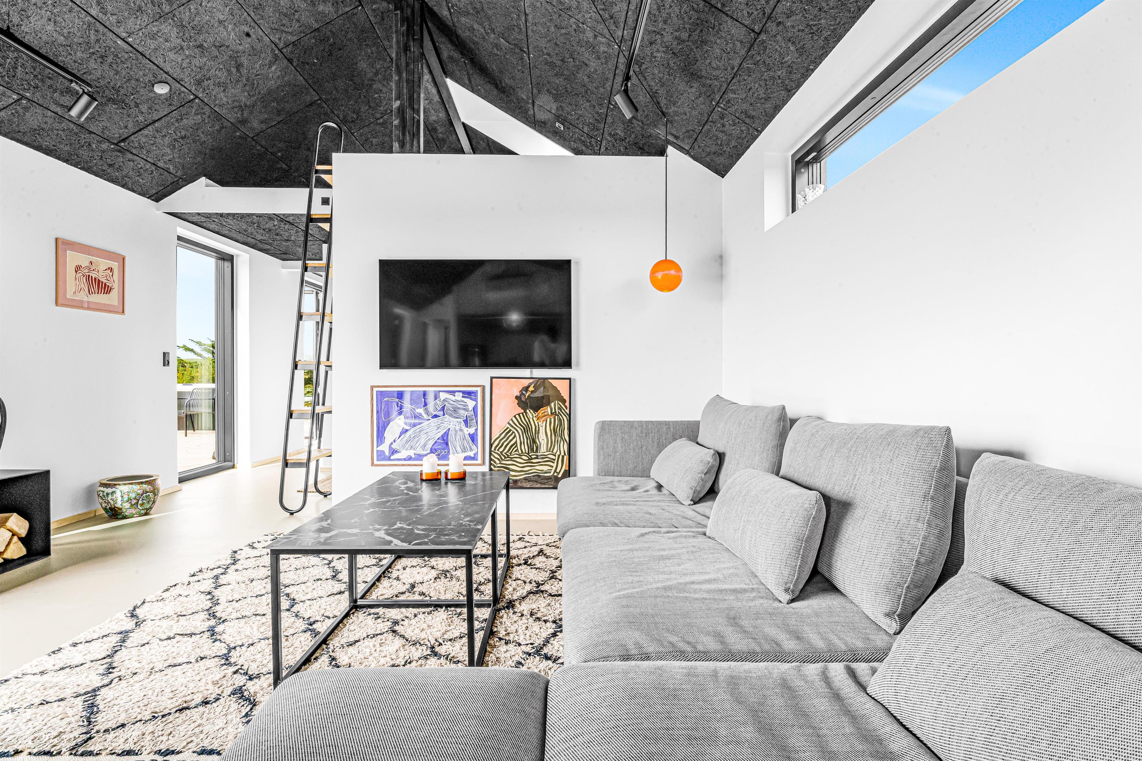 Fra entréen kommer man direkte ind i husets kernerum, som er en kombineret opholdsstue og køkken med høje lofter. Her er der plads til at alle husets gæster kan samles og nyde hinandens samvær. Nævneværdigt er feriehusets indretningsstil og materialesammensætning. Køkkenet består af egetræsfiner med stålbordplade og i hele opholdsrummet er der et blødt Epoxy PU-gulv. Køkkenet er udstyret med blandt andet køle-/fryseskab, opvaskemaskine, indbygningsovn, glaskeramiske kogeplader, emhætte og mikroovn. Her er alt, hvad man skal bruge til en ferie ved Vesterhavet. Stuehjørnet indbyder til filmhygge, da den er indrettet med lædermøbler og fjernsyn med den store pakke af fibernet-TV altså både danske og tyske kanaler. Desuden er der en Chromecast, hvorfra man kan streame egne streamingtjenester. Opholdsrummet kan opvarmes ved hjælp af en brændeovn, der skaber hygge og kan varme hele huset op på selv en kold og trist vinterdag.