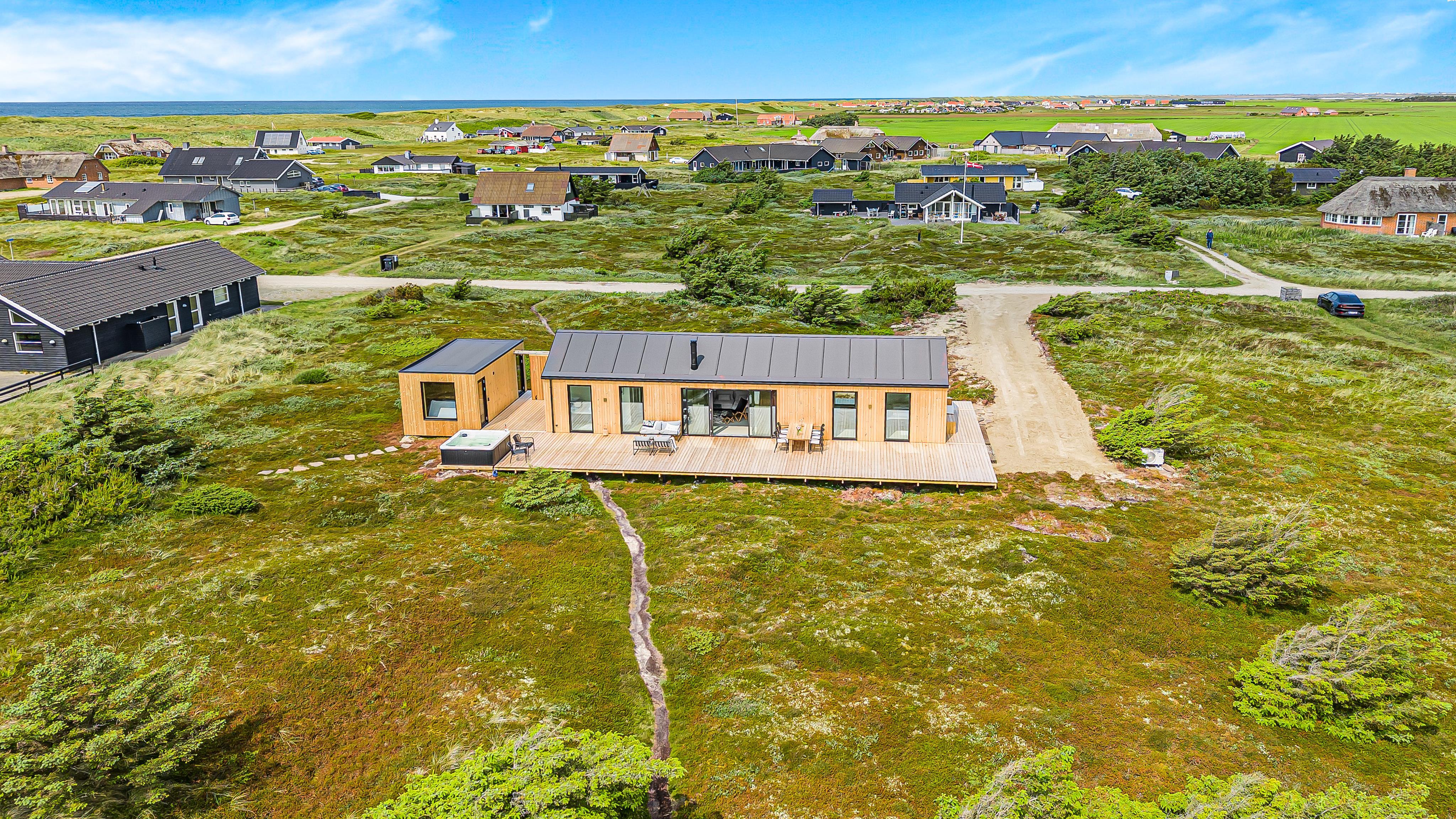 Feriehuset ligger på en 2500 m2 stor kuperet naturgrund, hvor udearealerne er et kapitel for sig selv. Huset er omkranset af en 110m2 stor træterrasse med udendørs wellnessområde. Her kan man hoppe en tur i den lækre udendørsspa. Har man været en tur i havet, kan man skylle sig af i udendørsbruseren og derefter varme sig igennem i udendørssaunaen. Desuden indbyder terrassen med havemøbler, solvogn og grill til hyggelige stunder med de nærmeste. Afstanden til det brusende Vesterhav er ganske kort – der er ikke mere end 200 meter, så står man og nyder den fabelagtige udsigt over det levende maleri Vesterhavet. Husets beliggenhed betyder at man kan være i Harboøre by på gåben på ganske få minutter, hvor der findes indkøbsmuligheder, spisemuligheder samt en masse aktiviteter for børnene. Ikke langt fra Vrist kommer man i bil hurtigt til havnebyerne Lemvig og Thyborøn, hvor man kan nyde en is på havnen, købe frisk fisk eller shoppe i de lokale butikker. Eller man tager det lille VLTJ-tog, hvortil man kan få gratis togbilletter på SJ’s kontor til at køre mellem Lemvig og Thyborøn.