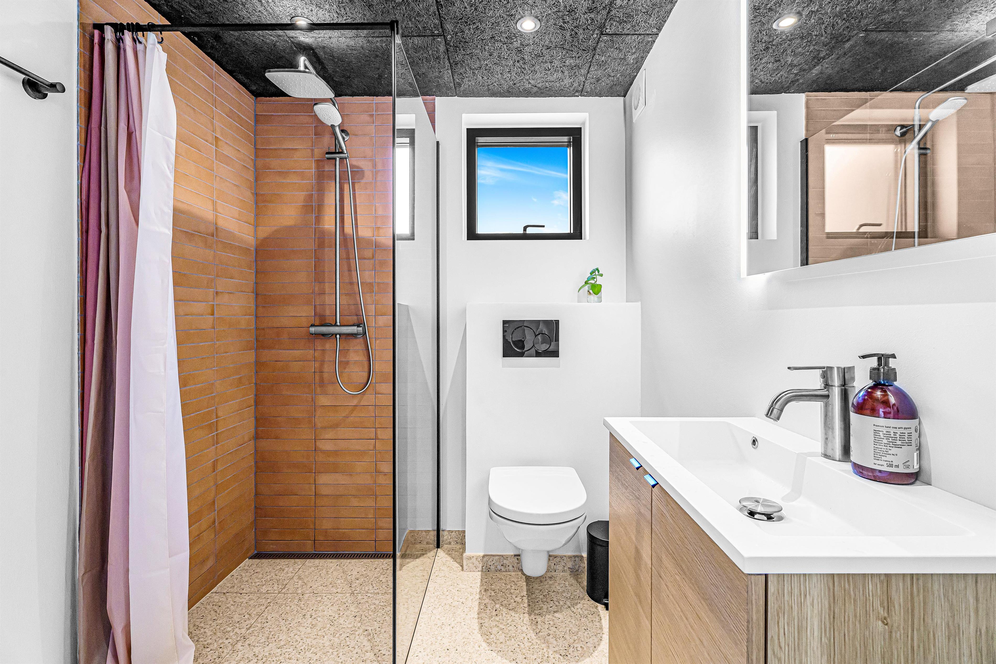 Huset har et lækkert badeværelse med toilet, håndvask, bruser og opvarmes med gulvvarme.
