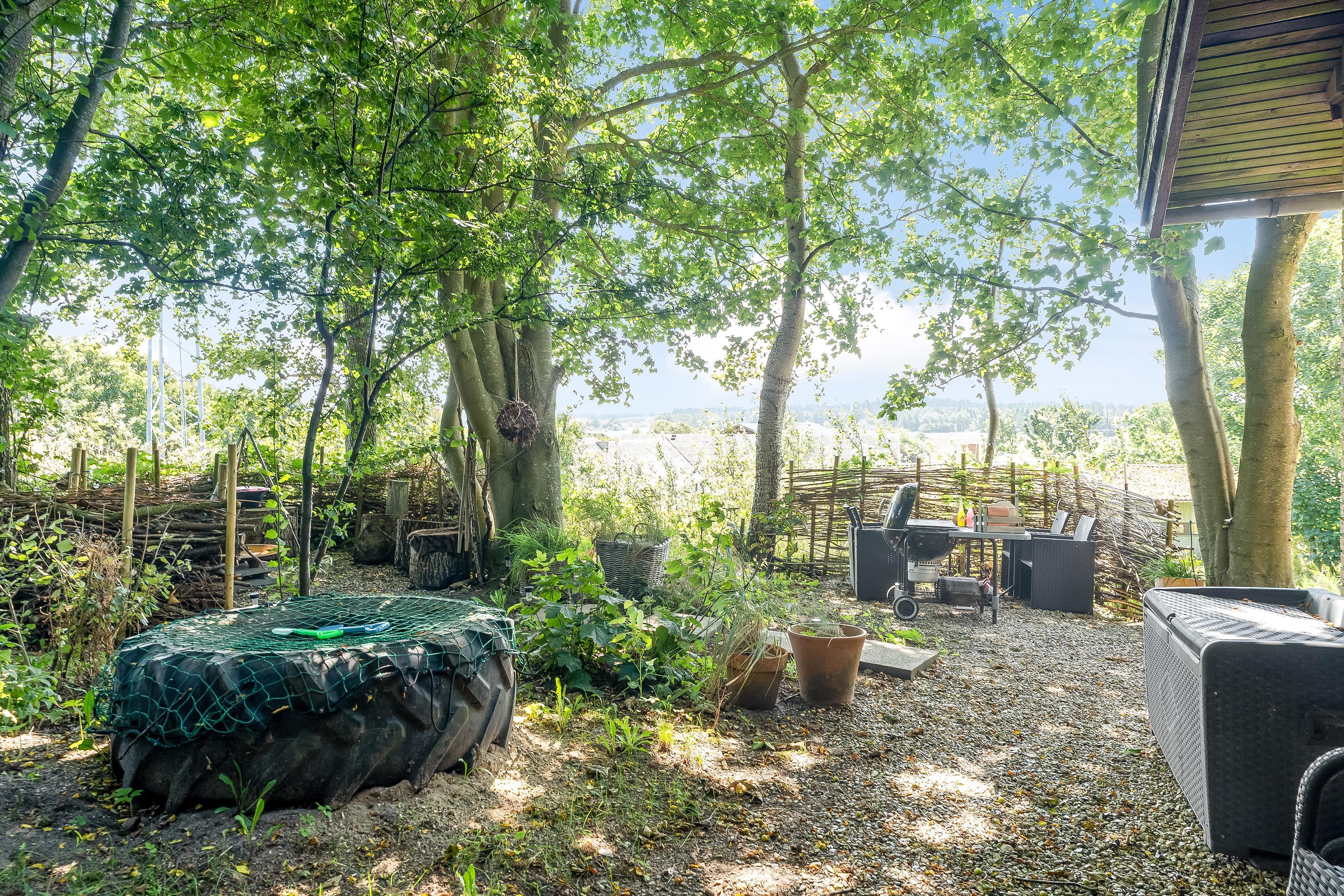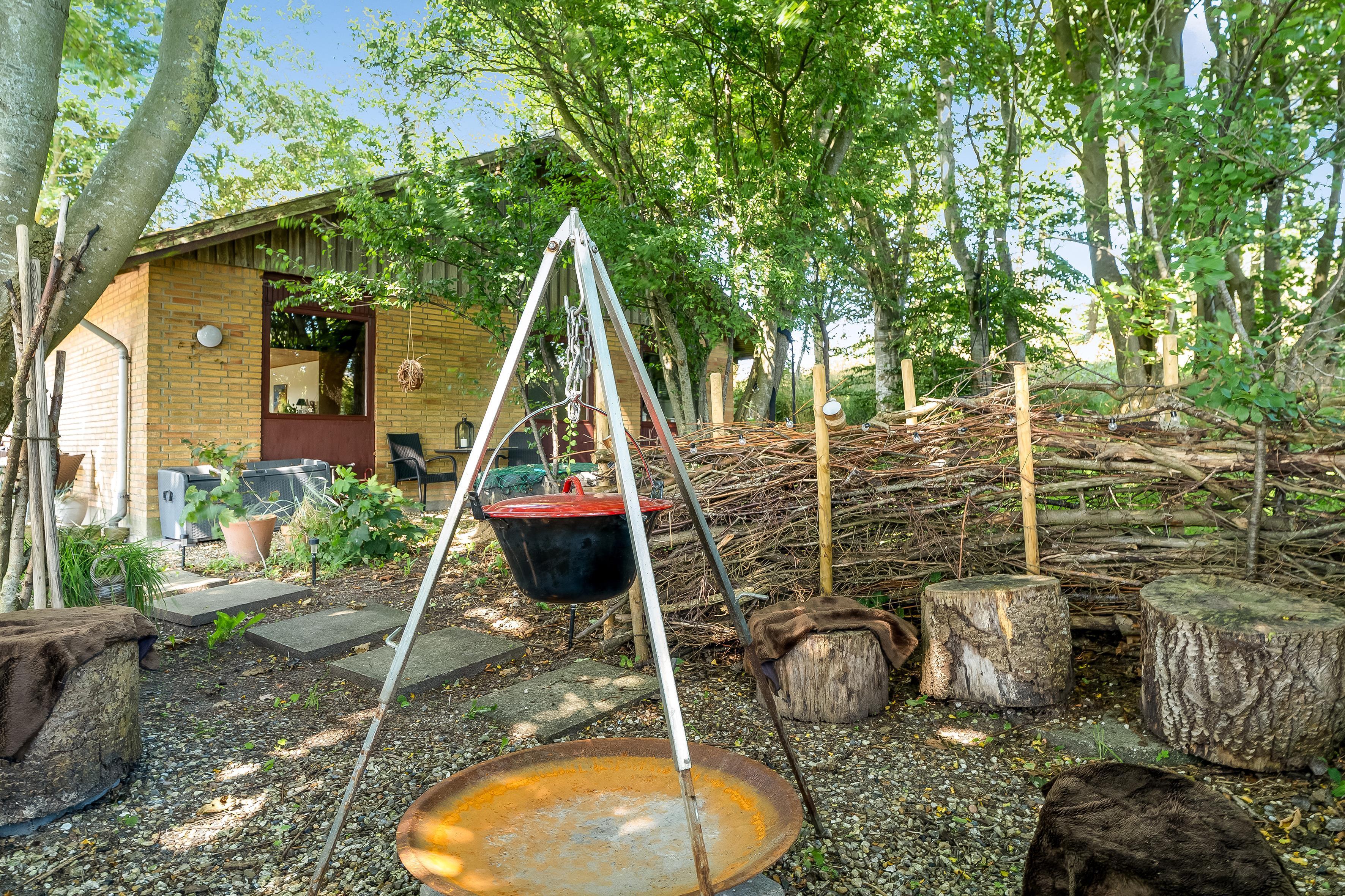 Udenfor er der en dejlig terrasse, hvor du kan nyde morgenkaffen eller grille om aftenen. Terrassen er omkranset af en dejlig naturgrund, der inkluderer et bålsted, gynger og en sandkasse til børnene - perfekt til sjov og leg. Det udendørs område er ideelt til at nyde den friske luft og den smukke natur.