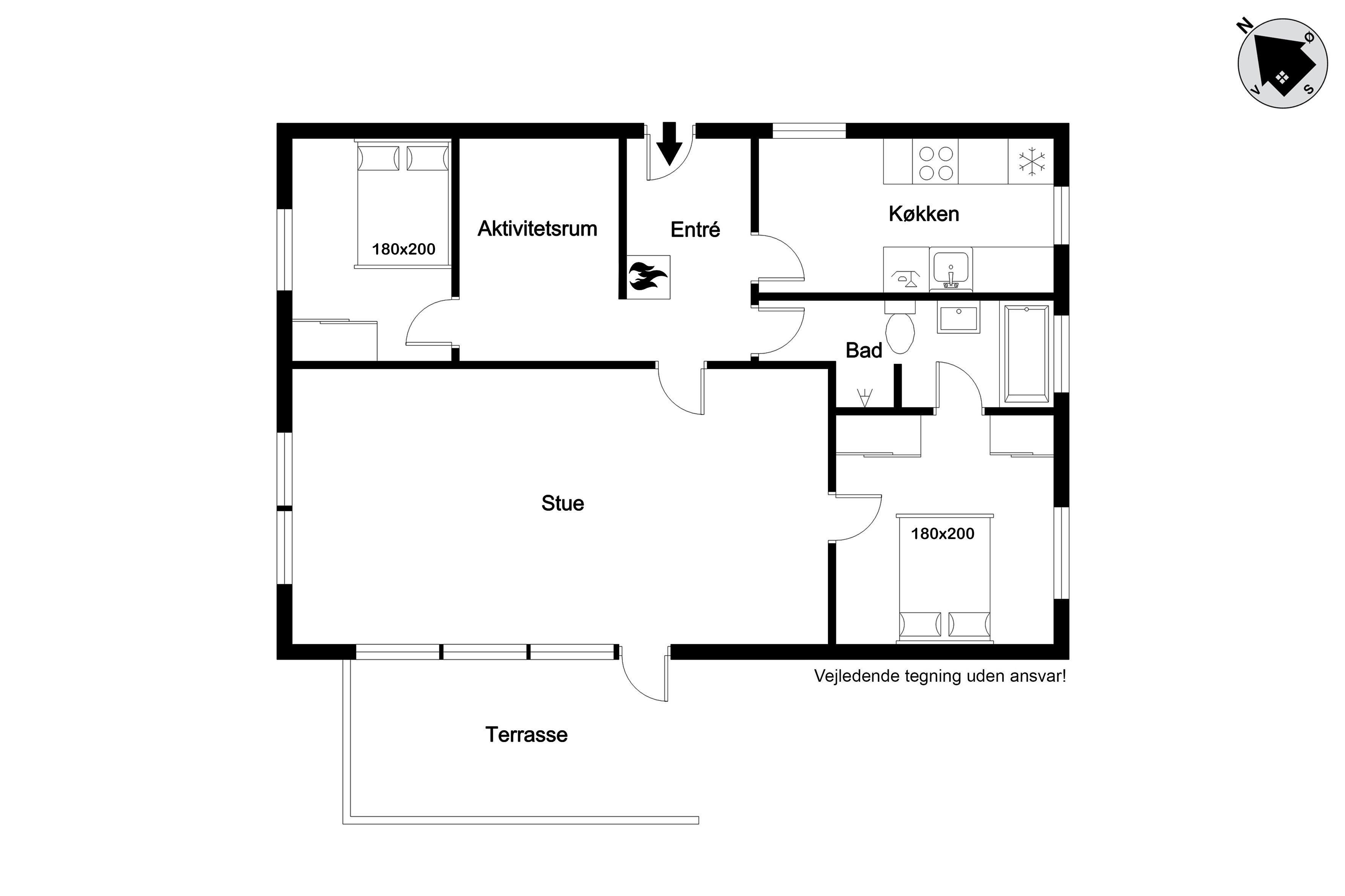 Det samlede husareal på 100 kvadratmeter er fint indrettet med to komfortable soveværelser. Det første soveværelse indeholder en dobbeltseng, mens det andet soveværelse er udstyret med to enkelt senge, hvilket giver fleksibilitet til at imødekomme forskellige behov. Huset er perfekt til en børnefamilie og tilbyder både barnestol og barneseng, så de små kan sove trygt og komfortabelt.