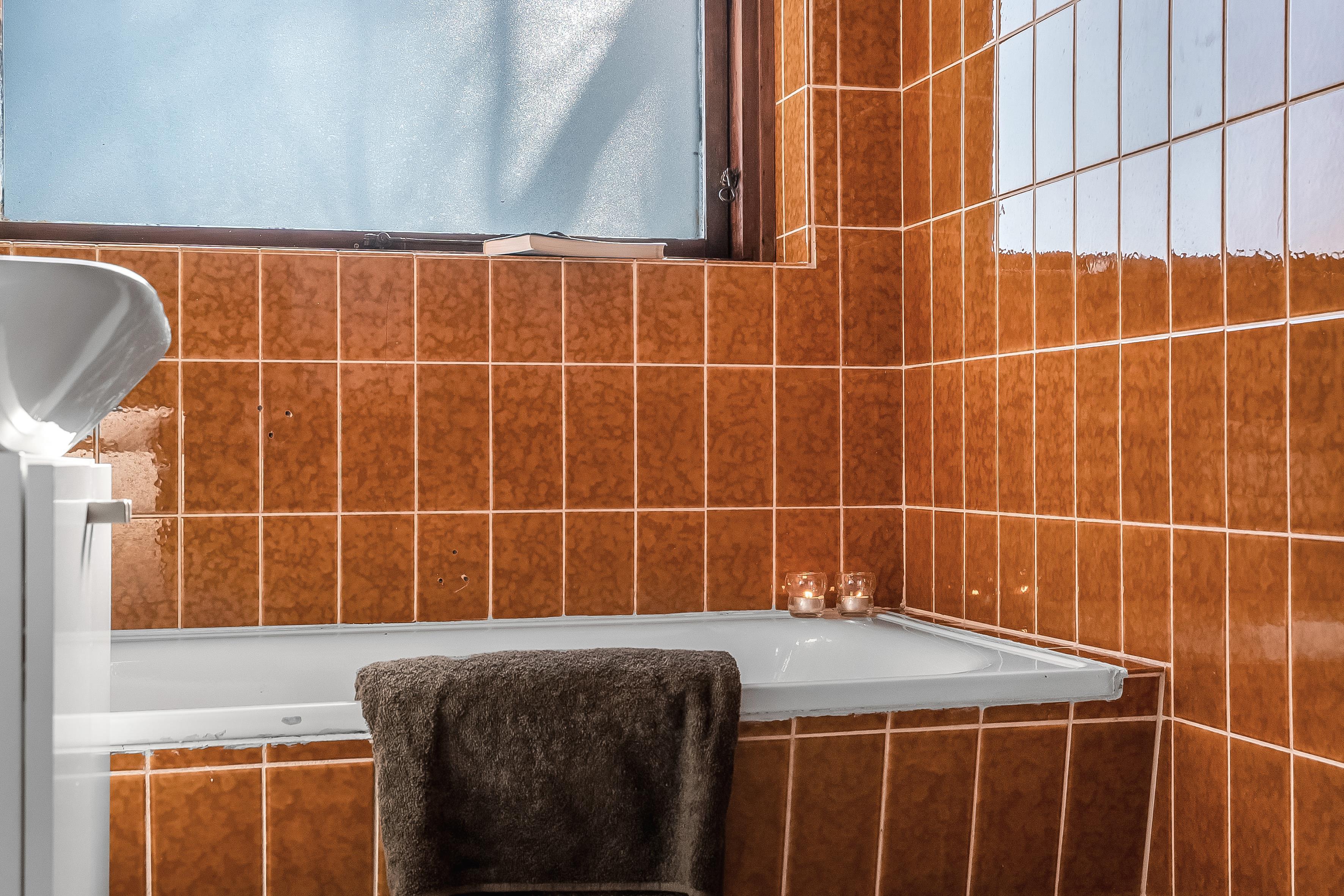 Sommerhusets badeværelse er med toilet, bruser og badekar, samt gulvvarme, hvilket sikrer en behagelig temperatur året rundt.