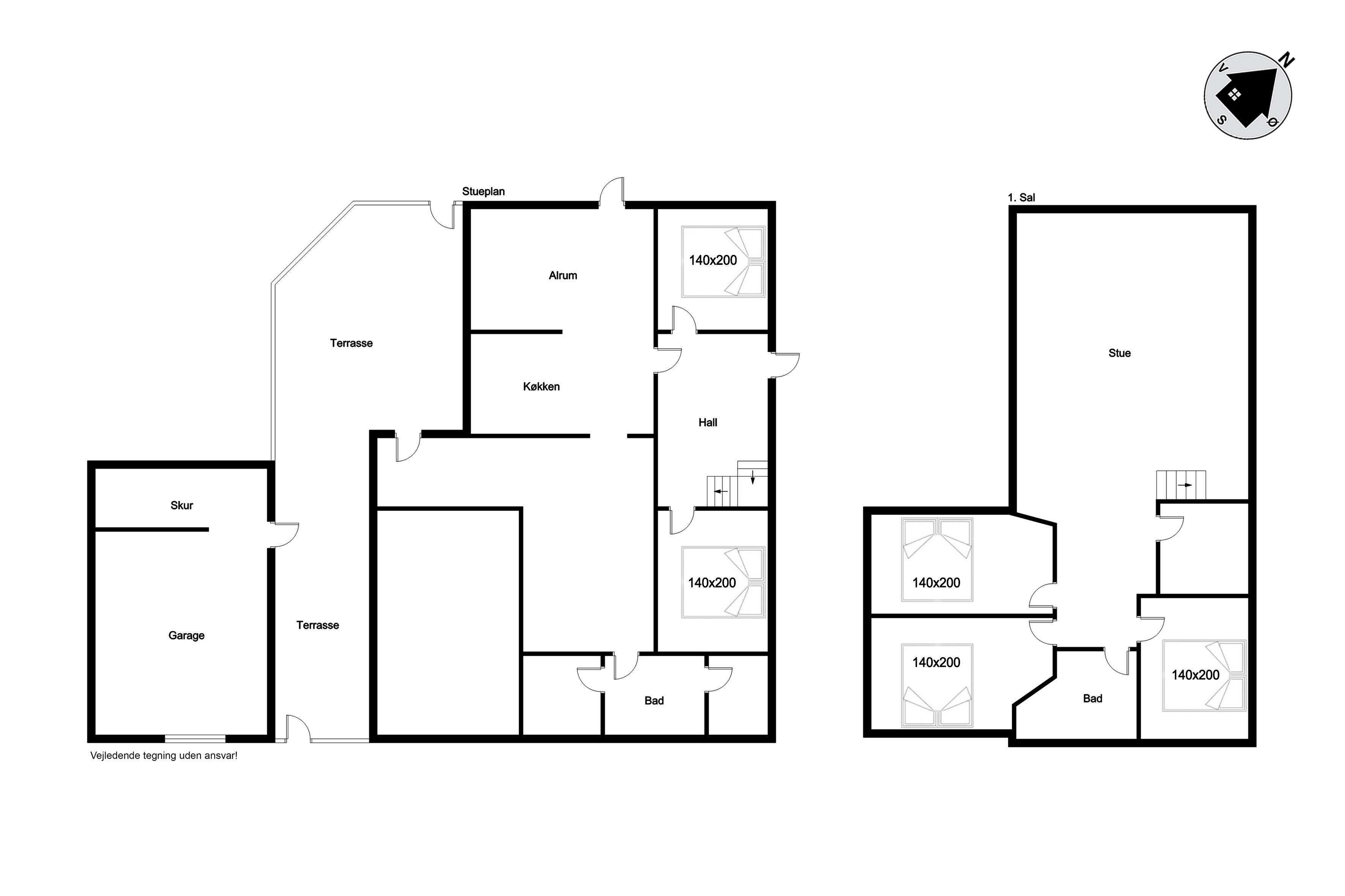 Der er fem komfortable soveværelser med dobbeltsenge i feriehuset. Køkkenet er fuldt udstyret med alt, hvad I har brug for, herunder køleskab med 60 liters fryser, keramiske kogeplader, varmluftovn, mikrobølgeovn og opvaskemaskine.